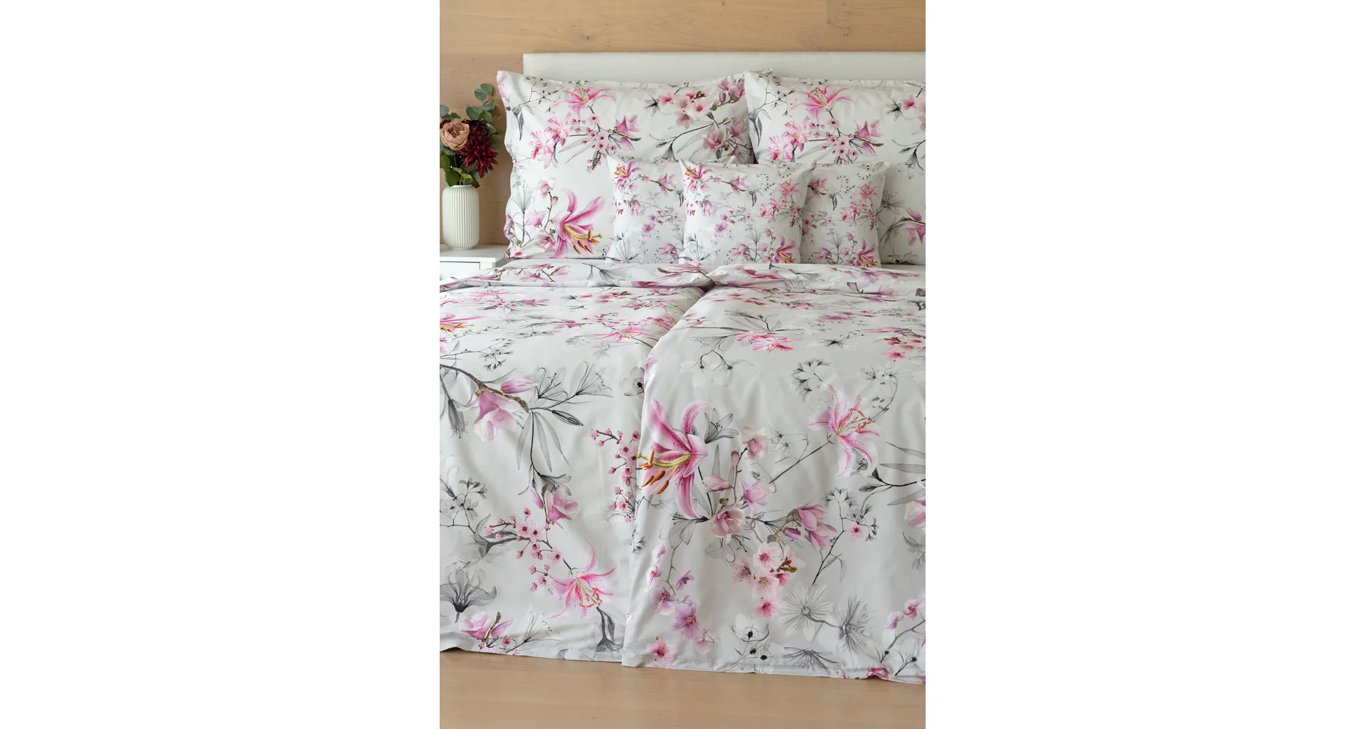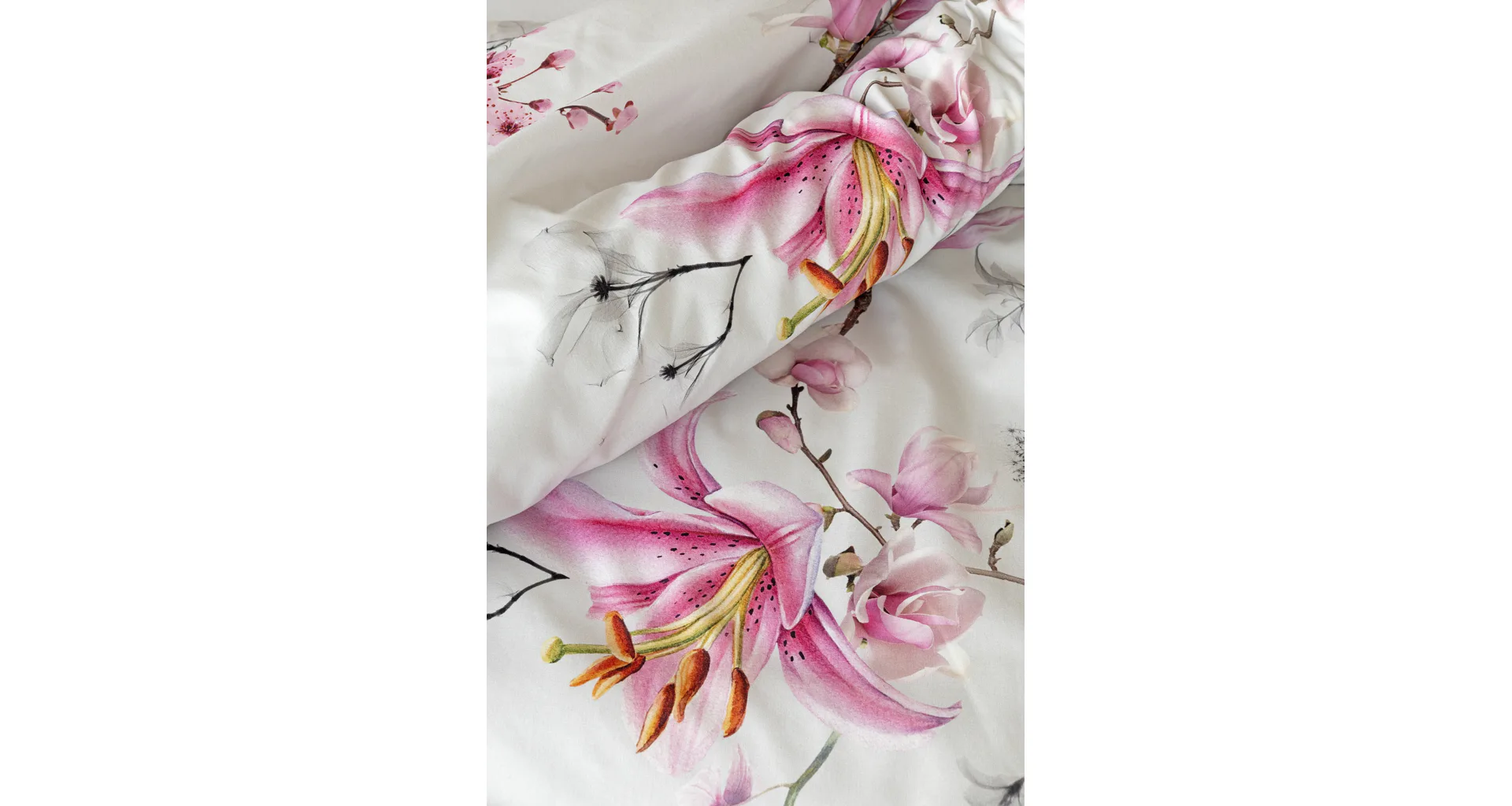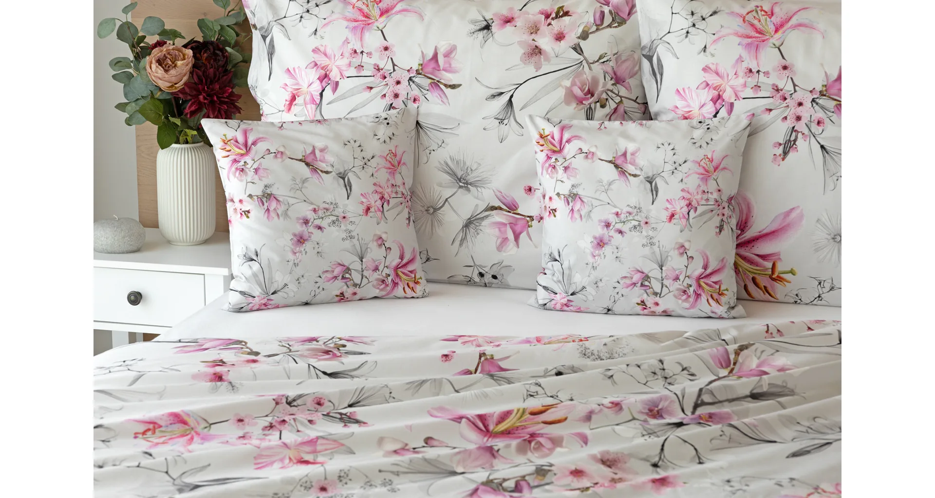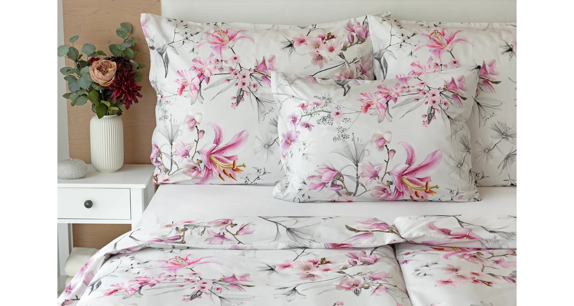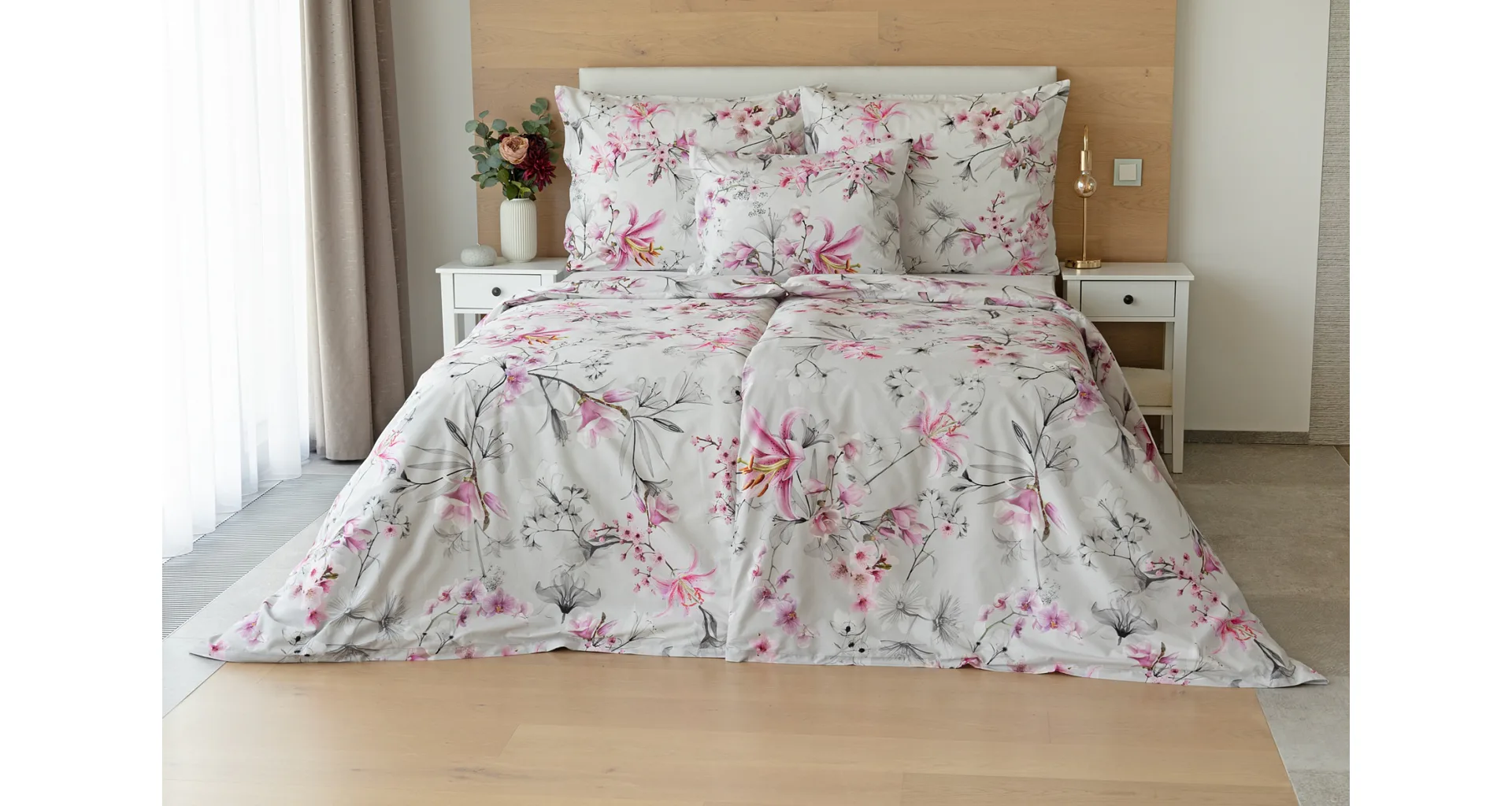 Obklopte se jemností a elegancí s bavlněným povlečením Elisse. Okouzlující vzor kombinuje květy exotických orchidejí a něžných lilií v růžovofialových tónech na světle šedém podkladu. Povlečení je vyrobeno ze 100% prvotřídní bavlny a přináší nejen estetickou hodnotu, ale i výjimečný komfort.
