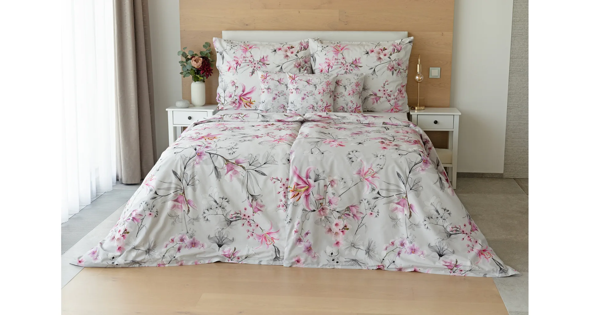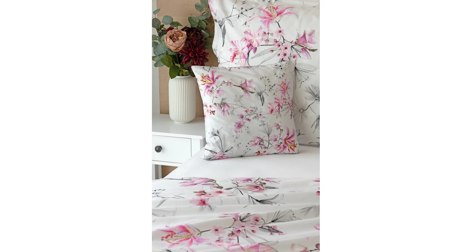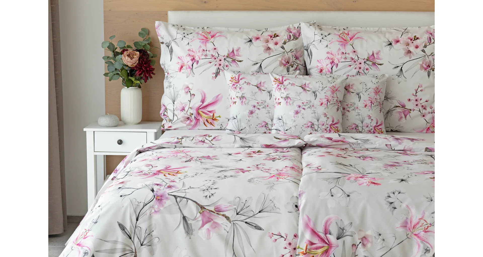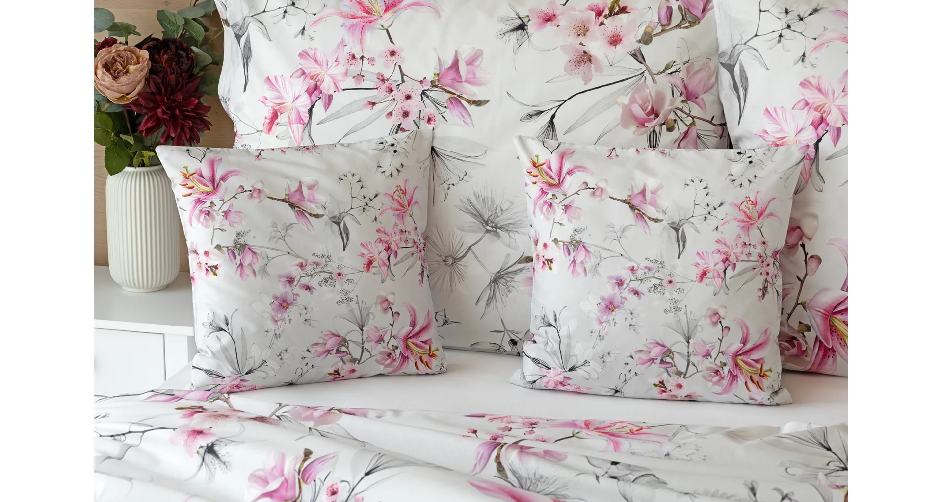 Obklopte se jemností a elegancí s bavlněným povlečením Elisse. Okouzlující vzor kombinuje květy exotických orchidejí a něžných lilií v růžovofialových tónech na světle šedém podkladu. Povlečení je vyrobeno ze 100% prvotřídní bavlny a přináší nejen estetickou hodnotu, ale i výjimečný komfort.