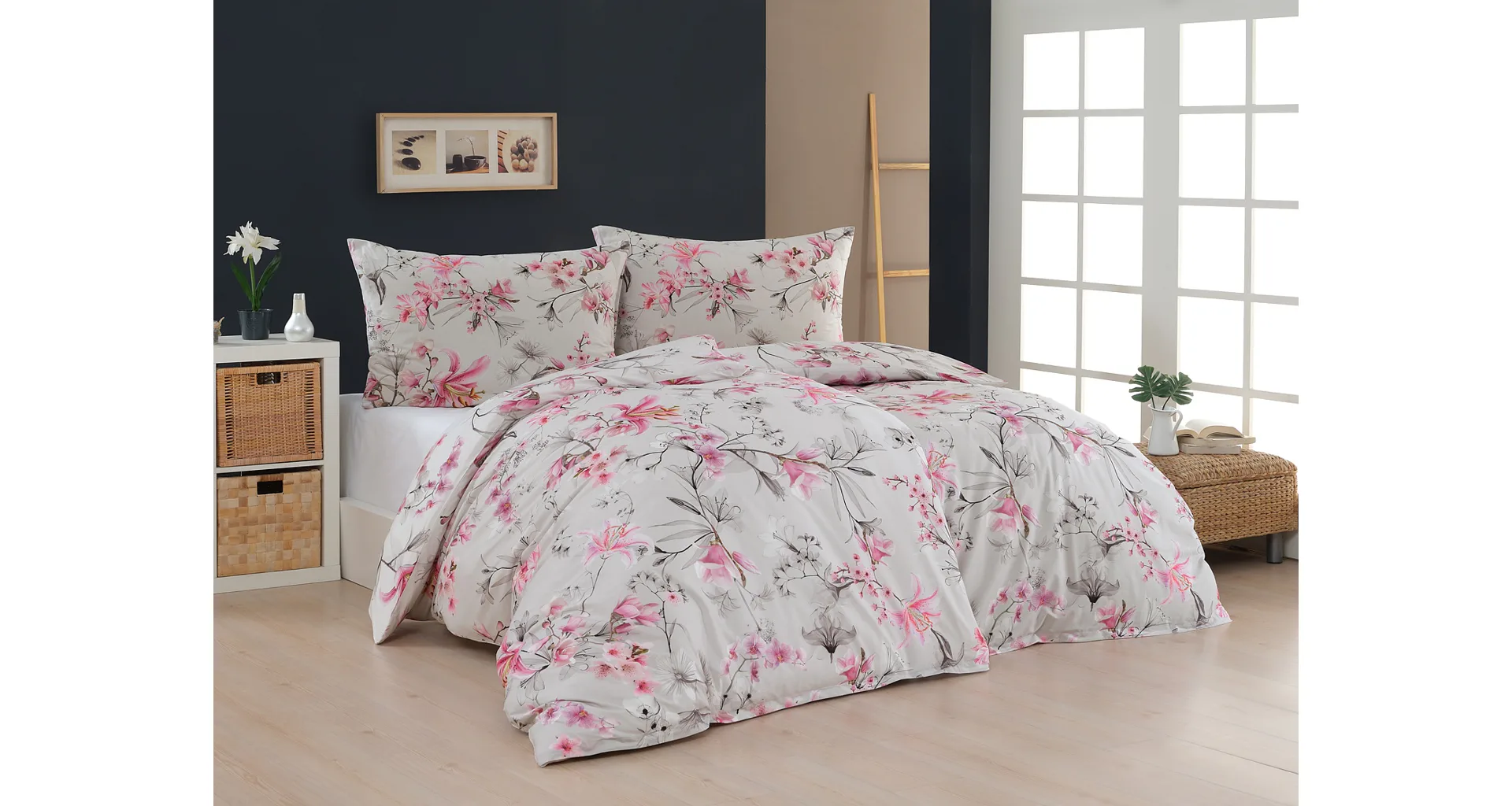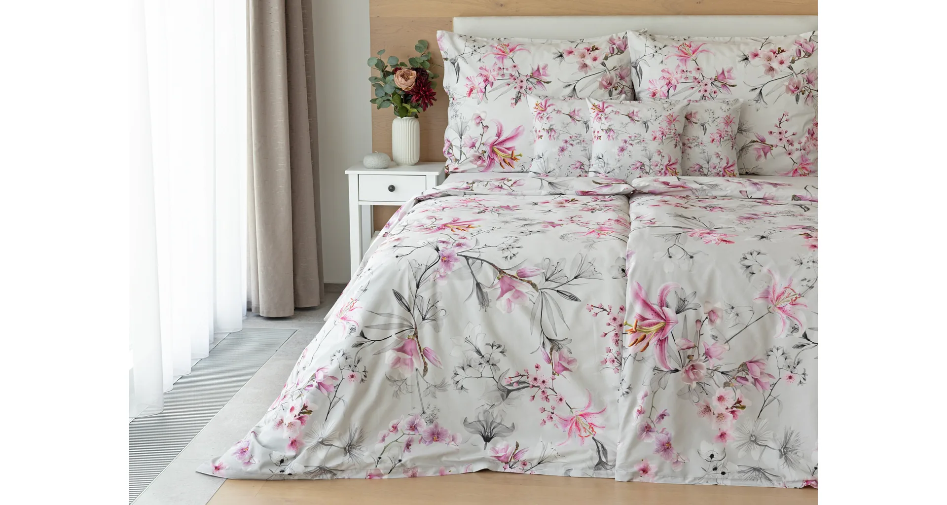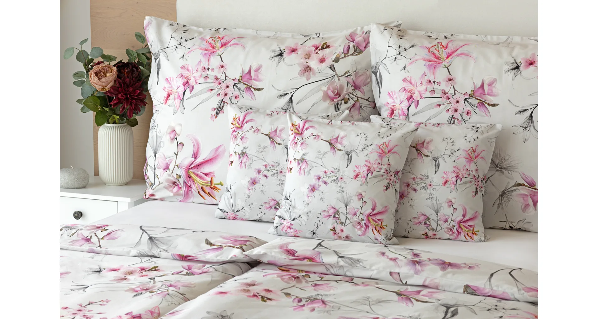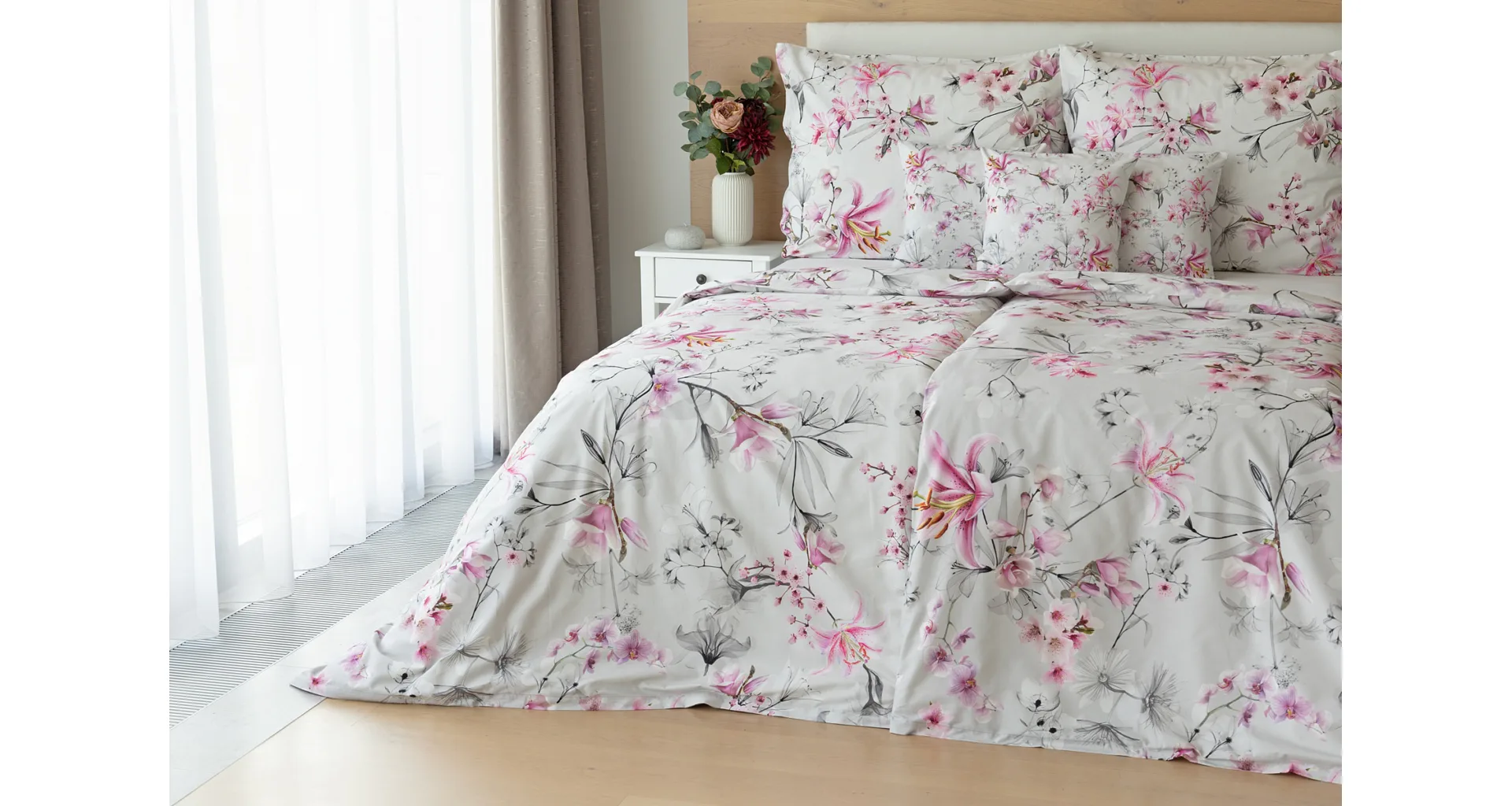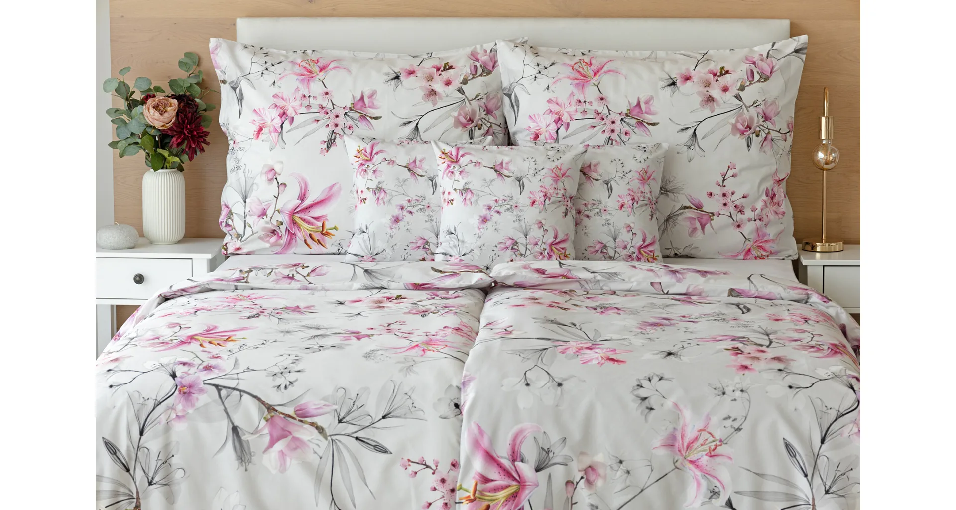 Obklopte se jemností a elegancí s bavlněným povlečením Elisse. Okouzlující vzor kombinuje květy exotických orchidejí a něžných lilií v růžovofialových tónech na světle šedém podkladu. Povlečení je vyrobeno ze 100% prvotřídní bavlny a přináší nejen estetickou hodnotu, ale i výjimečný komfort.