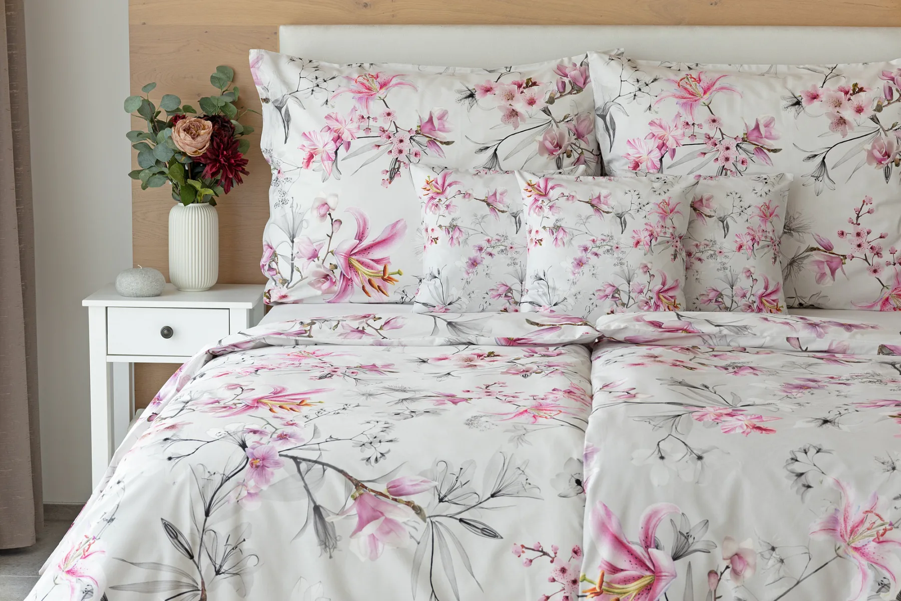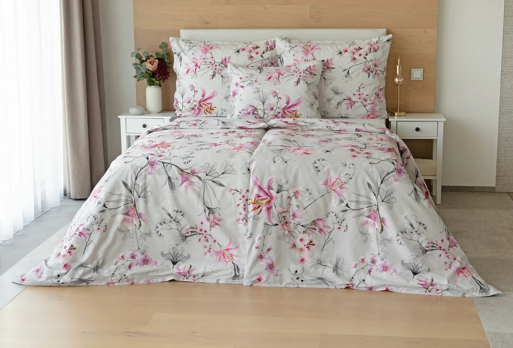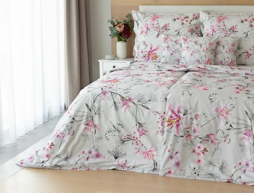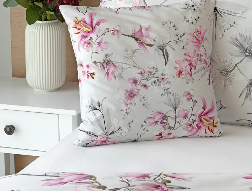 Obklopte se jemností a elegancí s bavlněným povlečením Elisse. Okouzlující vzor kombinuje květy exotických orchidejí a něžných lilií v růžovofialových tónech na světle šedém podkladu. Povlečení je vyrobeno ze 100% prvotřídní bavlny a přináší nejen estetickou hodnotu, ale i výjimečný komfort.