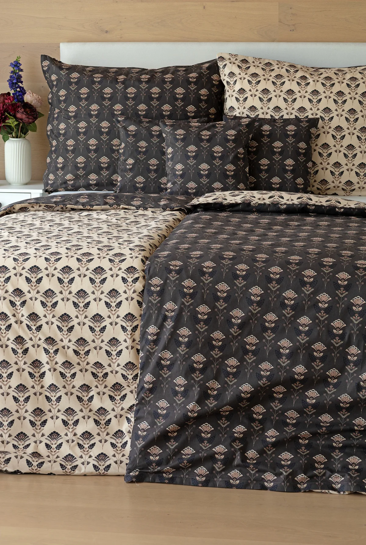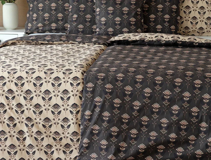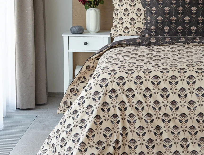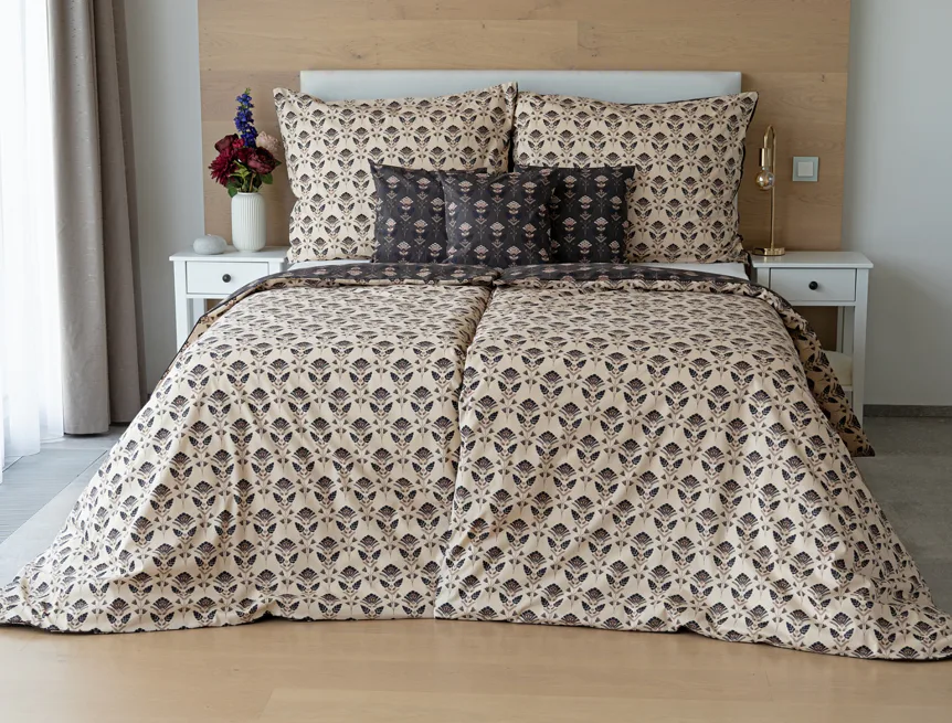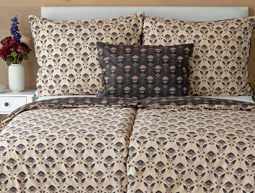 Nalaďte se na podzimní atmosféru s hřejivými barvami a vychutnejte si hravé stlaní s ložním povlečením Ellinor. Oblíbené oboustranné provedení vám umožní experimentovat a vaše ložice může být každý den originální. Elegantní vějířový vzor vyniká z jedné strany na béžovém podkladu, zadní strana je laděná do tlumeného tmavě hnědého tónu.