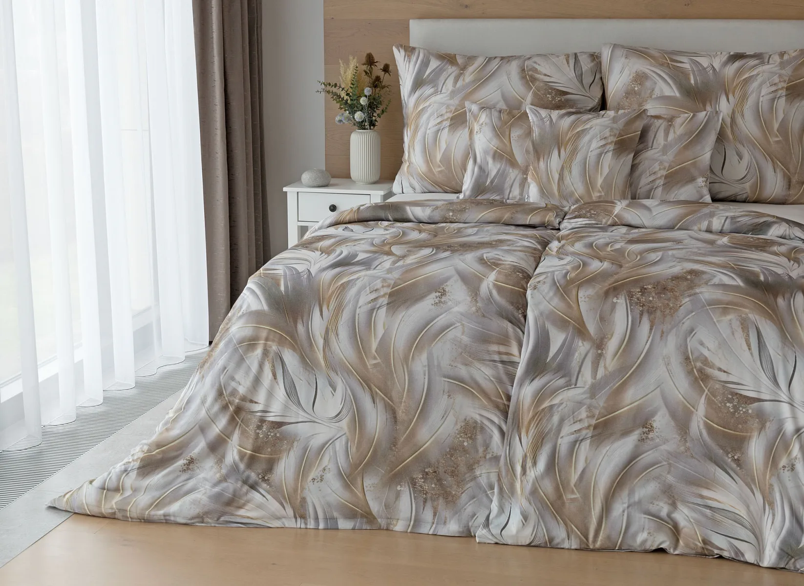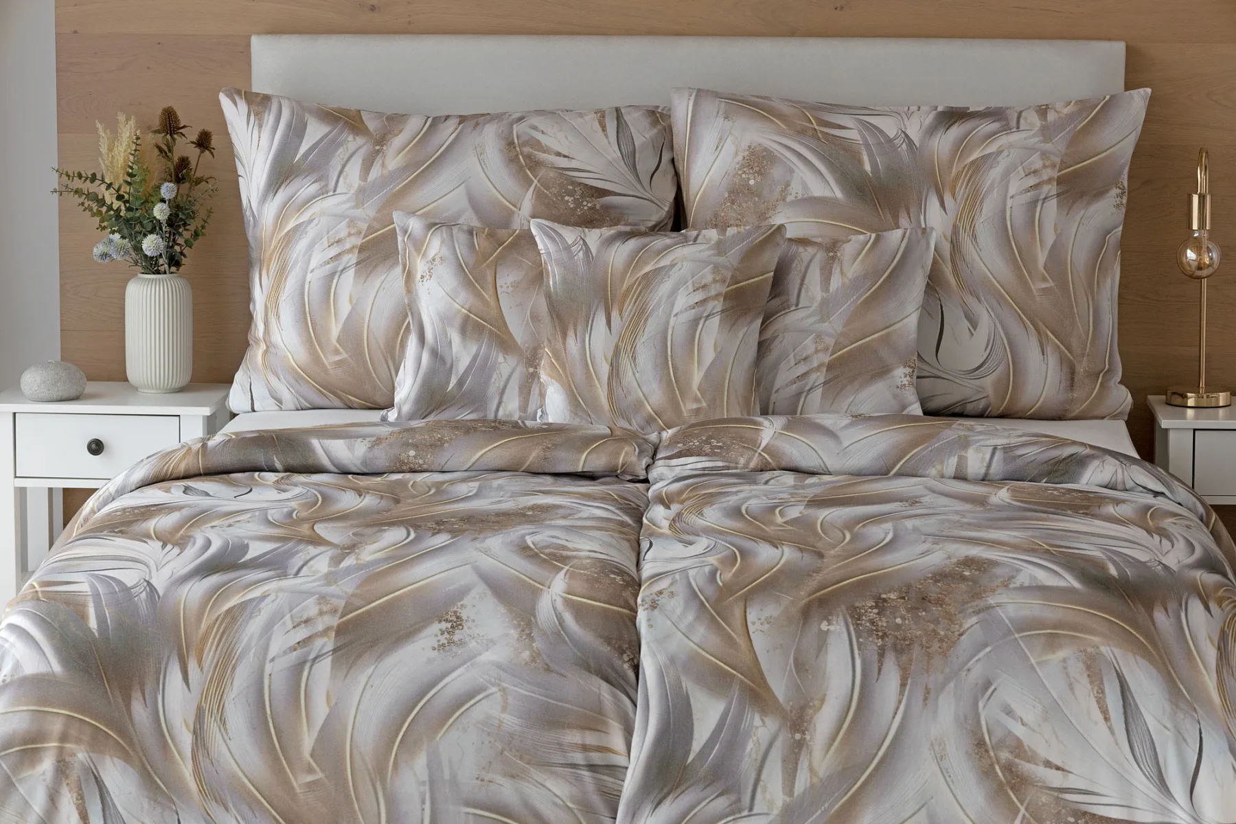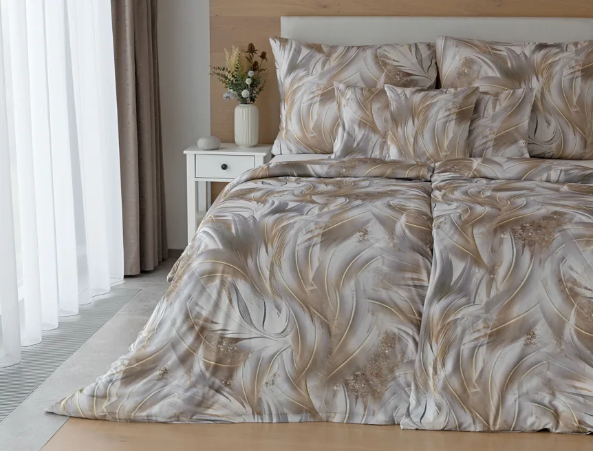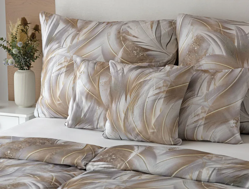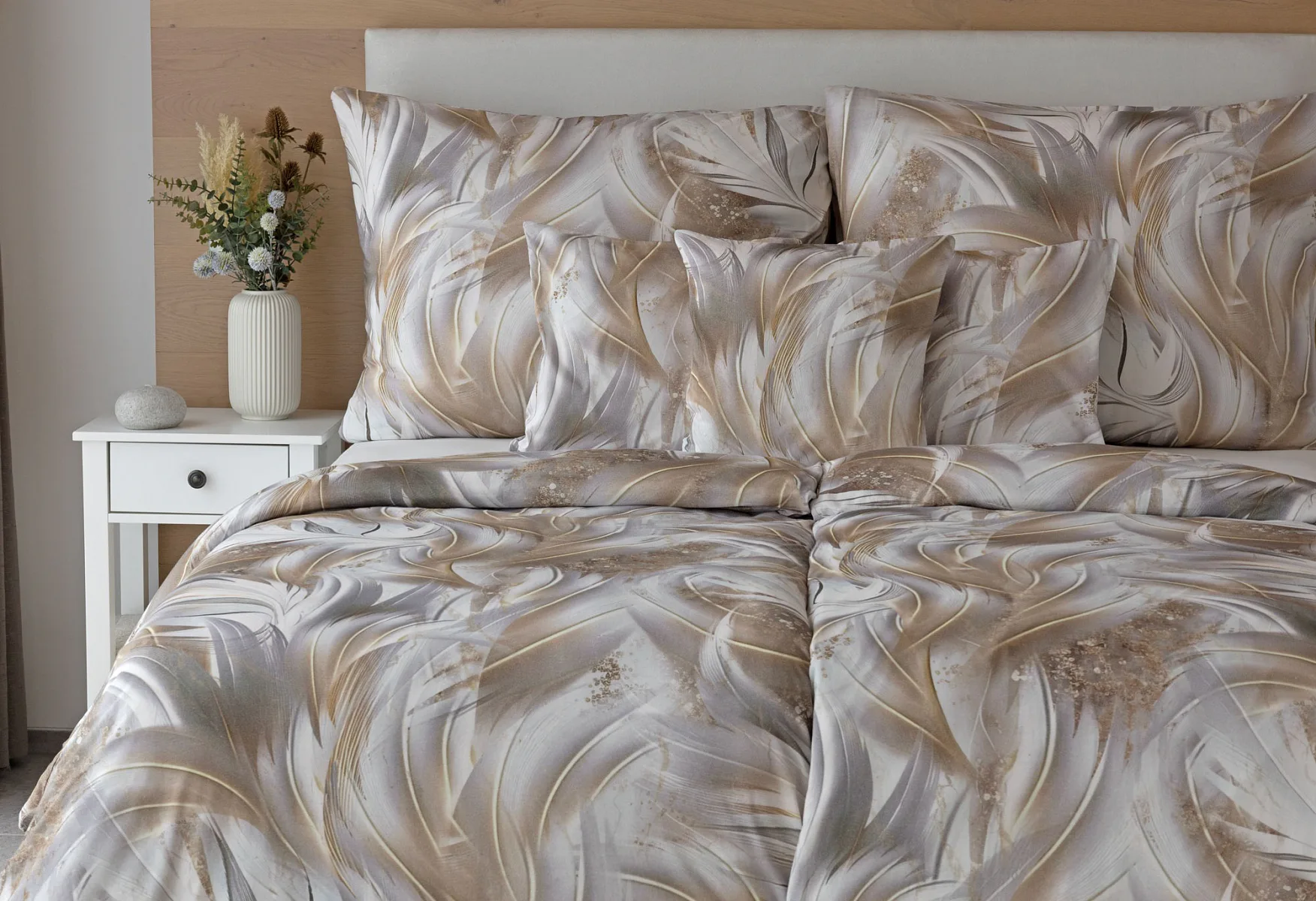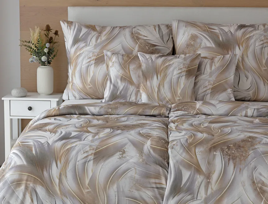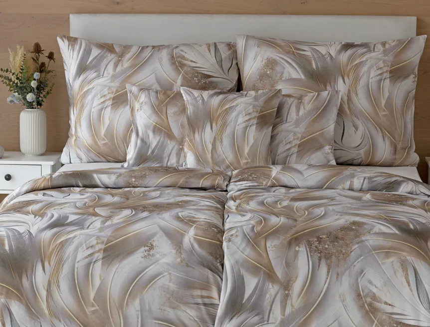 Pro novou kolekci ložního povlečení Mako jersey jsme pečlivě vybírali motivy, které tomuto pružnému materiálu sluší. Vzor Ember s okouzlujícím peříčkovým motivem v paletě šedých a zlatavých tónů vnese do vaší ložnice nádech elegance.