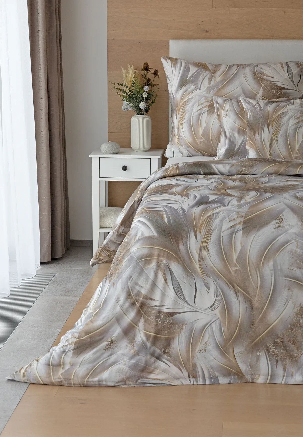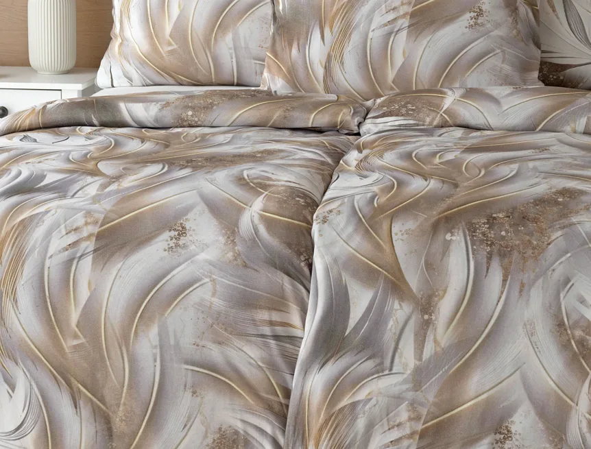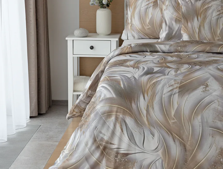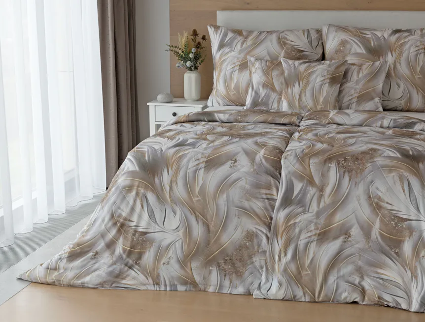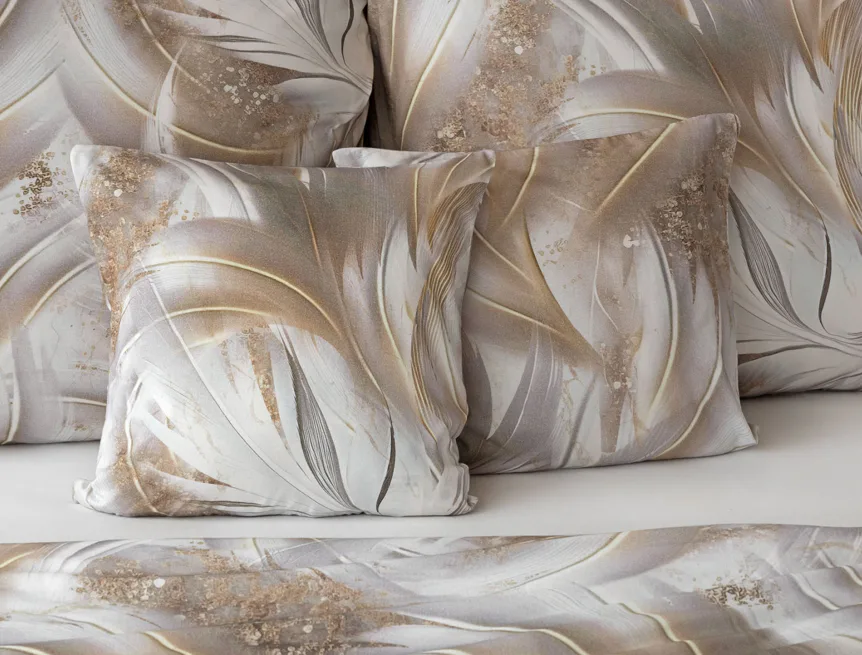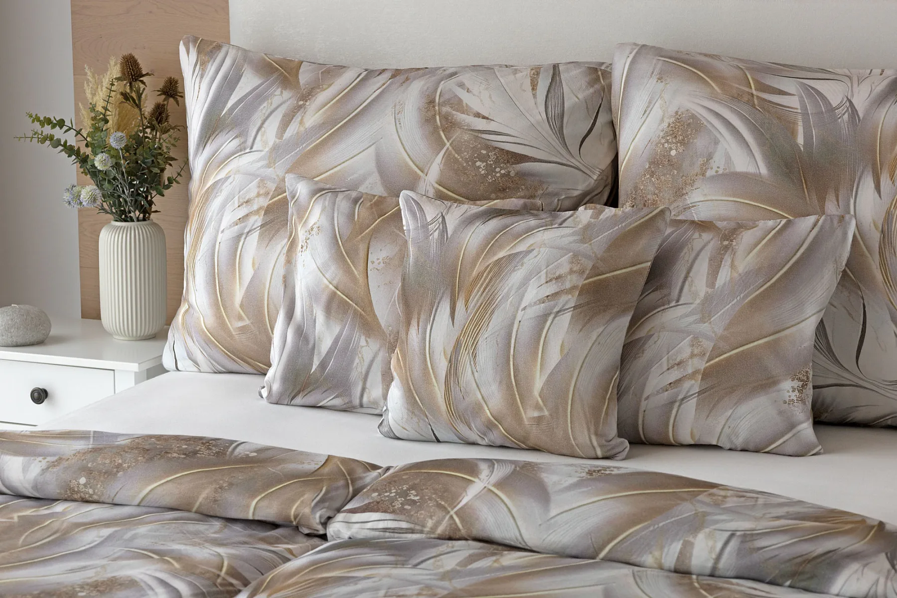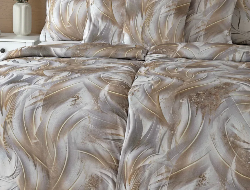 Pro novou kolekci ložního povlečení Mako jersey jsme pečlivě vybírali motivy, které tomuto pružnému materiálu sluší. Vzor Ember s okouzlujícím peříčkovým motivem v paletě šedých a zlatavých tónů vnese do vaší ložnice nádech elegance.