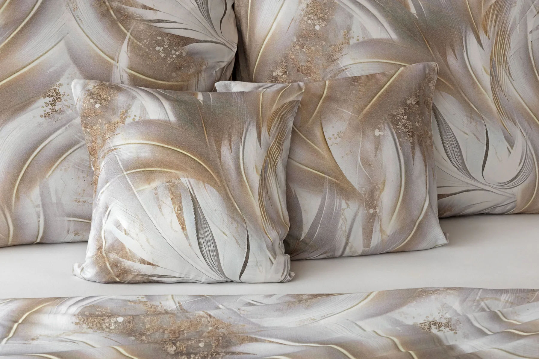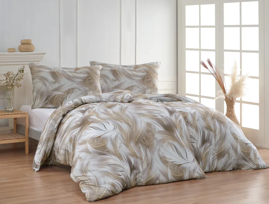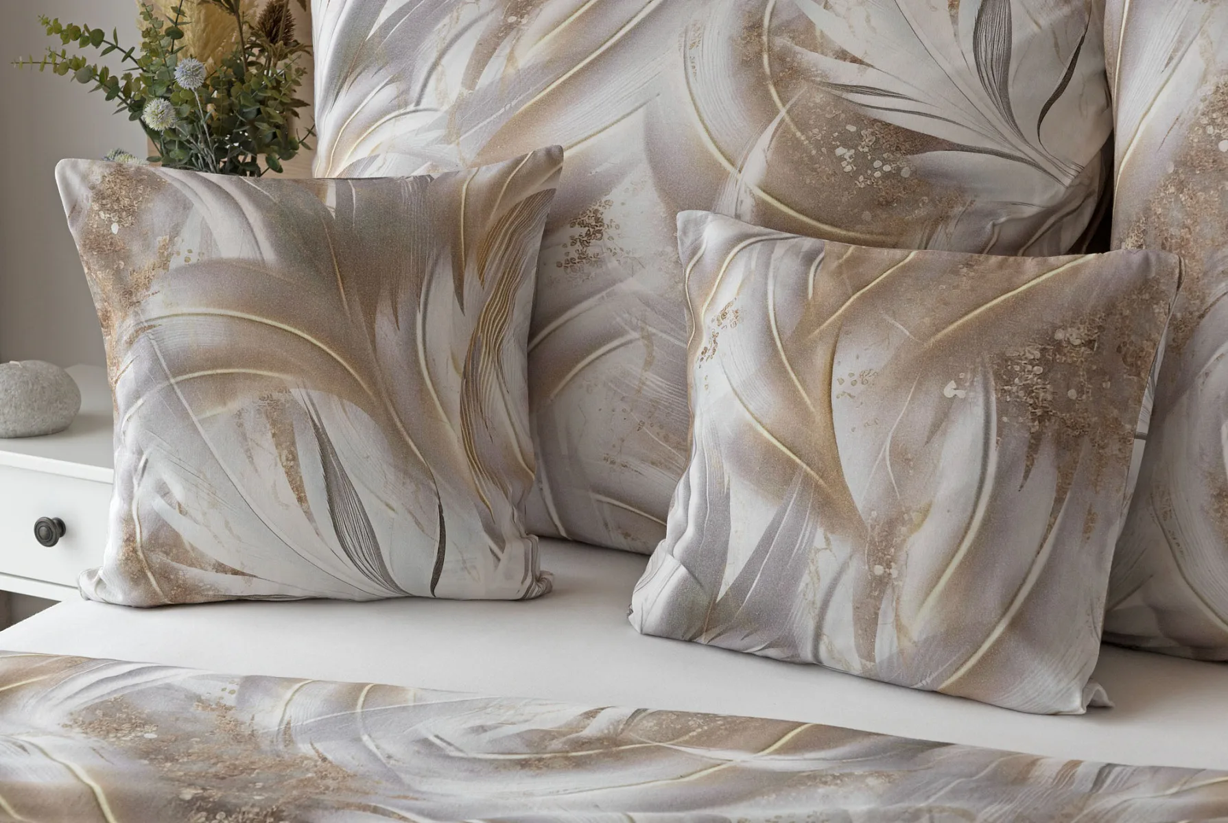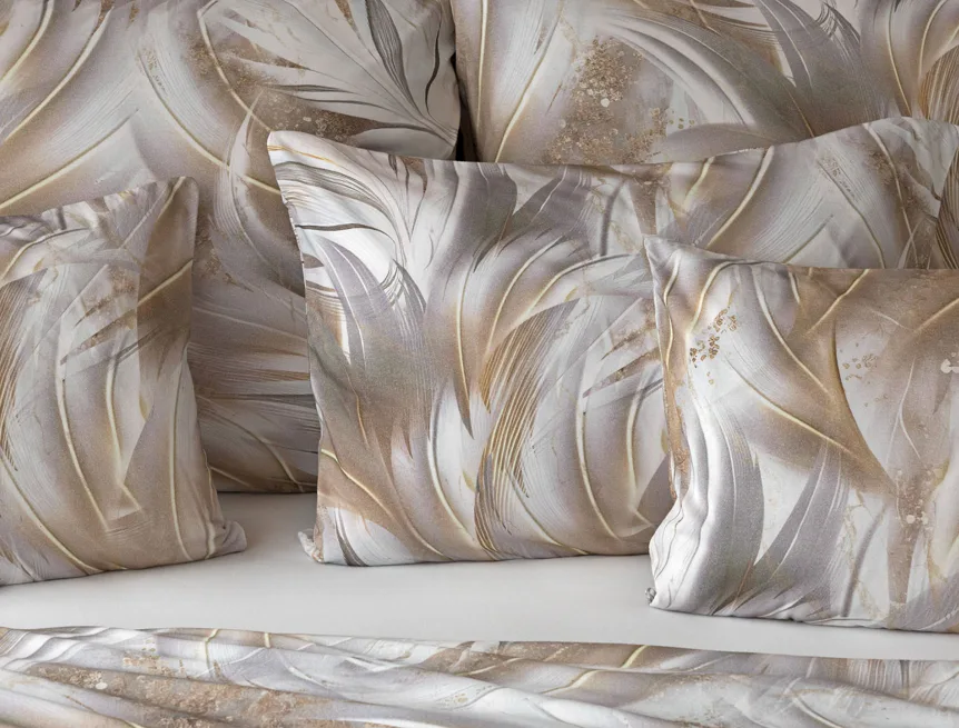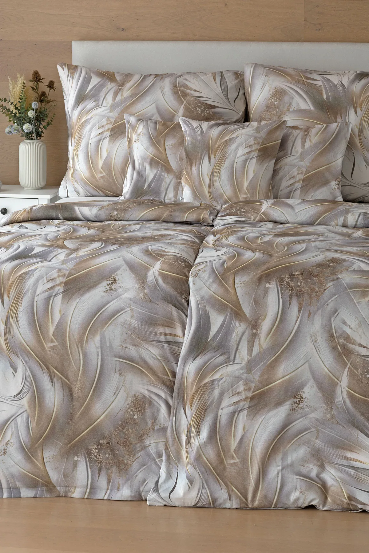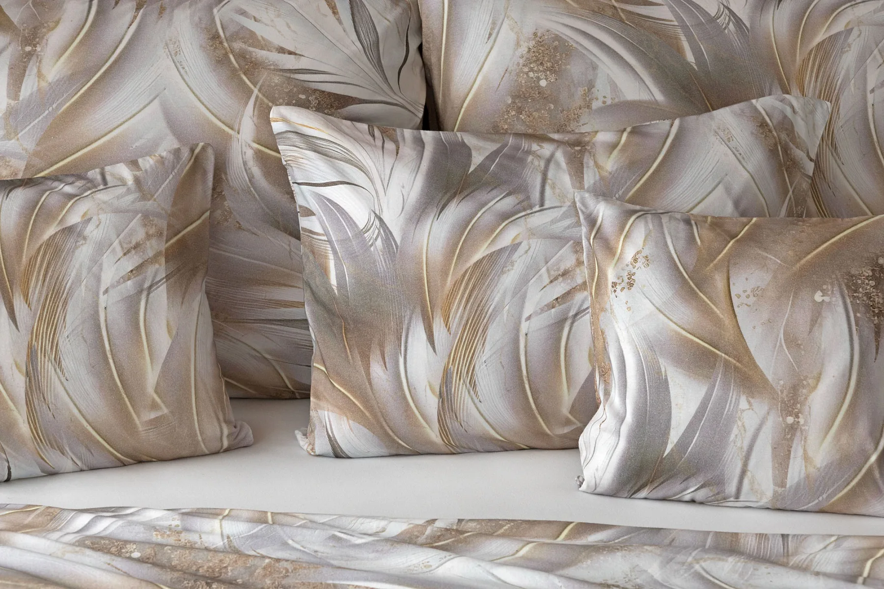 Pro novou kolekci ložního povlečení Mako jersey jsme pečlivě vybírali motivy, které tomuto pružnému materiálu sluší. Vzor Ember s okouzlujícím peříčkovým motivem v paletě šedých a zlatavých tónů vnese do vaší ložnice nádech elegance.