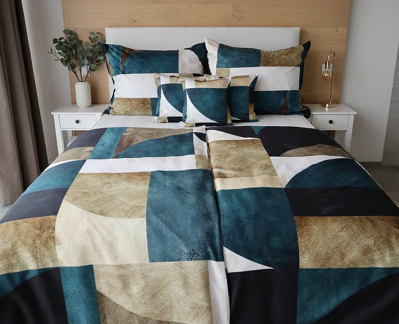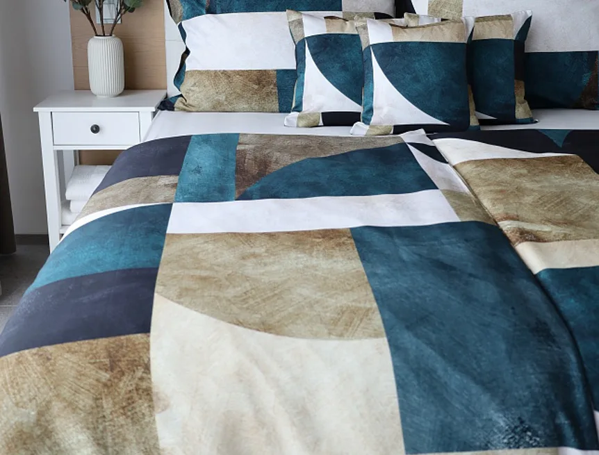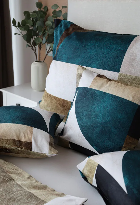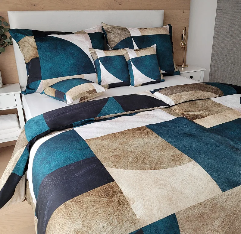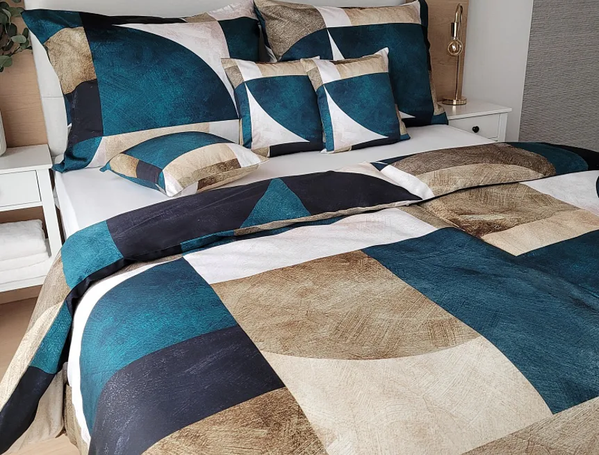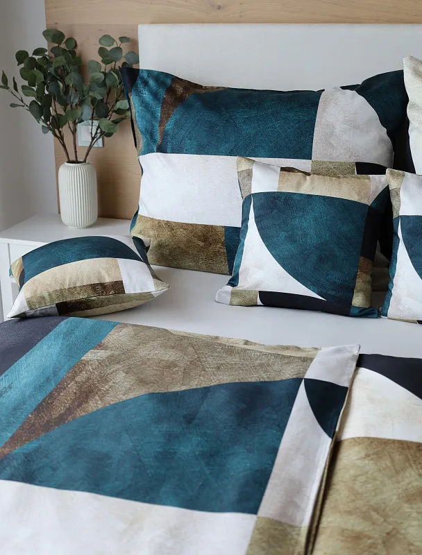 Potřebujete vyladit moderní ložnici k dokonalosti? Vsaďte na ložní povlečení Enzo. Abstraktní geometrický vzor kombinuje atraktivní odstíny zelenomodré, kávově hnědé a krémové barvy. Struktura potisku nese typické prvky umělecké malby, které jsou zachyceny v precizním detailu díky nejmodernější digitální technologii tisku