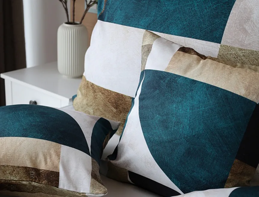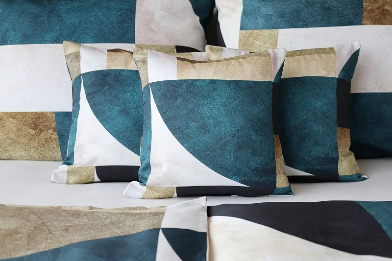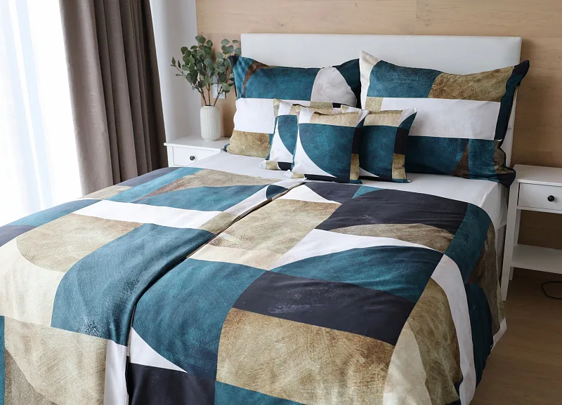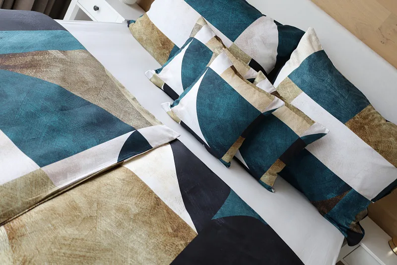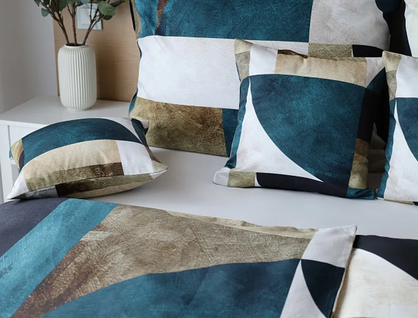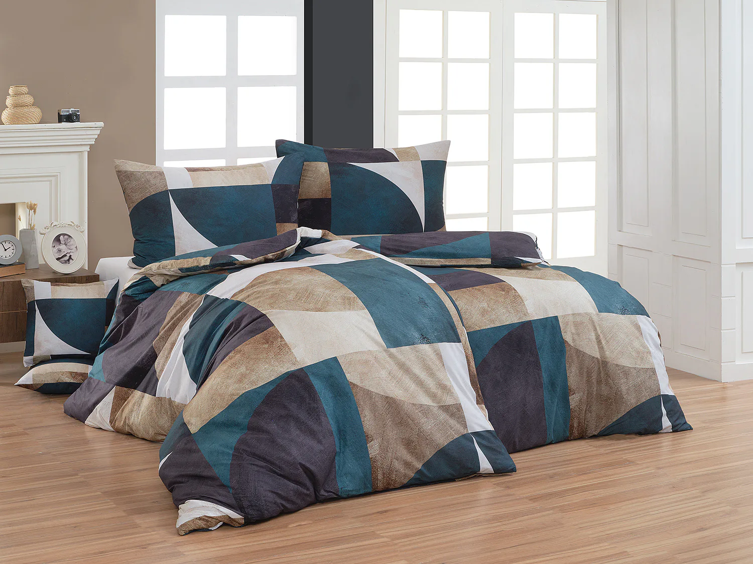 Potřebujete vyladit moderní ložnici k dokonalosti? Vsaďte na ložní povlečení Enzo. Abstraktní geometrický vzor kombinuje atraktivní odstíny zelenomodré, kávově hnědé a krémové barvy. Struktura potisku nese typické prvky umělecké malby, které jsou zachyceny v precizním detailu díky nejmodernější digitální technologii tisku