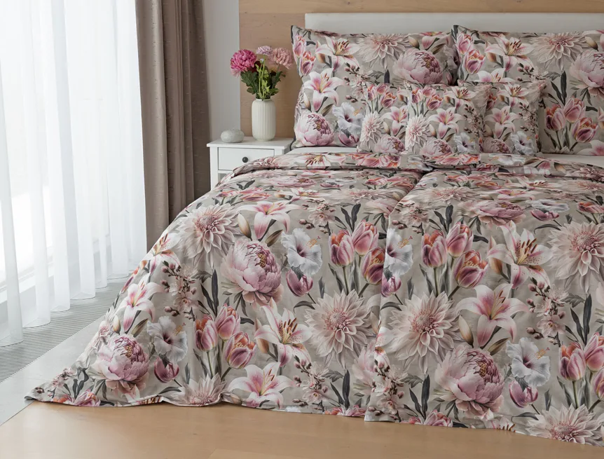 Květinovou symfonii rozehrává bavlněné povlečení Estel, se kterým vaše ložnice zazáří. Pestrobarevné květy na tlumeném světle fialovém podkladu vynikají v precizním detailu díky nejmodernější digitální tiskové technologii.