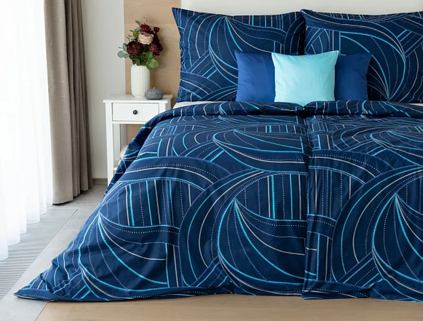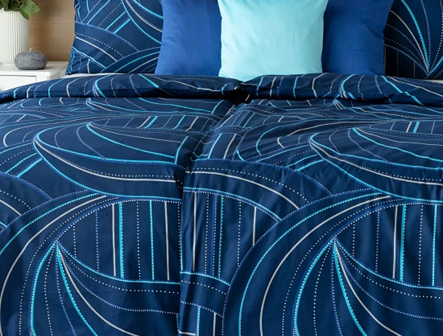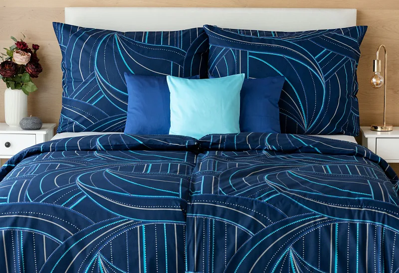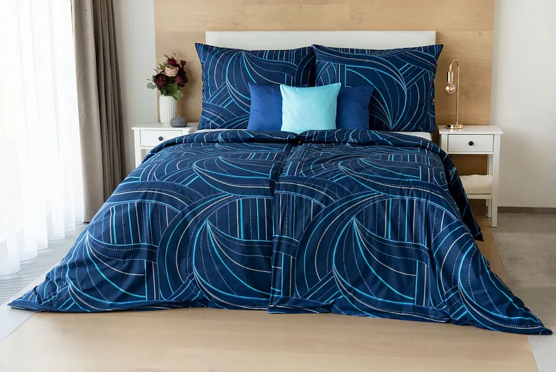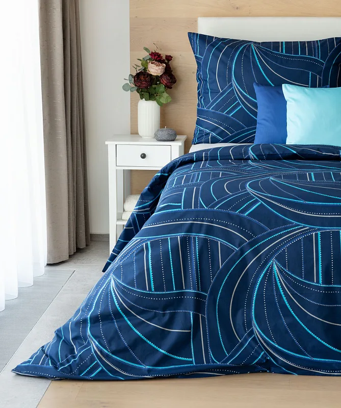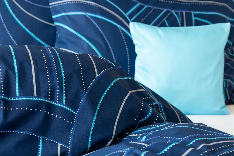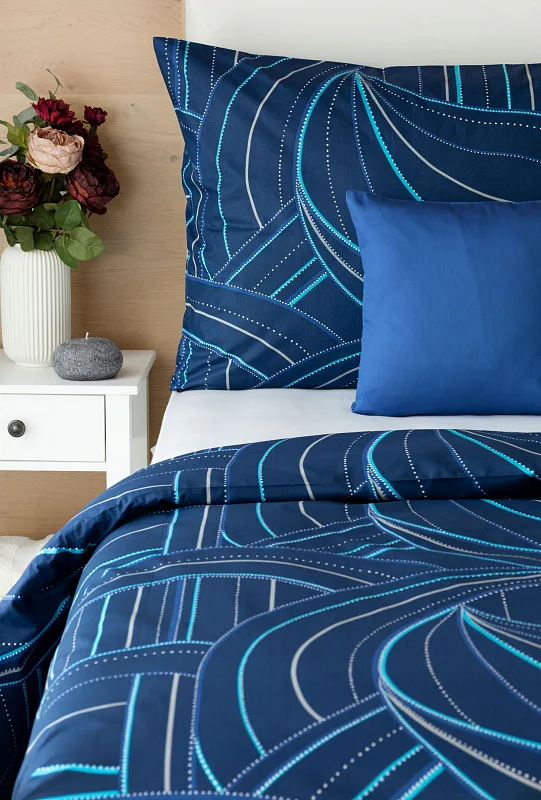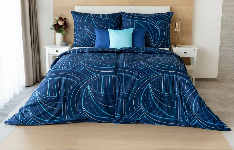 Bavlněné povlečení Ezio Blue s originálním geometrickým vzorem se stane ozdobou každého moderního interiéru. Podklad v tmavě modré barvě zdobí obrazce tvořené linkami v odstínech modré, tyrkysové a šedé. Plastičnost vzoru dokreslují jemné bílé tečky v konturách linek.