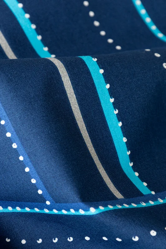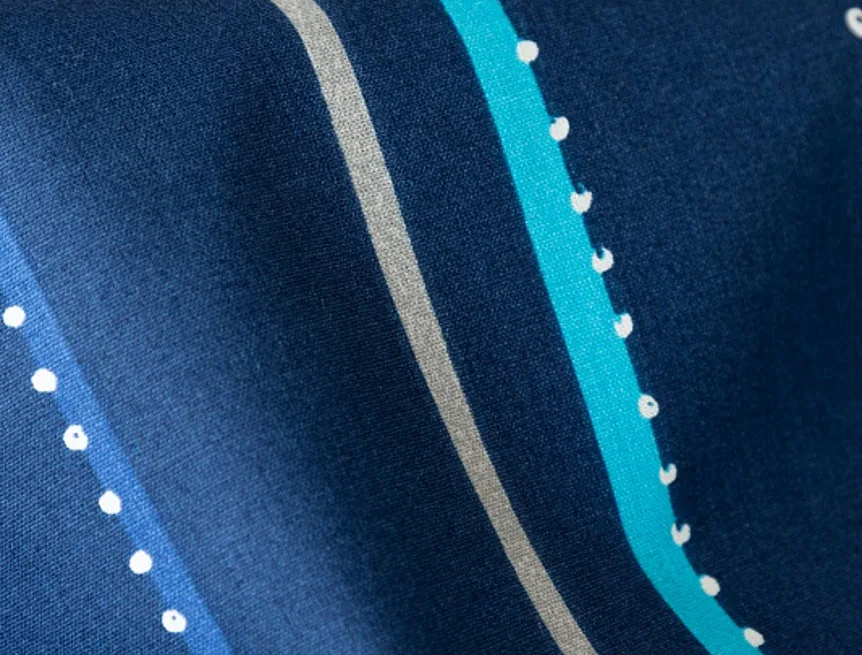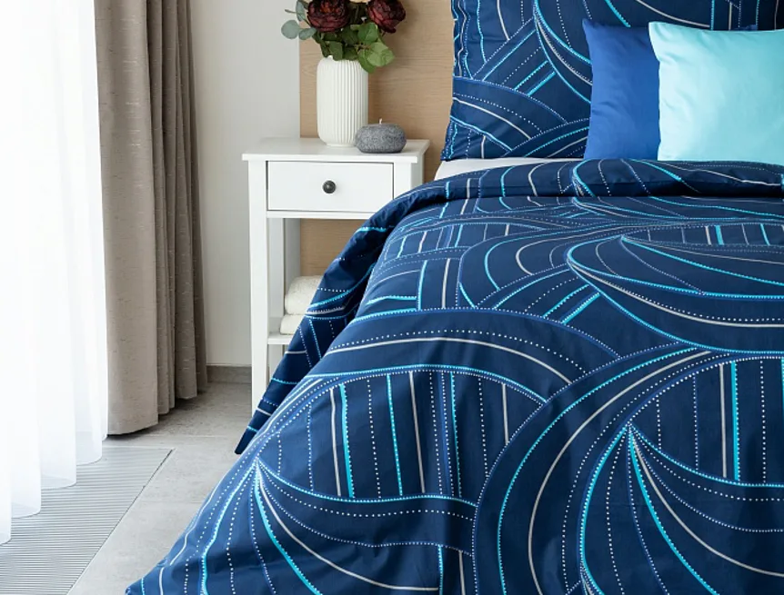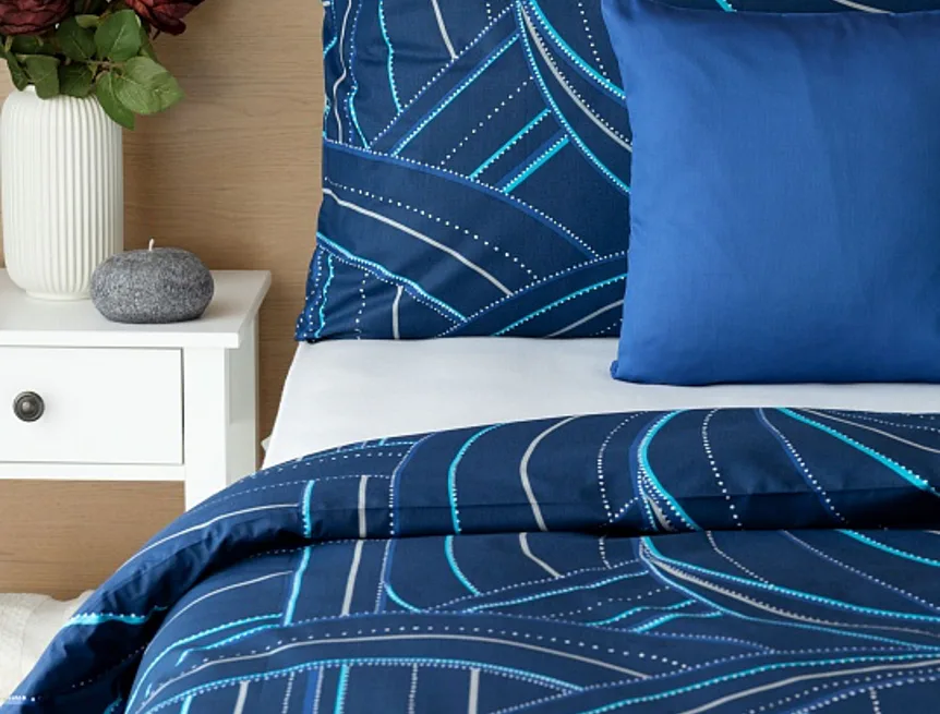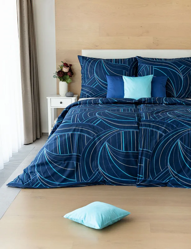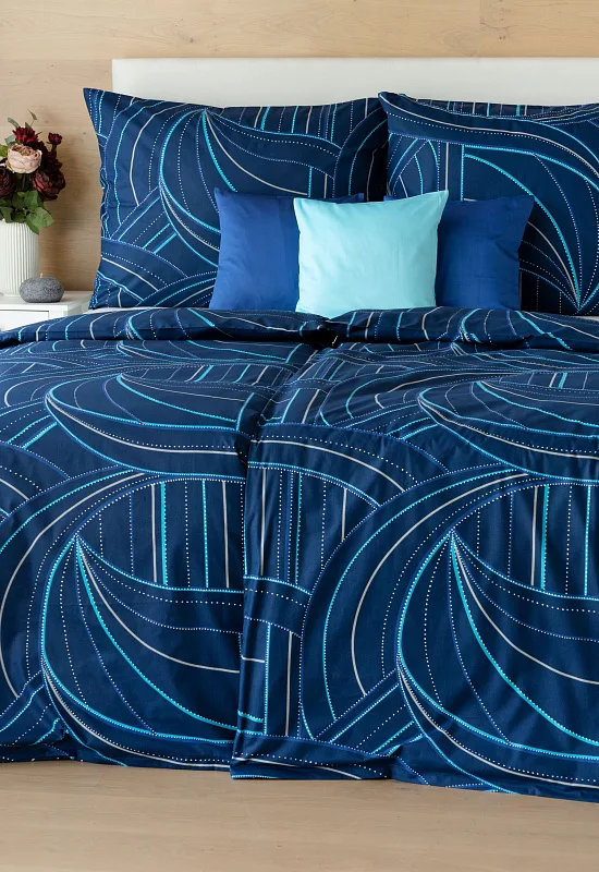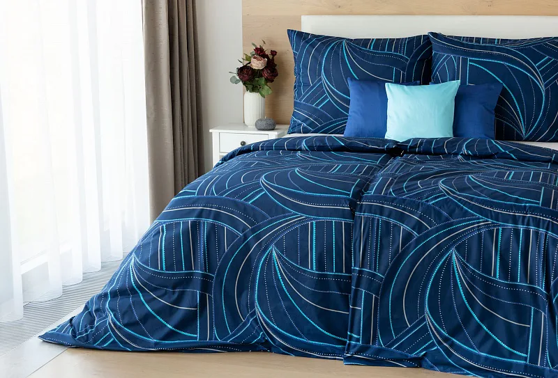 Bavlněné povlečení Ezio Blue s originálním geometrickým vzorem se stane ozdobou každého moderního interiéru. Podklad v tmavě modré barvě zdobí obrazce tvořené linkami v odstínech modré, tyrkysové a šedé. Plastičnost vzoru dokreslují jemné bílé tečky v konturách linek.