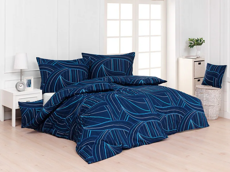 Bavlněné povlečení Ezio Blue s originálním geometrickým vzorem se stane ozdobou každého moderního interiéru. Podklad v tmavě modré barvě zdobí obrazce tvořené linkami v odstínech modré, tyrkysové a...