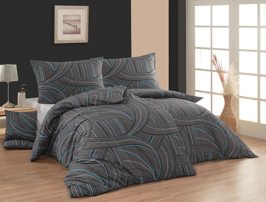Bavlněné povlečení Ezio Grey s originálním geometrickým vzorem se stane ozdobou každého moderního interiéru. Podklad v antracitově šedé barvě zdobí obrazce tvořené tyrkysovými, černými a světle šedými linkami. Plastičnost vzoru dokreslují jemné bílé tečky v konturách linek.