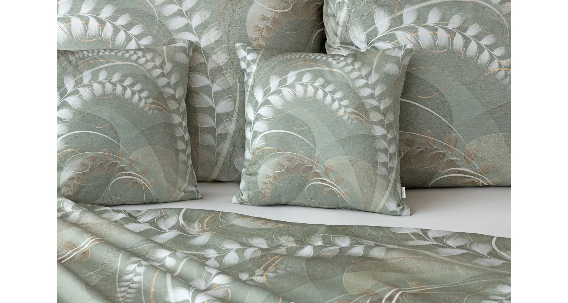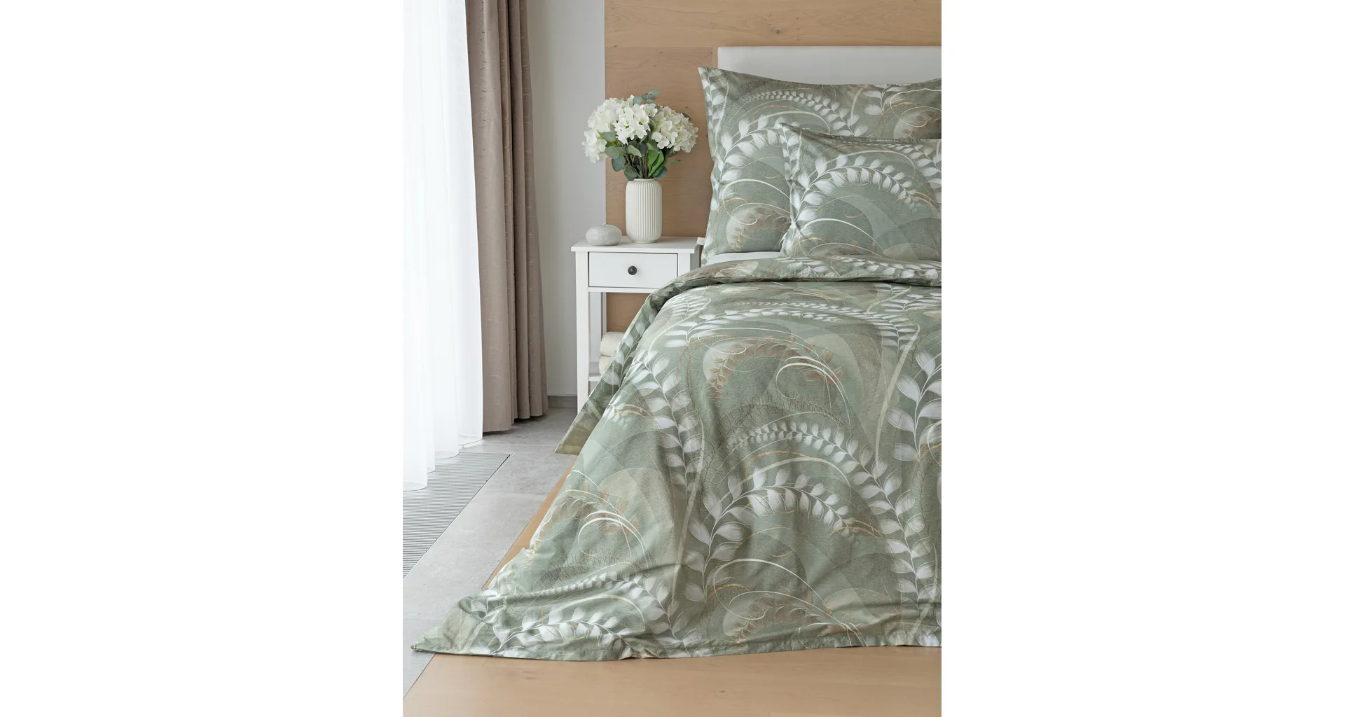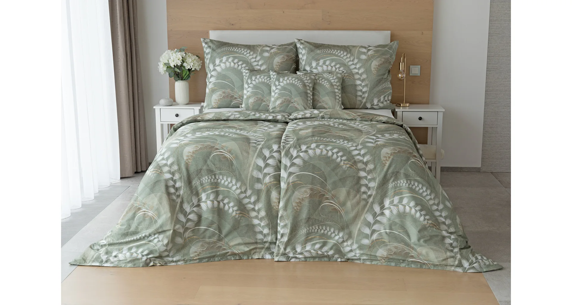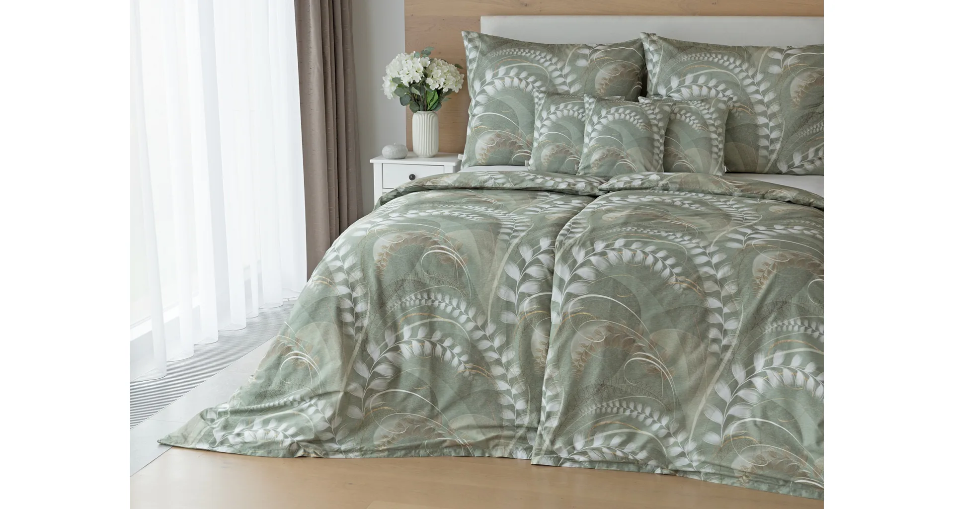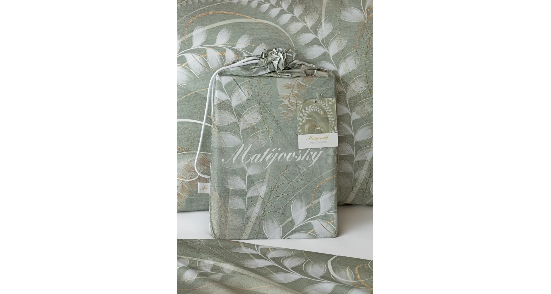 Vzor Ezra zdobí elegantní florální motiv v paletě krémových a zlatohnědých tónů na tlumeném zelenošedém podkladu. Povlak na polštář i na přikrývku je z obou stran stejný, povlečení je opatřeno komfortním zipovým uzávěrem.