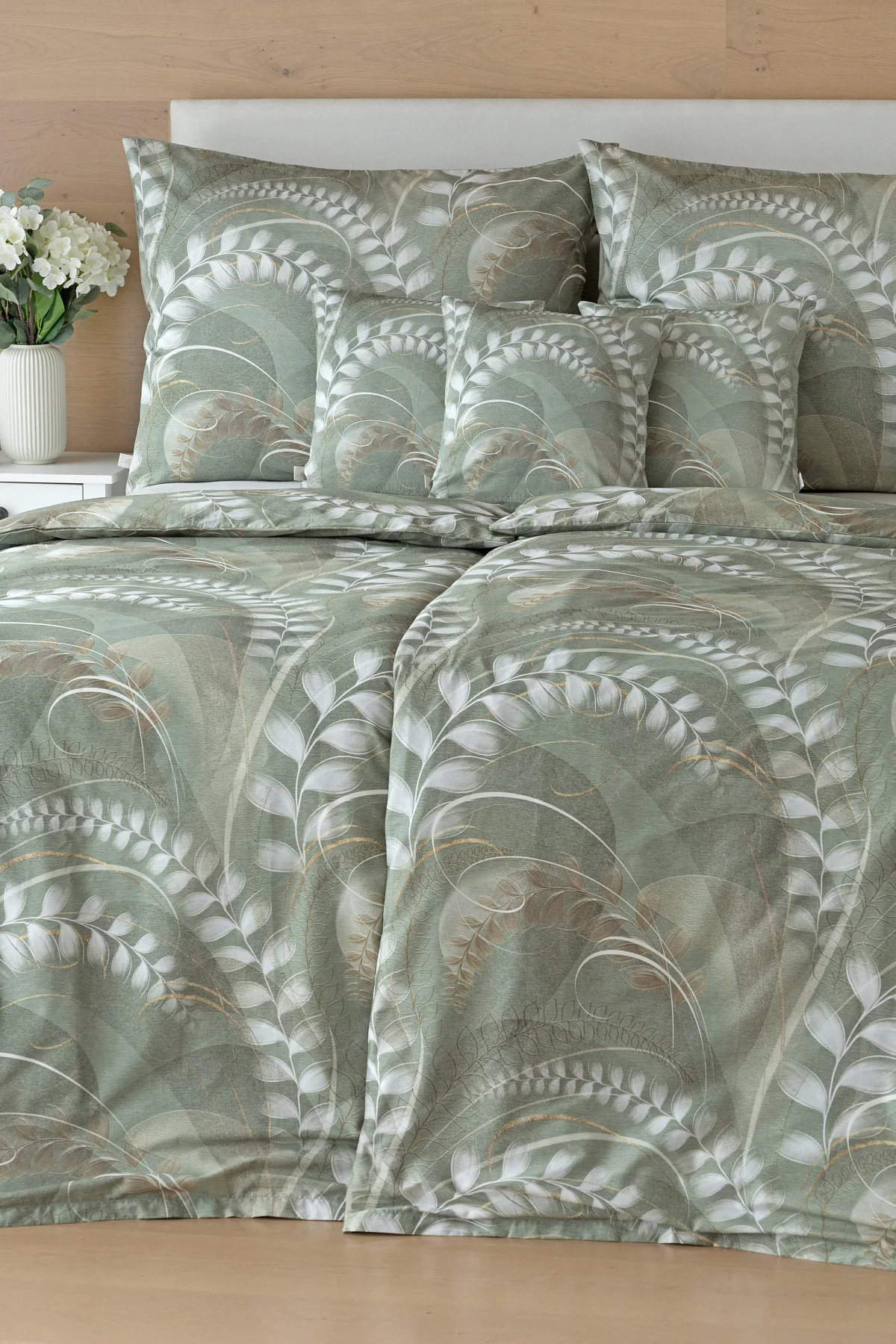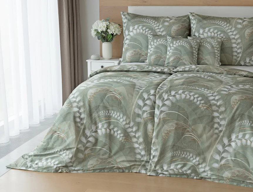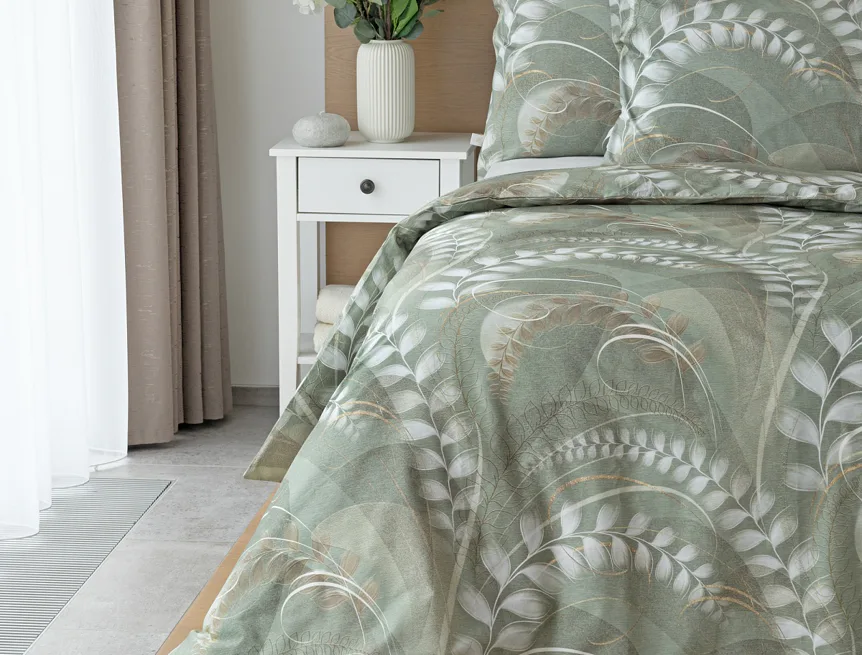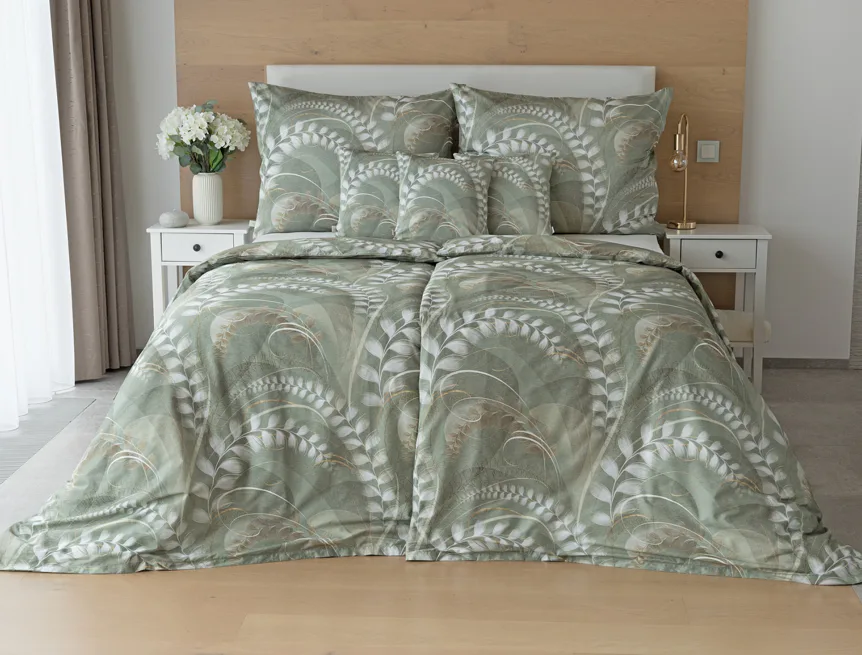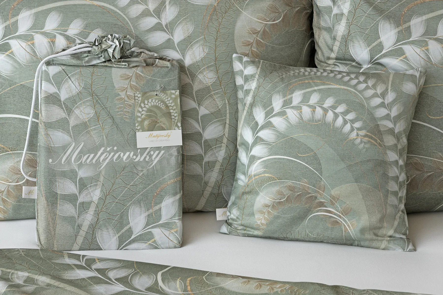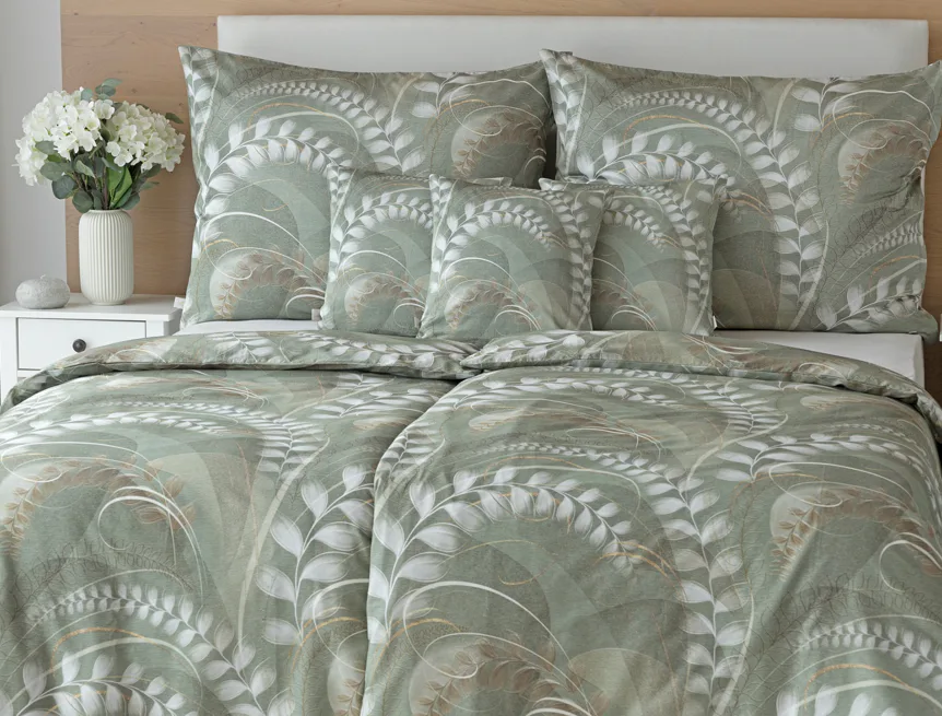 Vzor Ezra zdobí elegantní florální motiv v paletě krémových a zlatohnědých tónů na tlumeném zelenošedém podkladu. Povlak na polštář i na přikrývku je z obou stran stejný, povlečení je opatřeno komfortním zipovým uzávěrem.