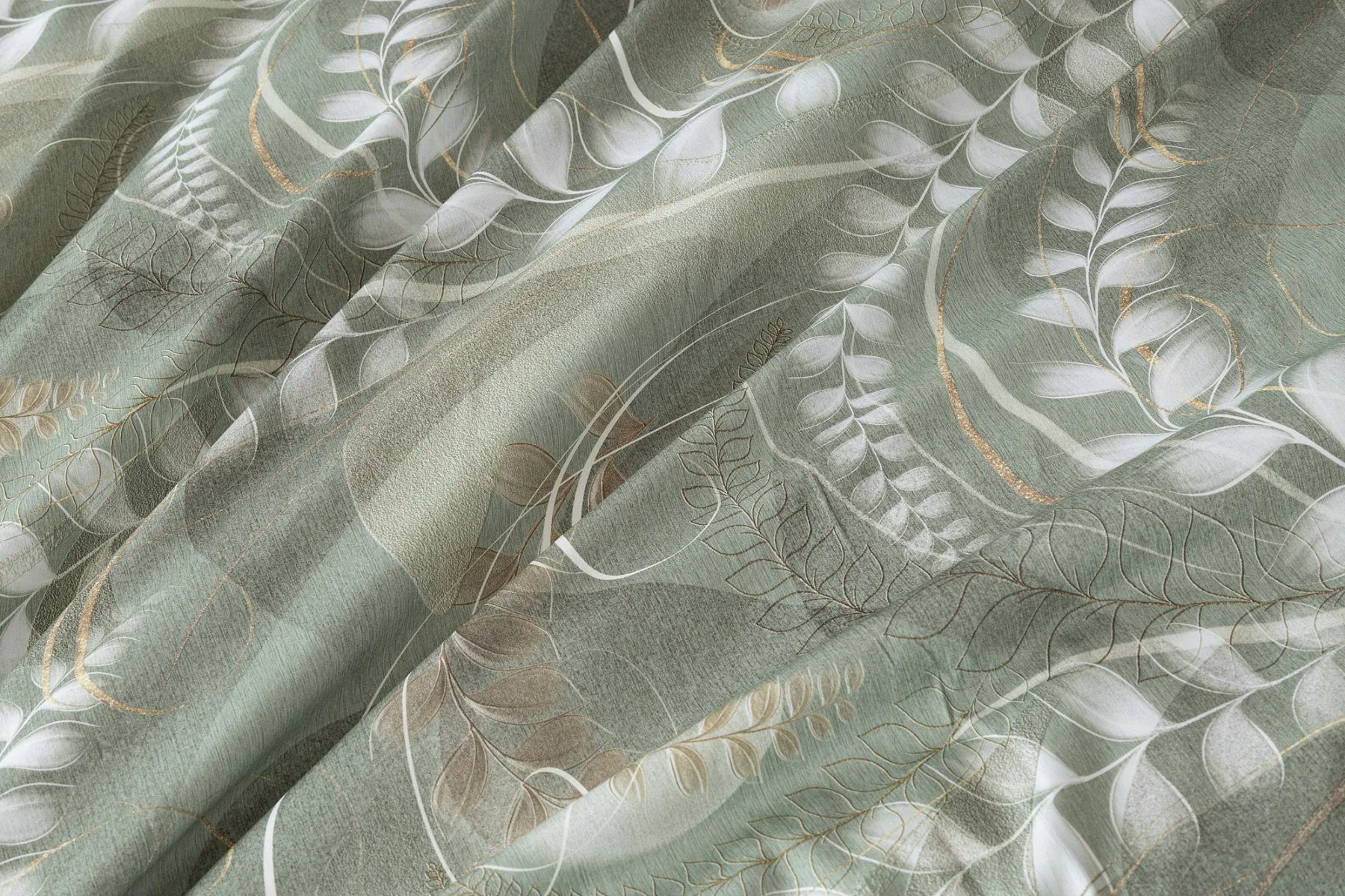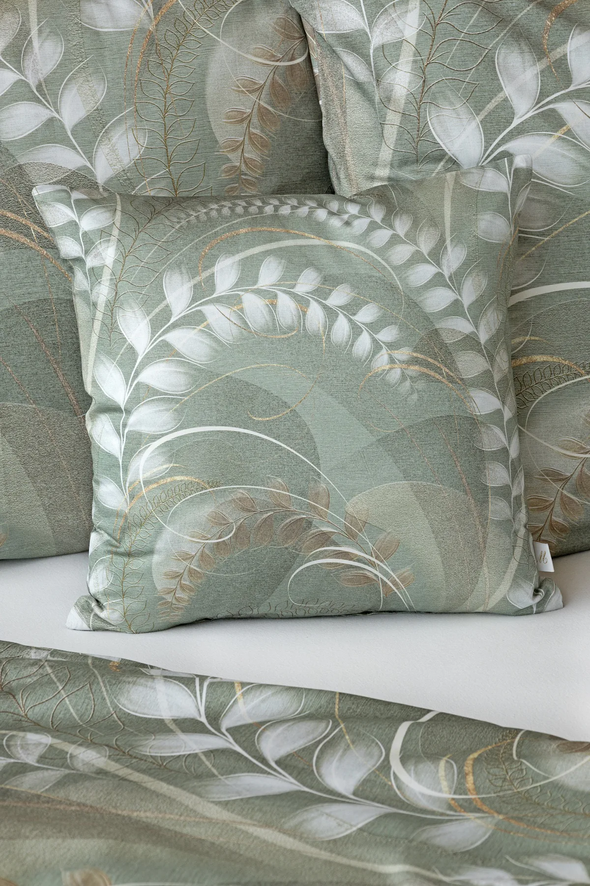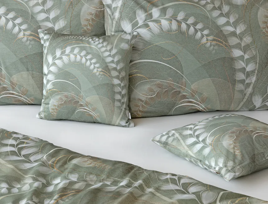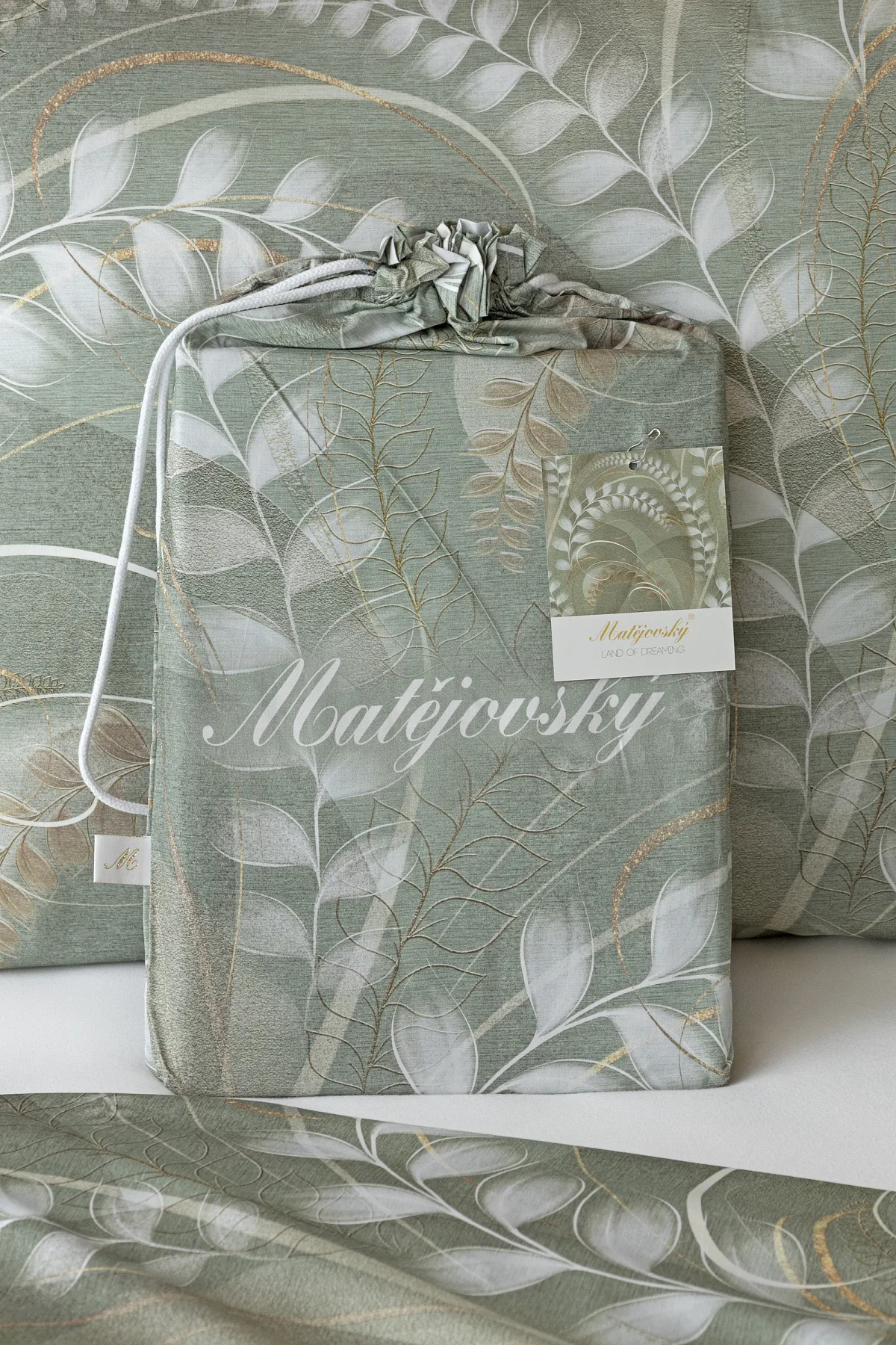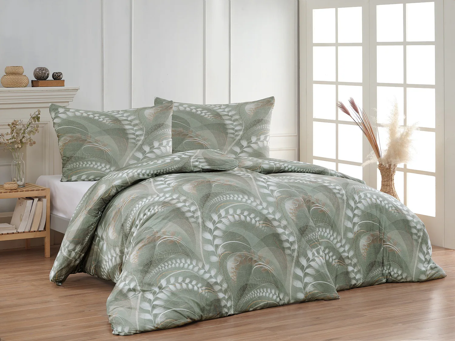 Vzor Ezra zdobí elegantní florální motiv v paletě krémových a zlatohnědých tónů na tlumeném zelenošedém podkladu. Povlak na polštář i na přikrývku je z obou stran stejný, povlečení je opatřeno komfortním zipovým uzávěrem.