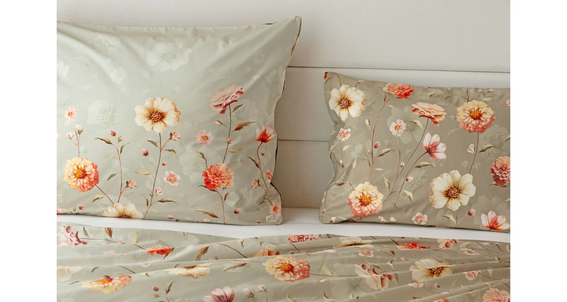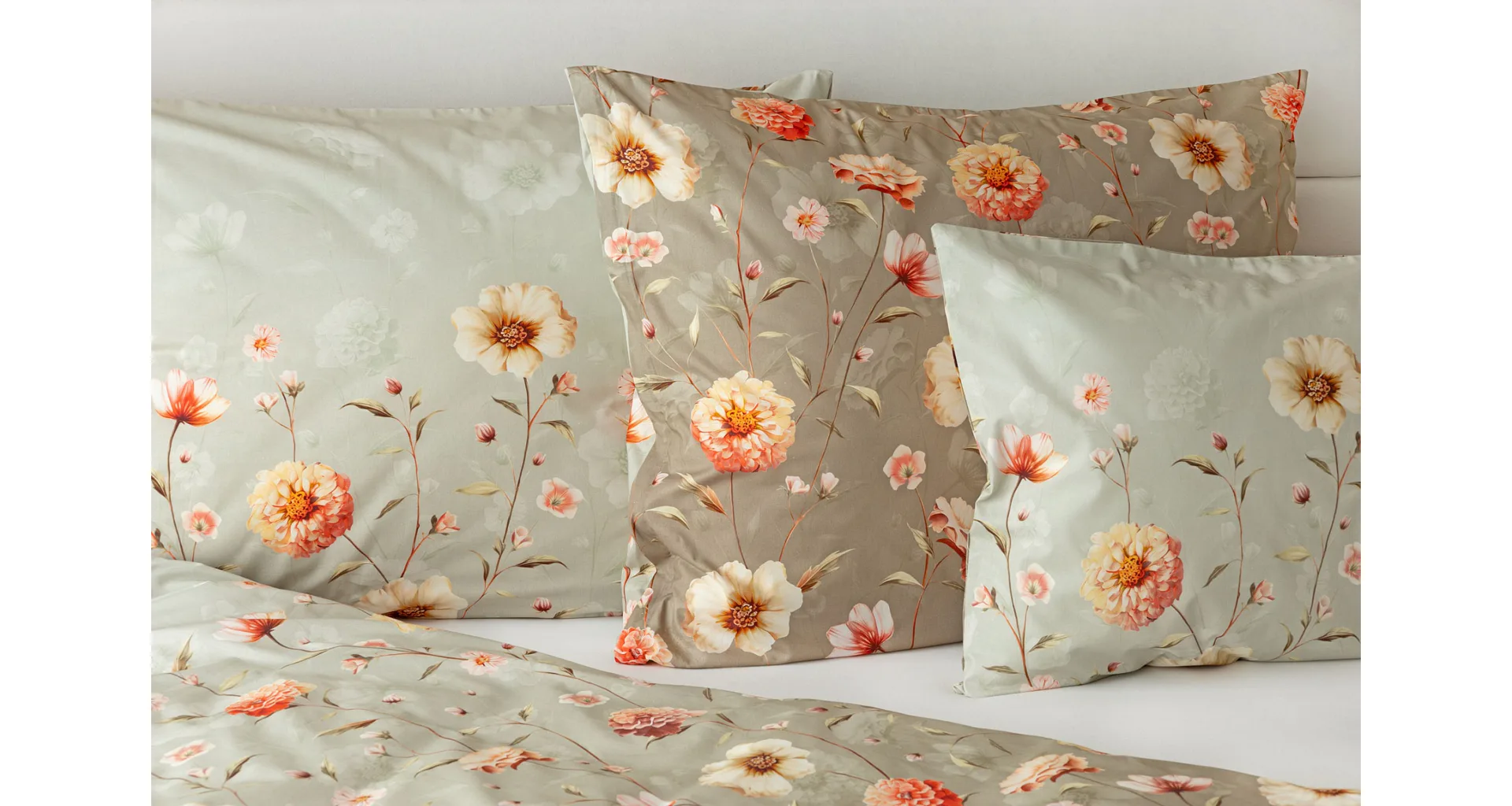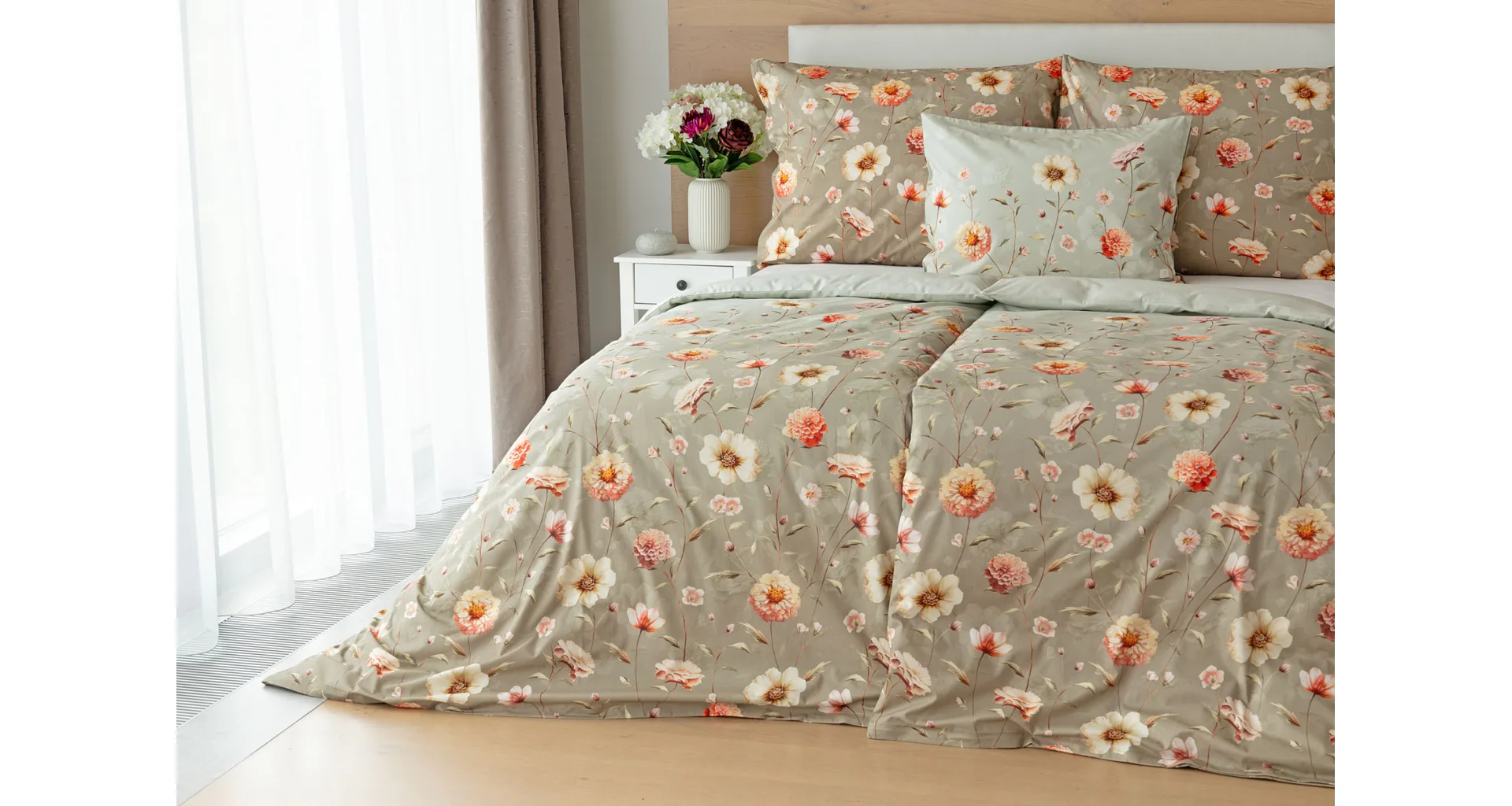 Okouzlující květinovou souhru v hřejivých barvách přináší bavlněné ložní povlečení Floral. Dominantní jiřiny s korálově růžovými květy doplňuje luční kvítí v přírodních tónech. Podkladová barva ložního povlečení přechází od spodní šedozelené po světlounce šedou.