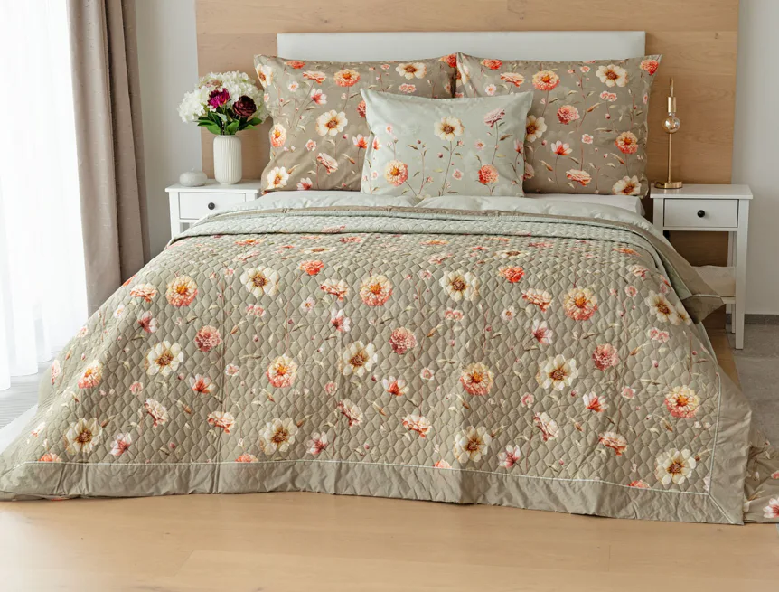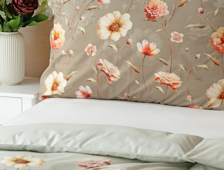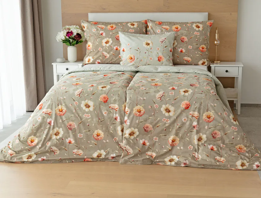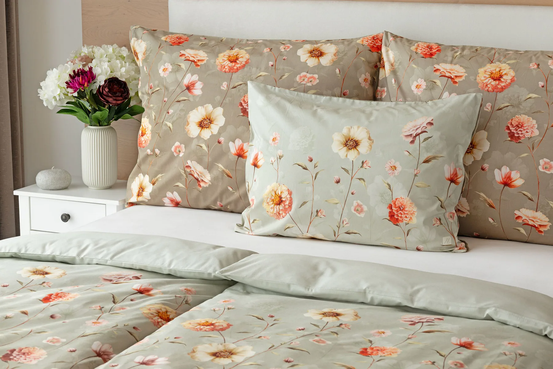 Okouzlující květinovou souhru v hřejivých barvách přináší bavlněné ložní povlečení Floral. Dominantní jiřiny s korálově růžovými květy doplňuje luční kvítí v přírodních tónech. Podkladová barva ložního povlečení přechází od spodní šedozelené po světlounce šedou.