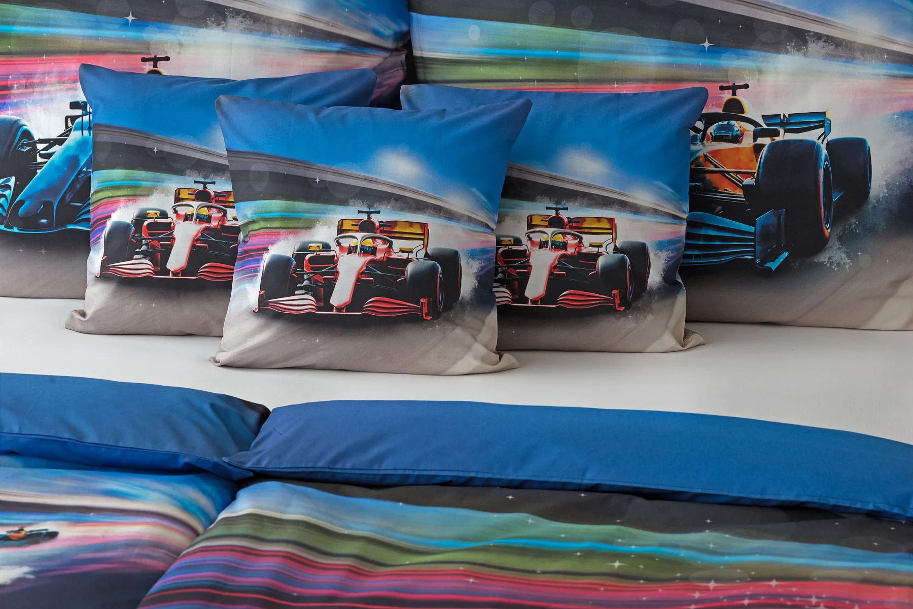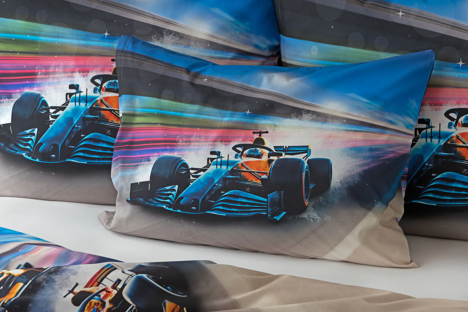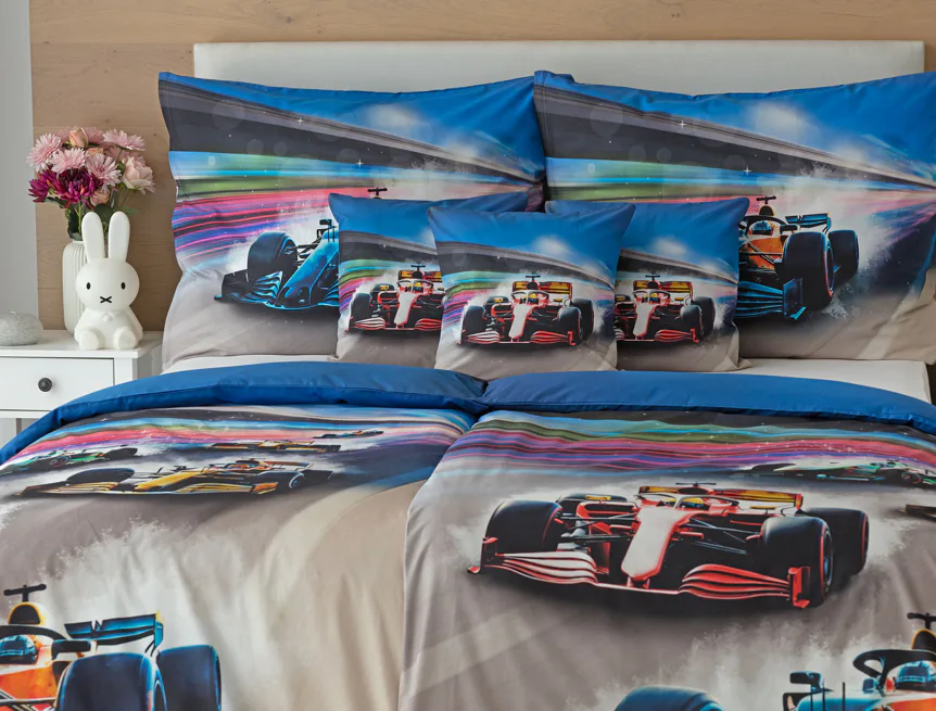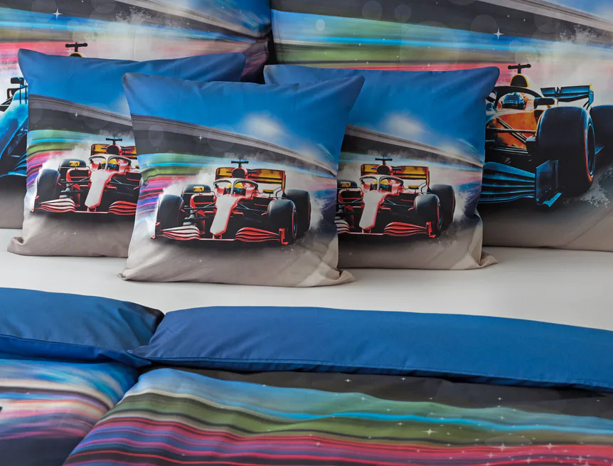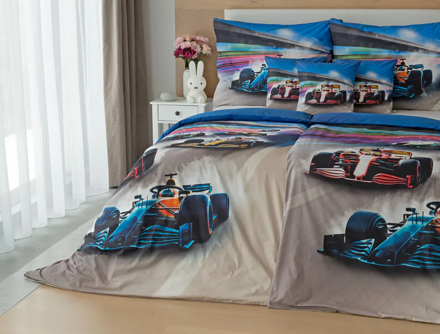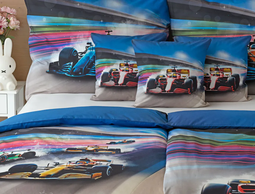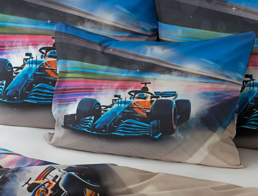 Stylové povlečení Formule potěší všechny fanoušky motorsportu a promění ložnici v závodní dráhu plnou energie a adrenalinu. Odvážná kombinace modrých, červených a šedých tónů dodává povlečení moderní a dynamický vzhled, který okamžitě oživí každý interiér. O precizní detaily pestrého motivu se postarala nejmodernější digitální tisková technologie