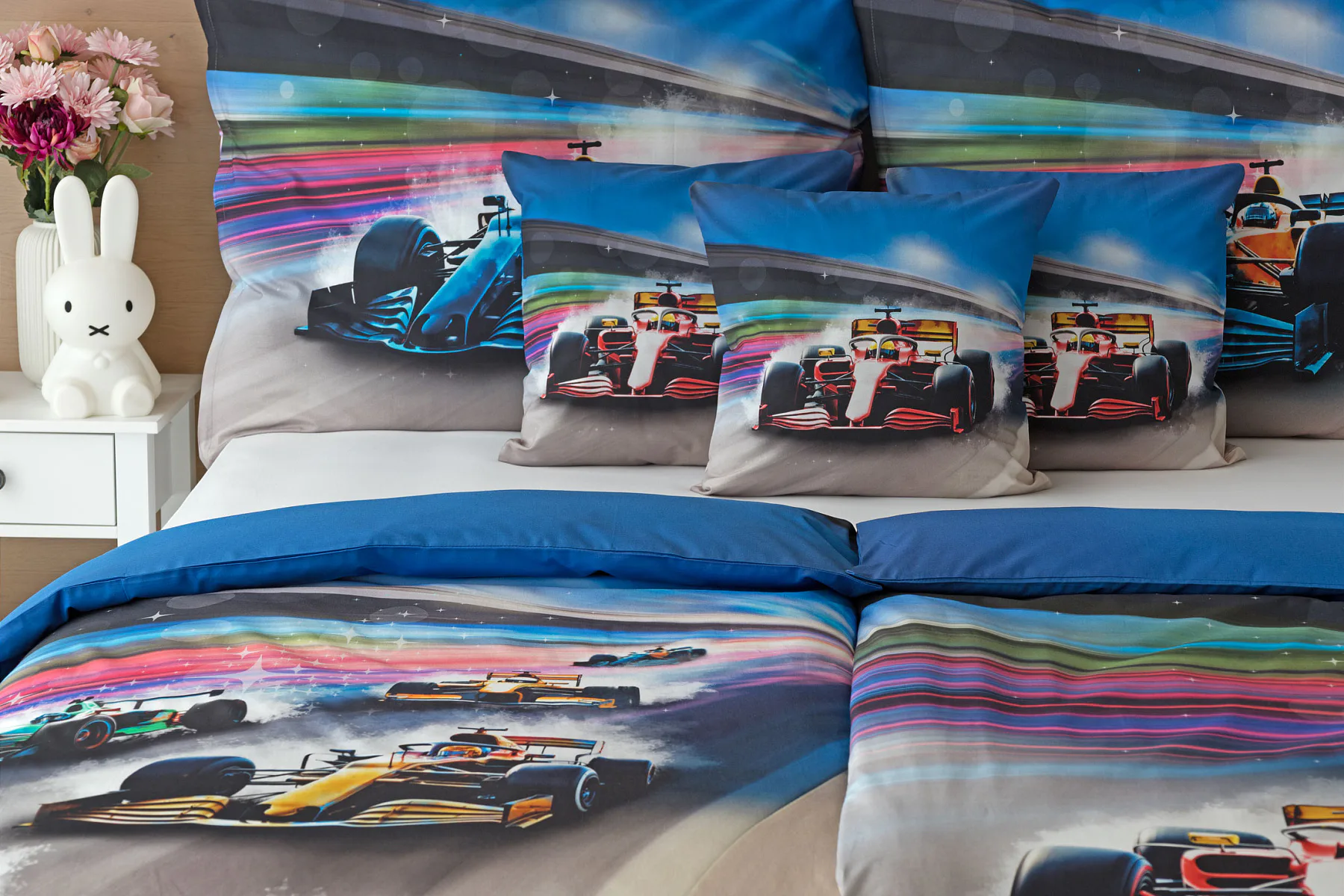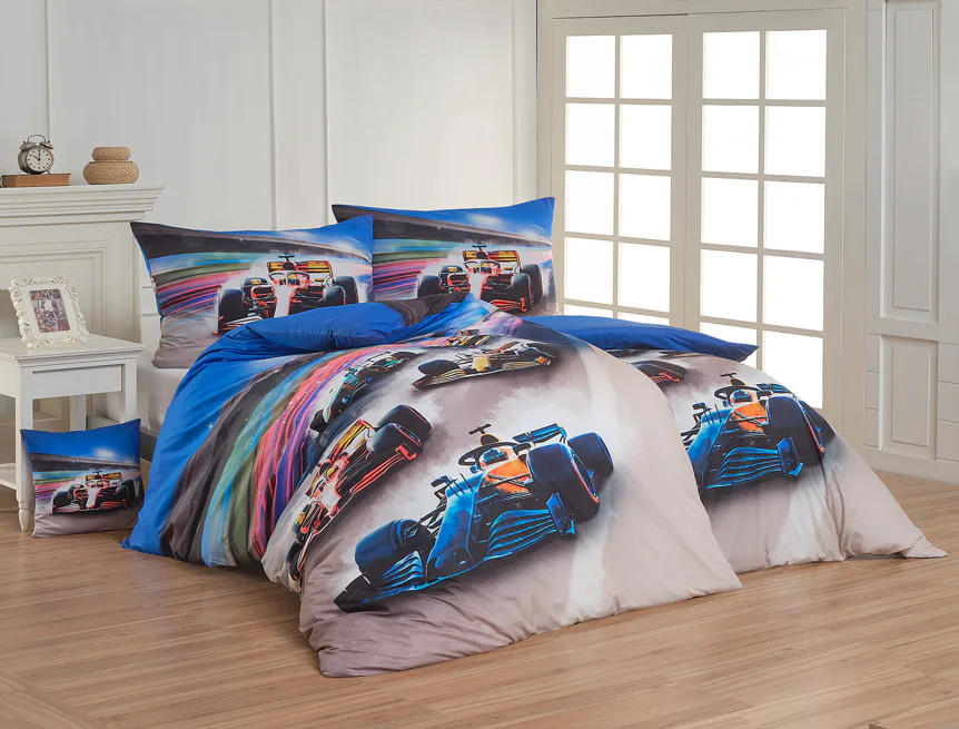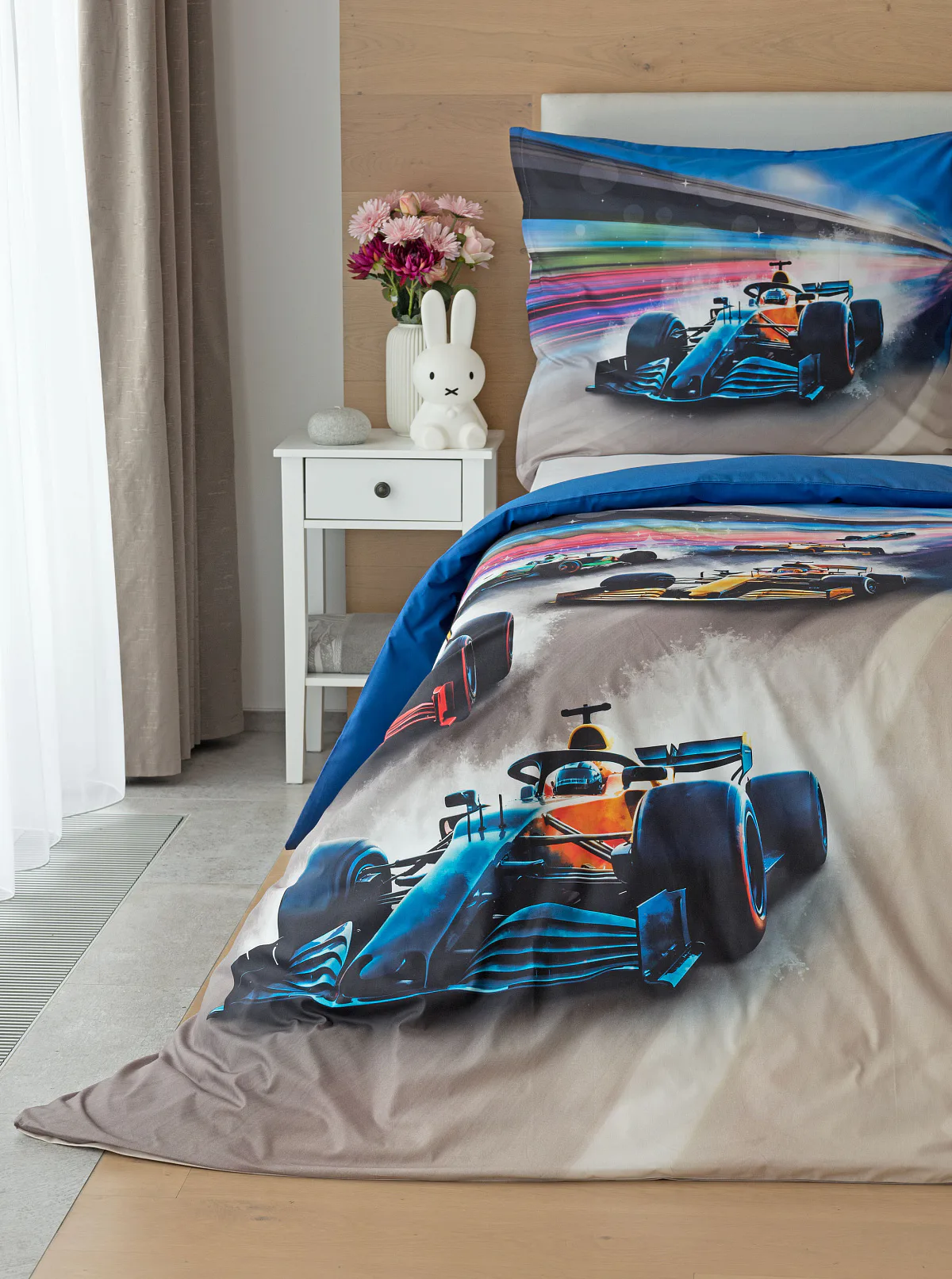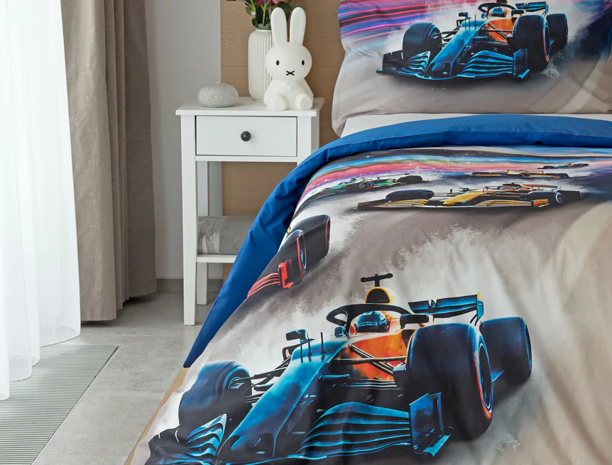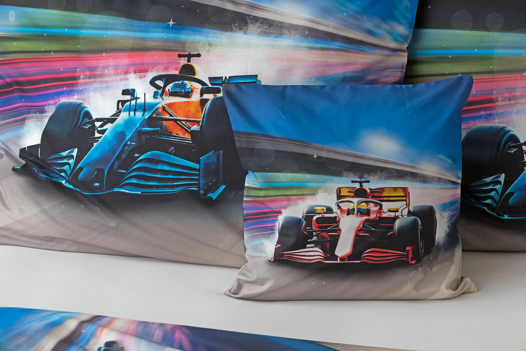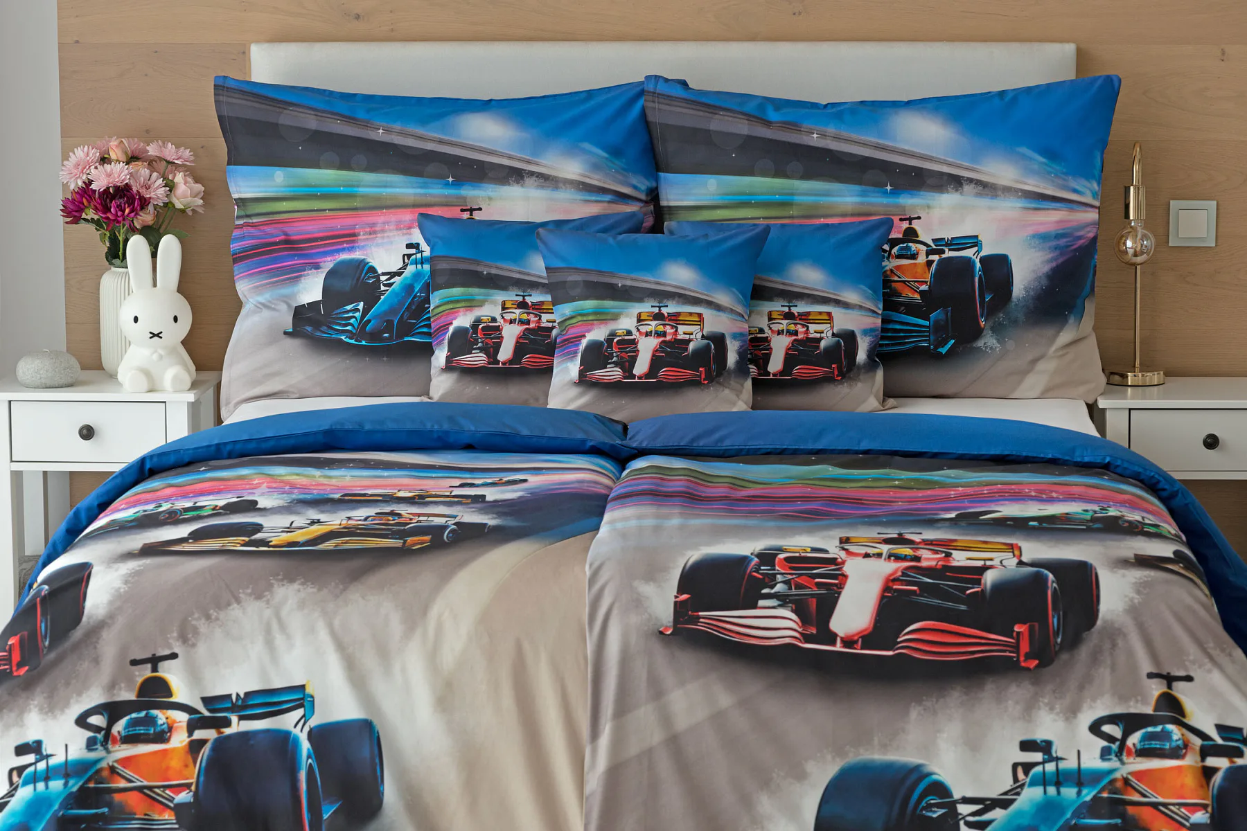 Stylové povlečení Formule potěší všechny fanoušky motorsportu a promění ložnici v závodní dráhu plnou energie a adrenalinu. Odvážná kombinace modrých, červených a šedých tónů dodává povlečení moderní a dynamický vzhled, který okamžitě oživí každý interiér. O precizní detaily pestrého motivu se postarala nejmodernější digitální tisková technologie