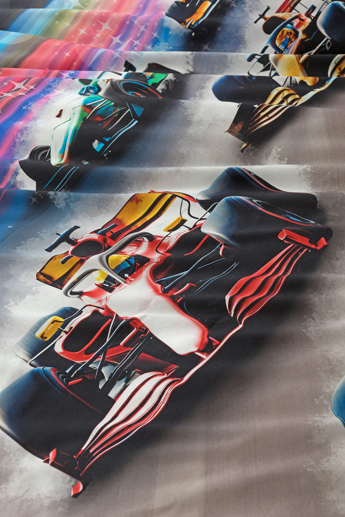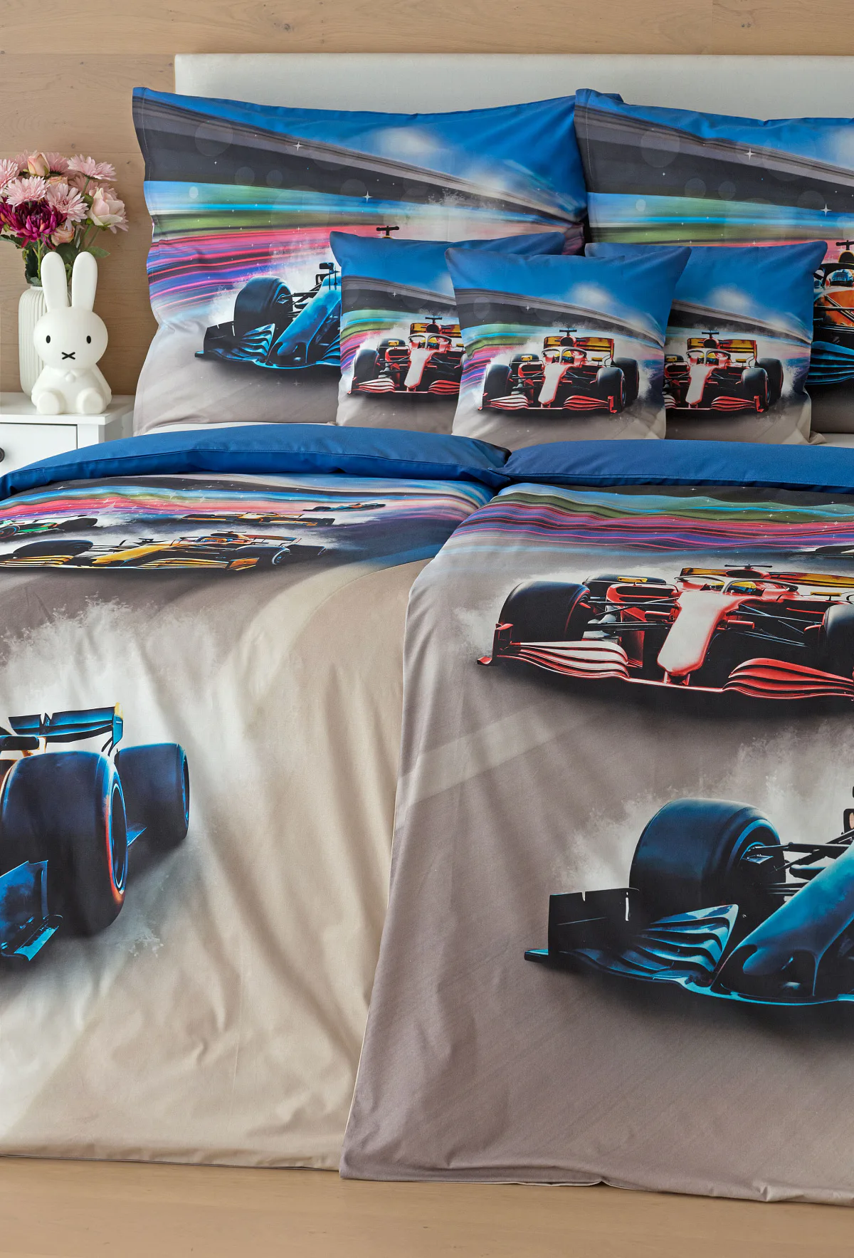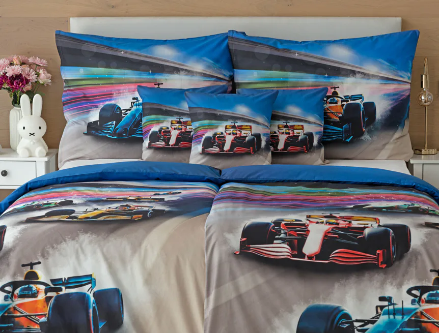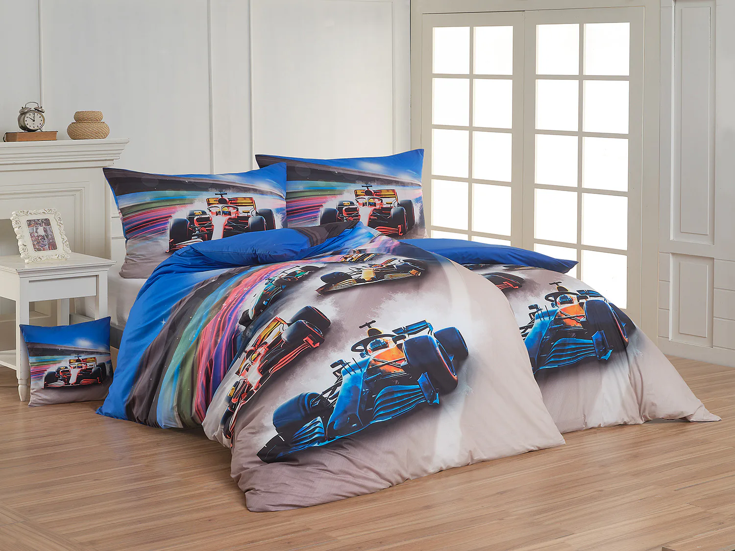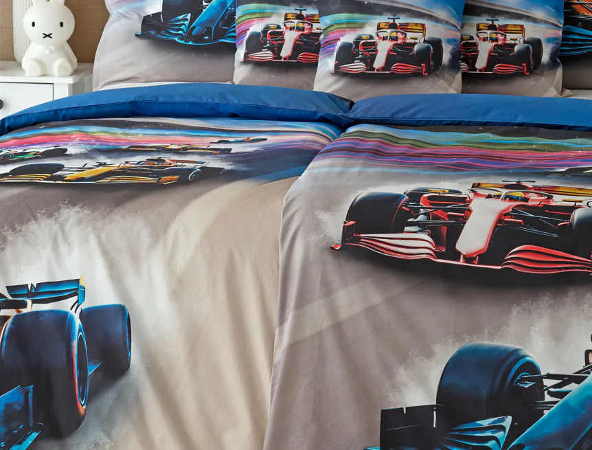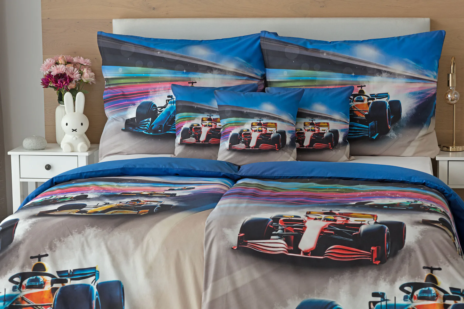 Stylové povlečení Formule potěší všechny fanoušky motorsportu a promění ložnici v závodní dráhu plnou energie a adrenalinu. Odvážná kombinace modrých, červených a šedých tónů dodává povlečení moderní a dynamický vzhled, který okamžitě oživí každý interiér. O precizní detaily pestrého motivu se postarala nejmodernější digitální tisková technologie