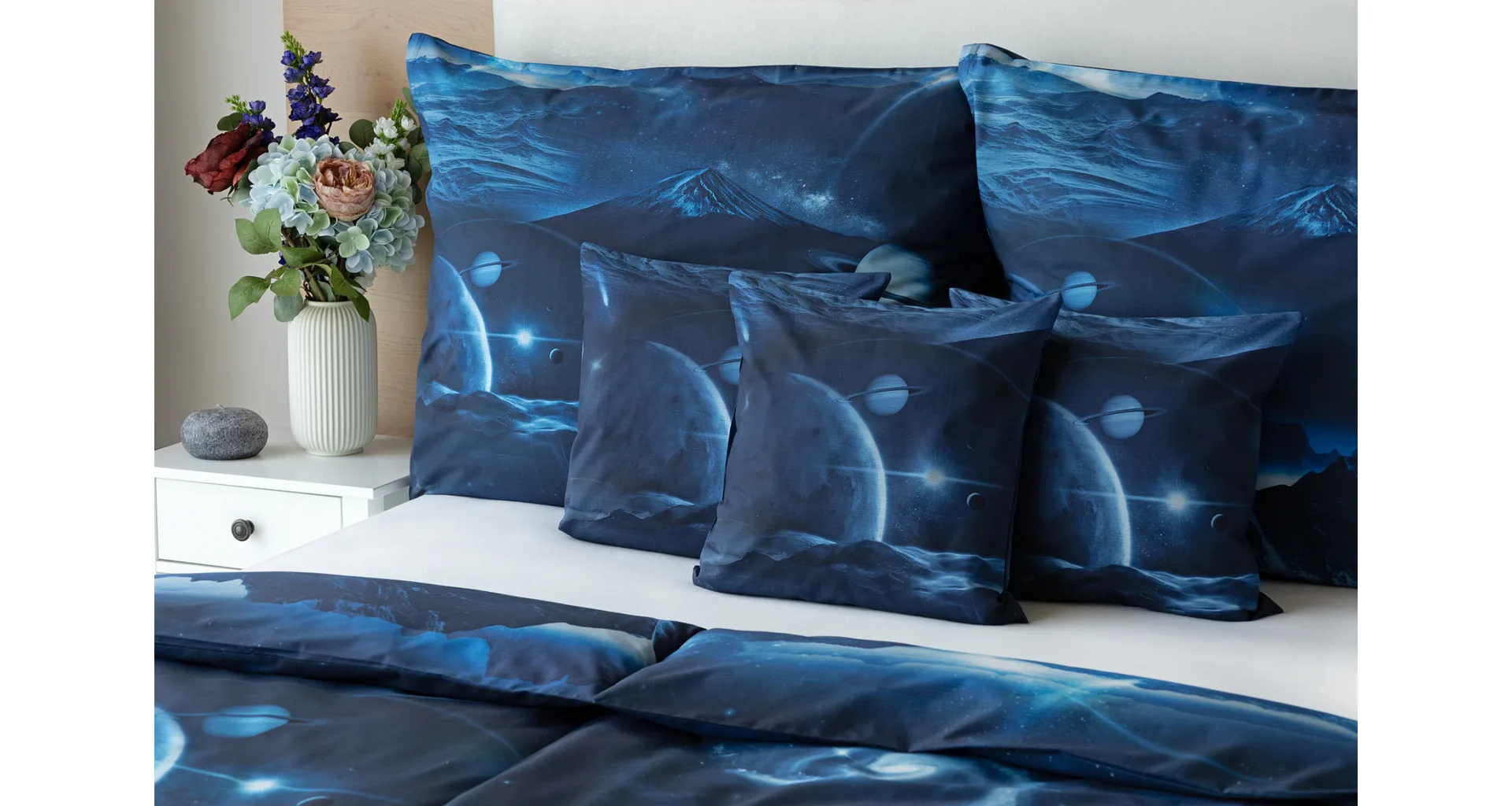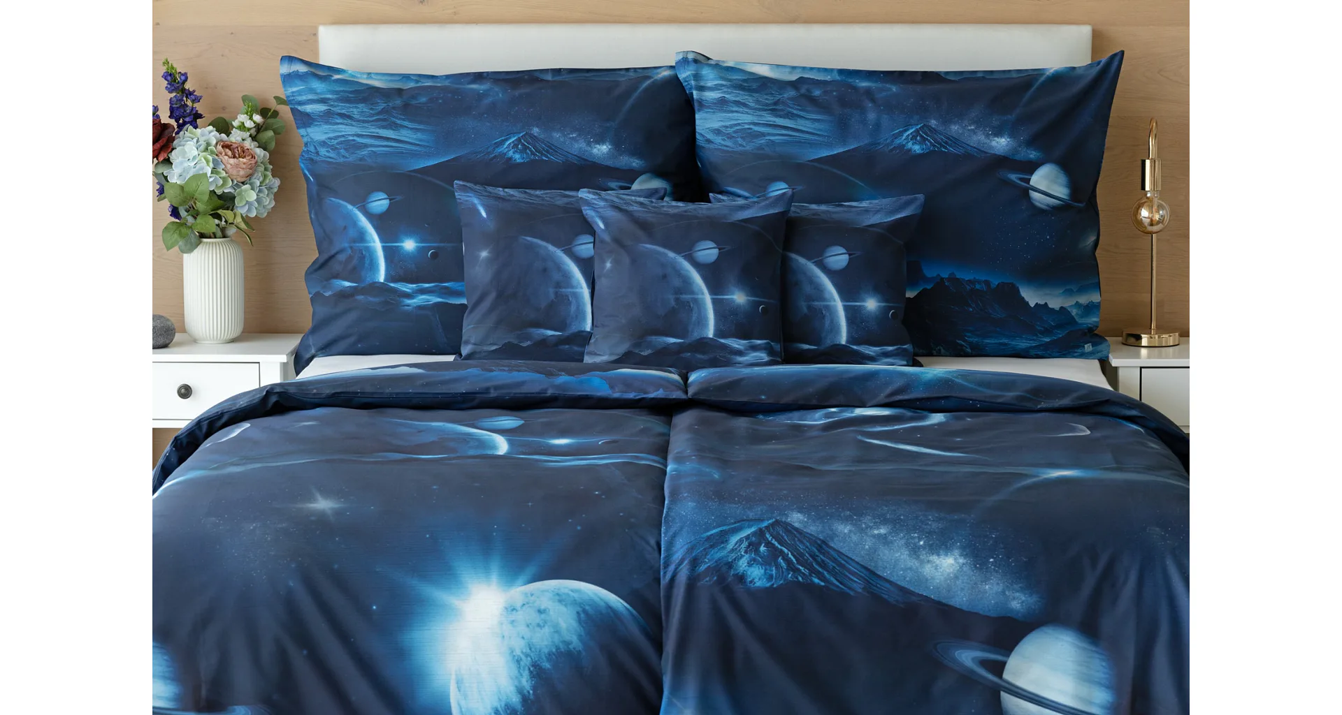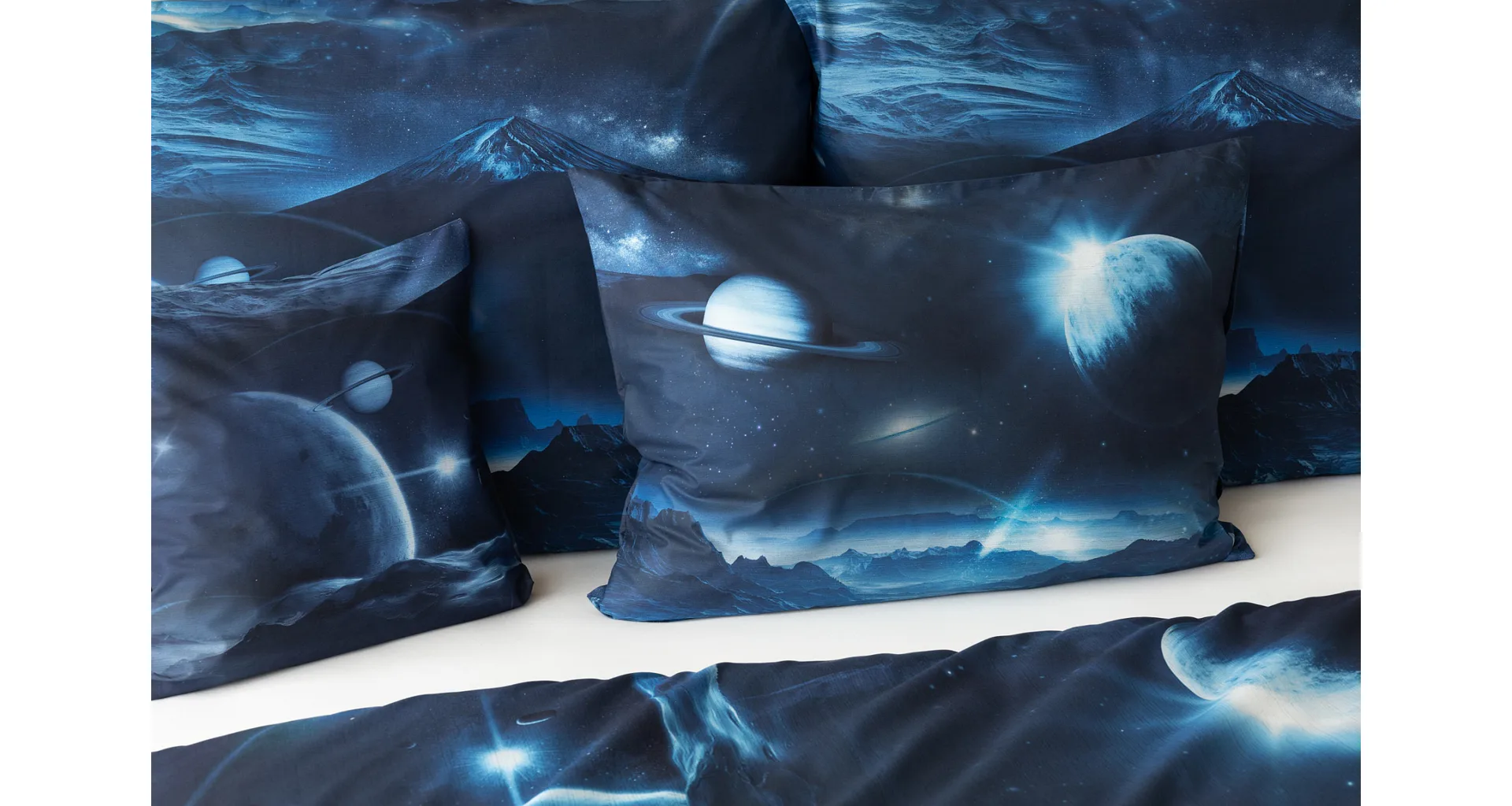 Objevte tajemství vesmíru přímo z vaší ložnice s hebkým bavlněným povlečením Galaxie. Tmavě modrý podklad zdobí motivy planet. Díky nejmodernějšímu digitálním tisku vyniká vzor v precizním detailu. Přeneste se do vesmíru každou noc a nechte své sny volně plynout mezi hvězdami.