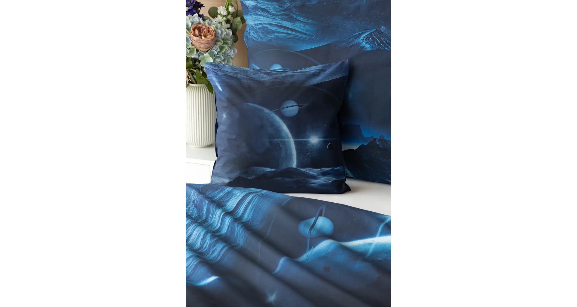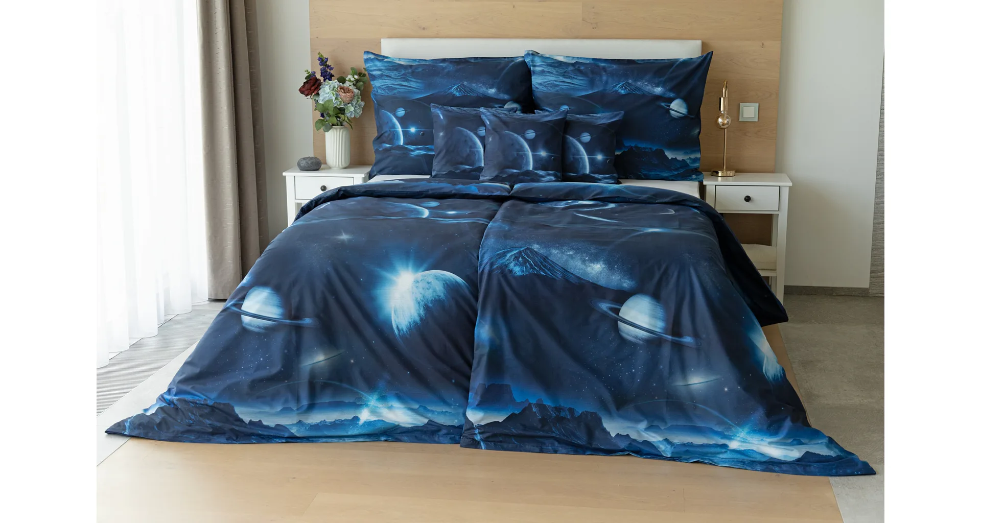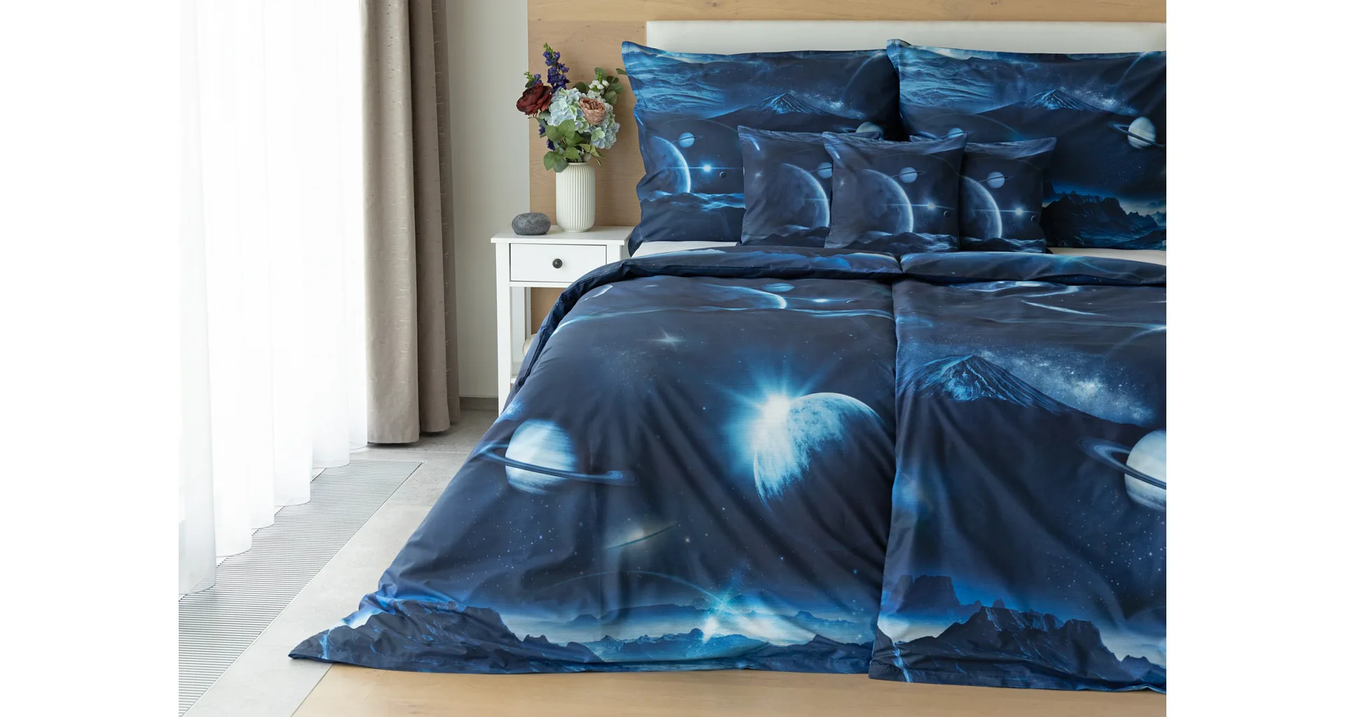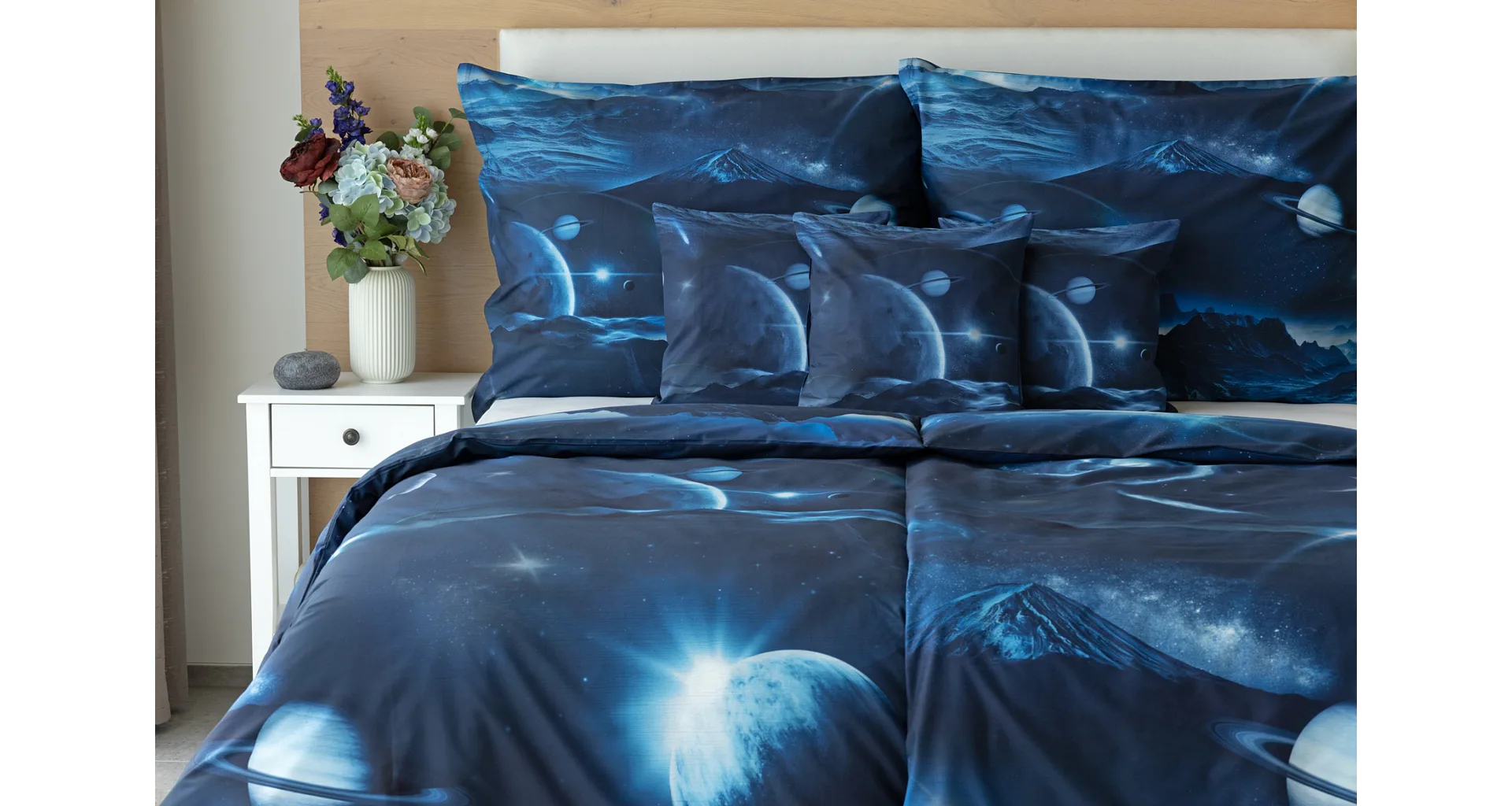 Objevte tajemství vesmíru přímo z vaší ložnice s hebkým bavlněným povlečením Galaxie. Tmavě modrý podklad zdobí motivy planet. Díky nejmodernějšímu digitálním tisku vyniká vzor v precizním detailu. Přeneste se do vesmíru každou noc a nechte své sny volně plynout mezi hvězdami.