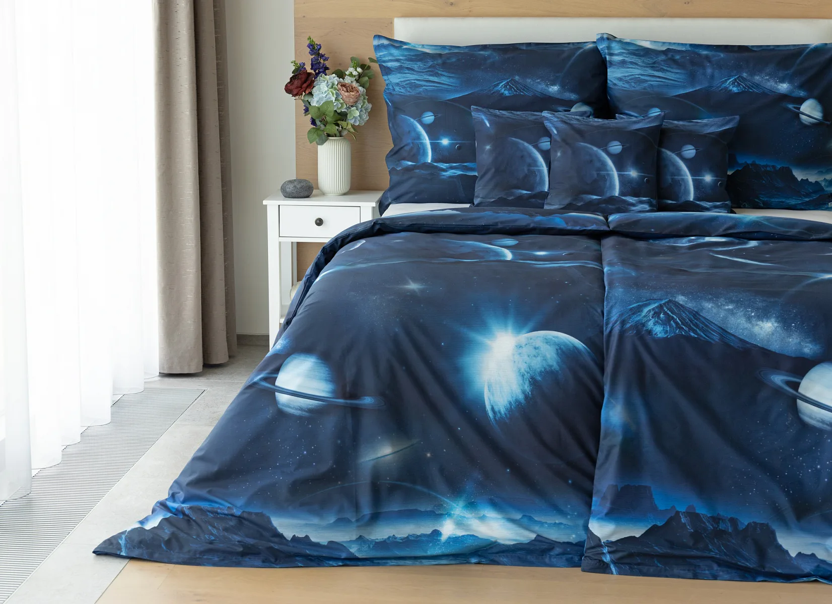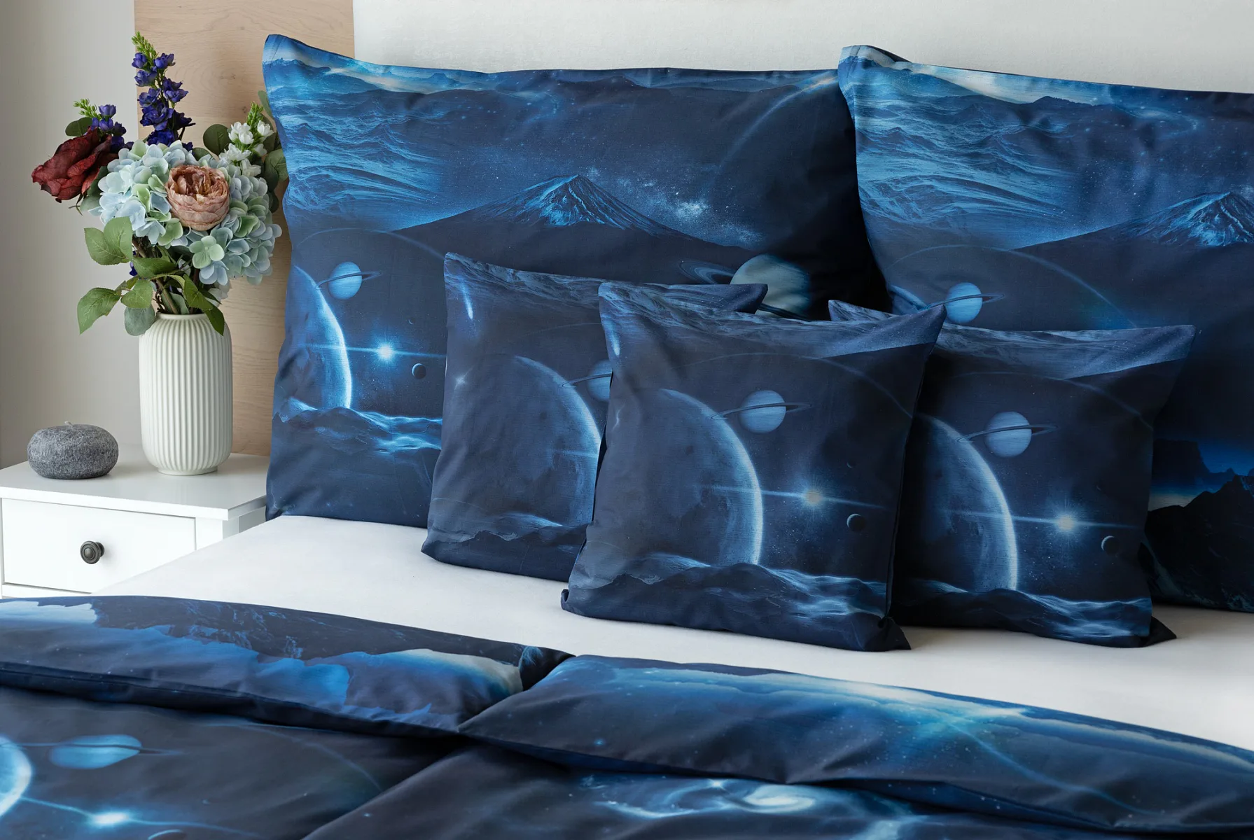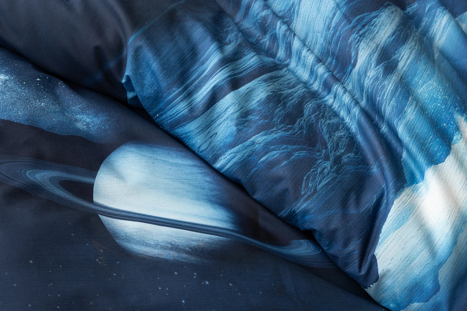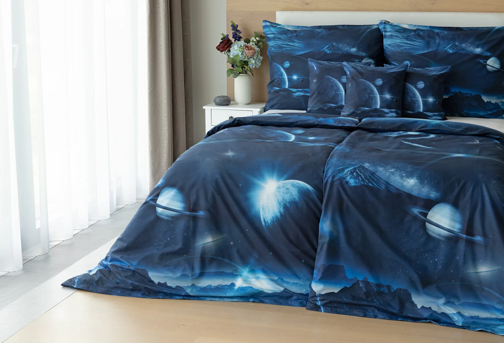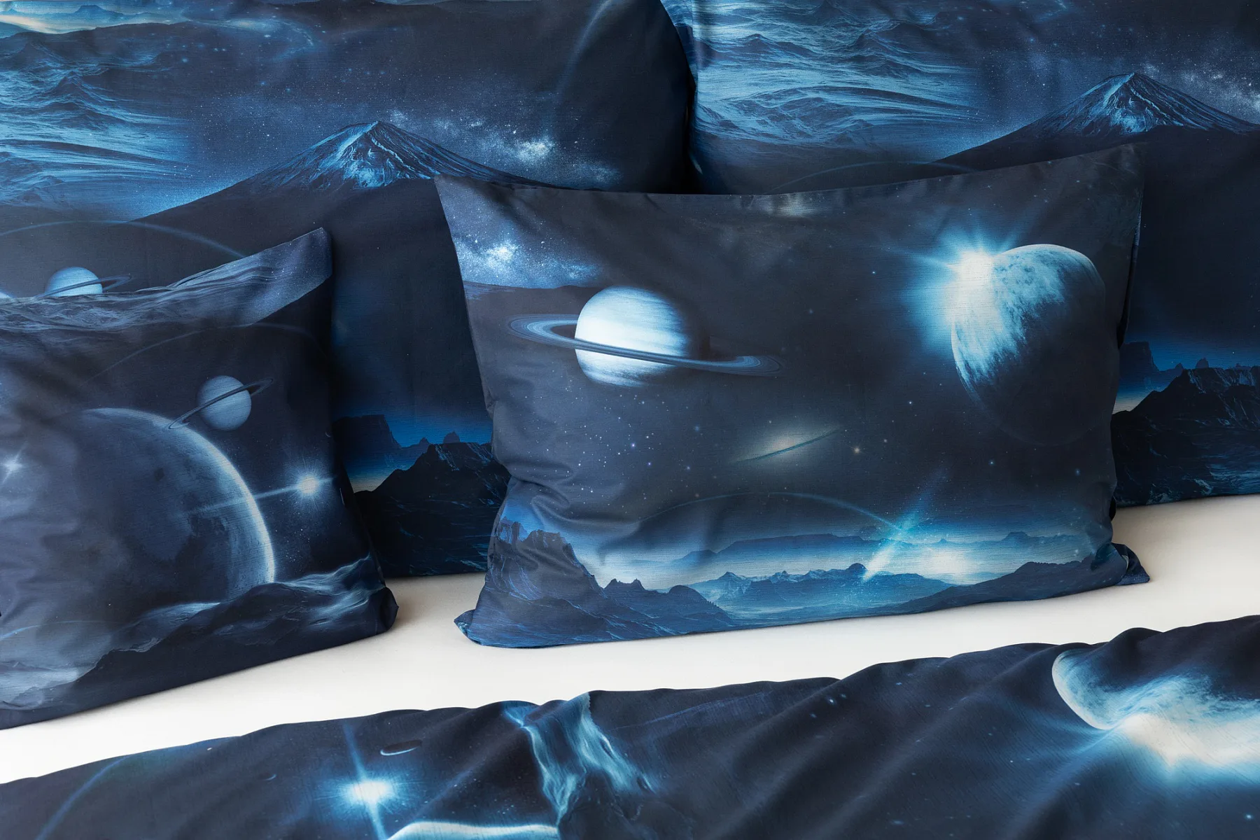 Objevte tajemství vesmíru přímo z vaší ložnice s hebkým bavlněným povlečením Galaxie. Tmavě modrý podklad zdobí motivy planet. Díky nejmodernějšímu digitálním tisku vyniká vzor v precizním detailu. Přeneste se do vesmíru každou noc a nechte své sny volně plynout mezi hvězdami.