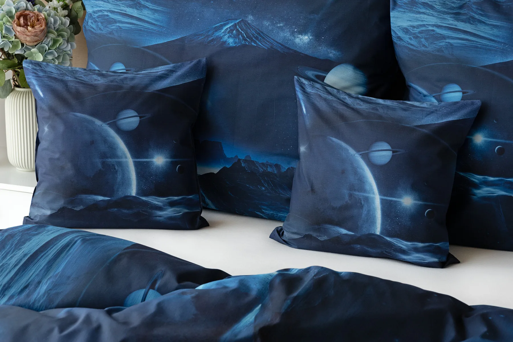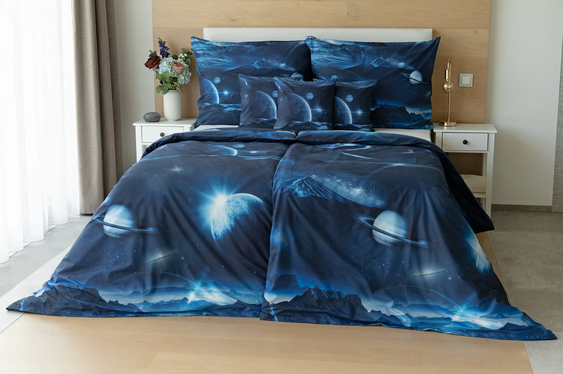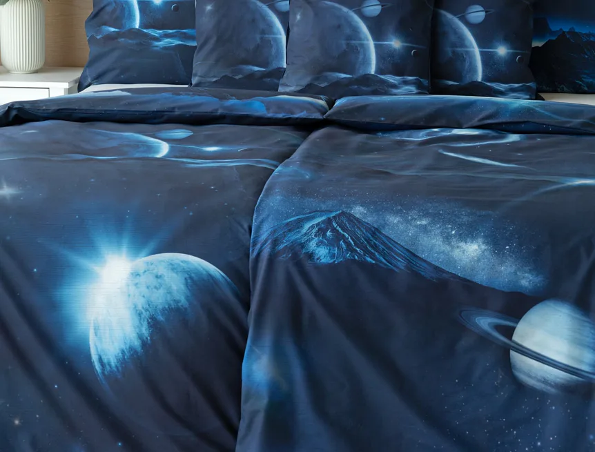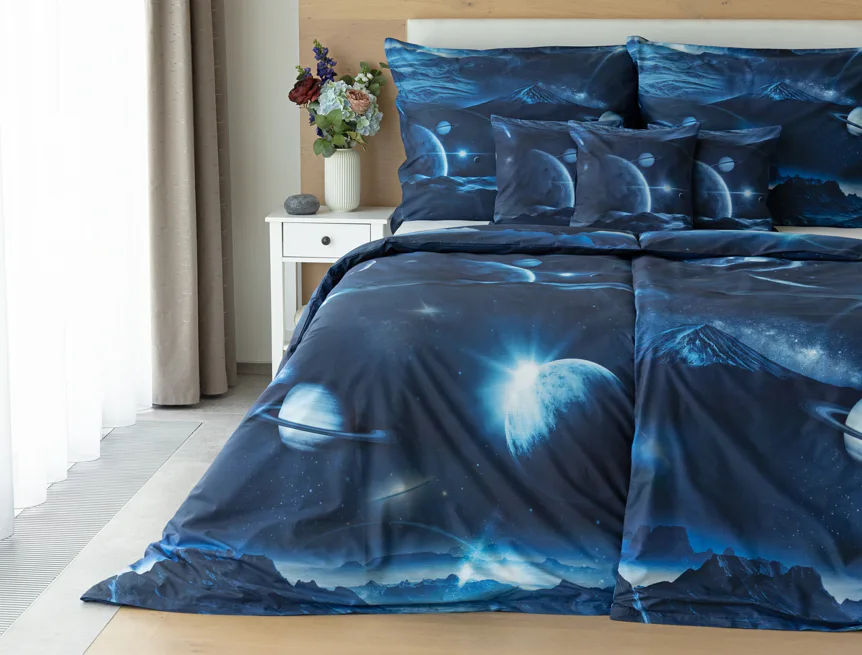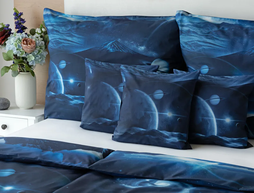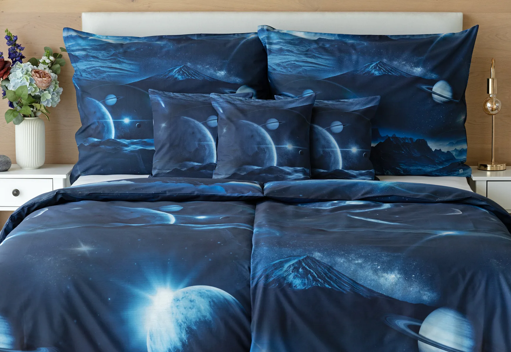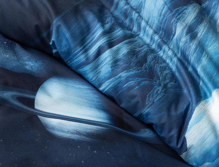 Objevte tajemství vesmíru přímo z vaší ložnice s hebkým bavlněným povlečením Galaxie. Tmavě modrý podklad zdobí motivy planet. Díky nejmodernějšímu digitálním tisku vyniká vzor v precizním detailu. Přeneste se do vesmíru každou noc a nechte své sny volně plynout mezi hvězdami.