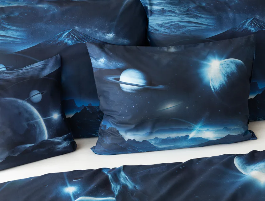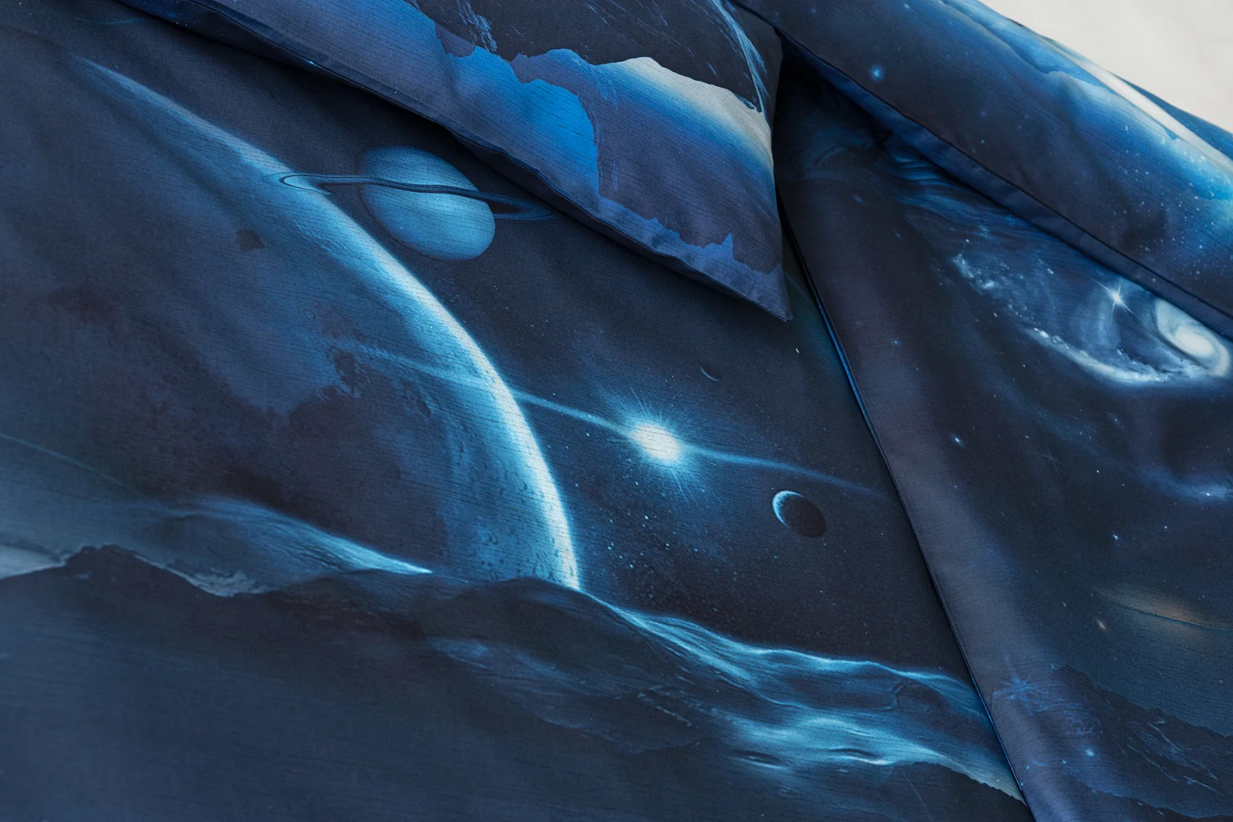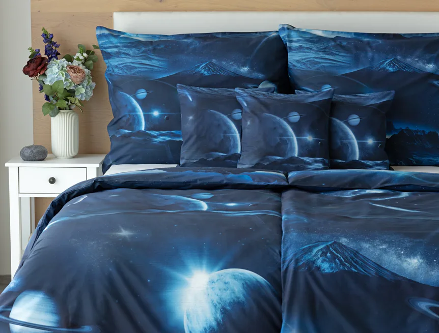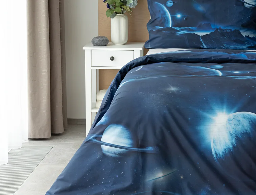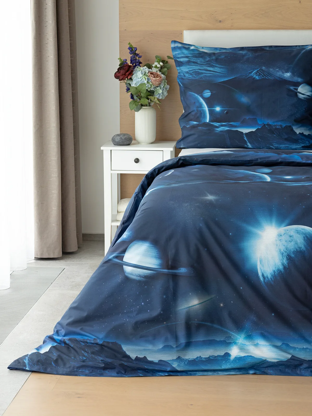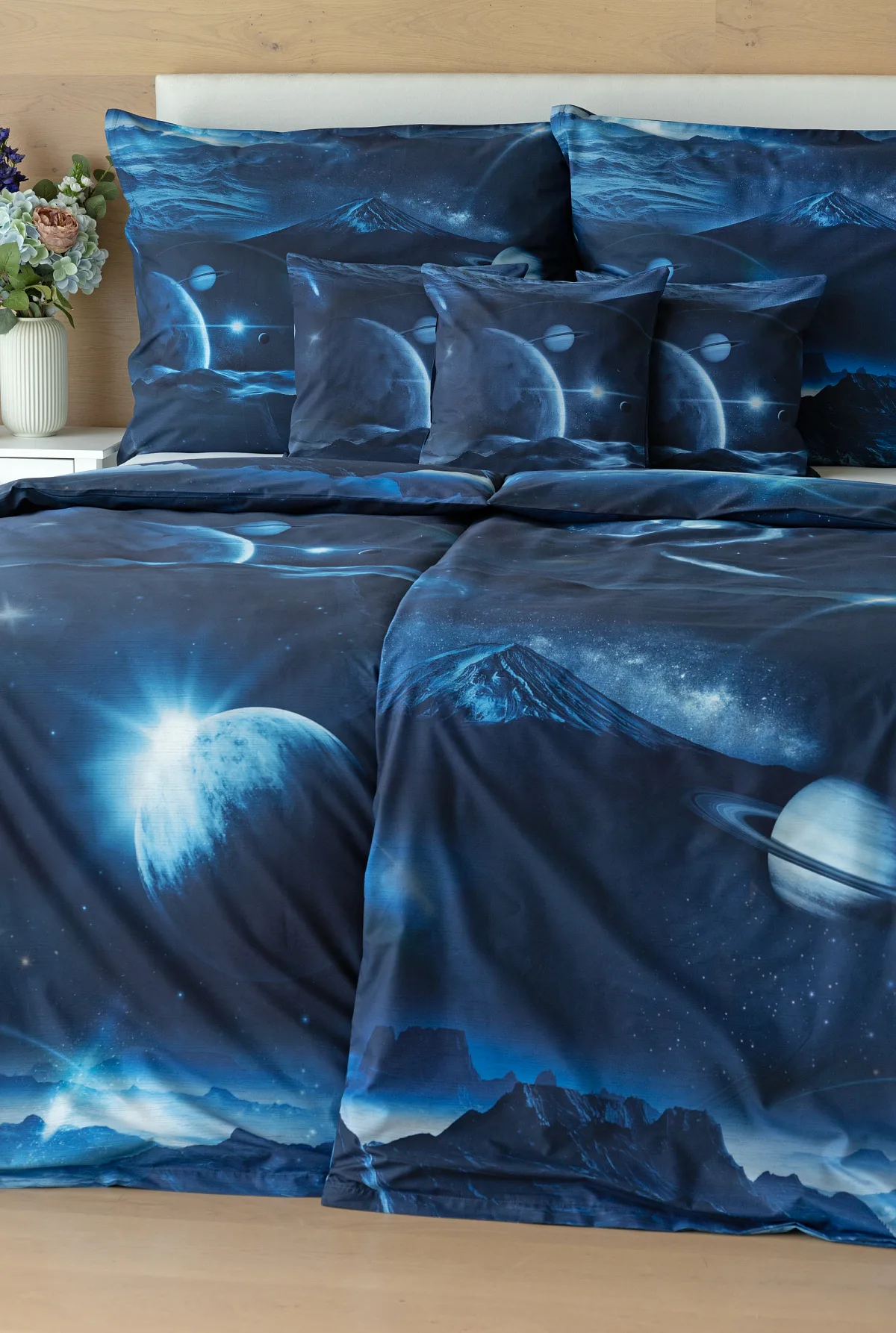 Objevte tajemství vesmíru přímo z vaší ložnice s hebkým bavlněným povlečením Galaxie. Tmavě modrý podklad zdobí motivy planet. Díky nejmodernějšímu digitálním tisku vyniká vzor v precizním detailu. Přeneste se do vesmíru každou noc a nechte své sny volně plynout mezi hvězdami.