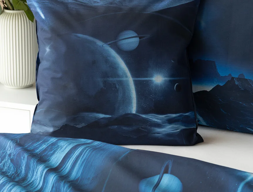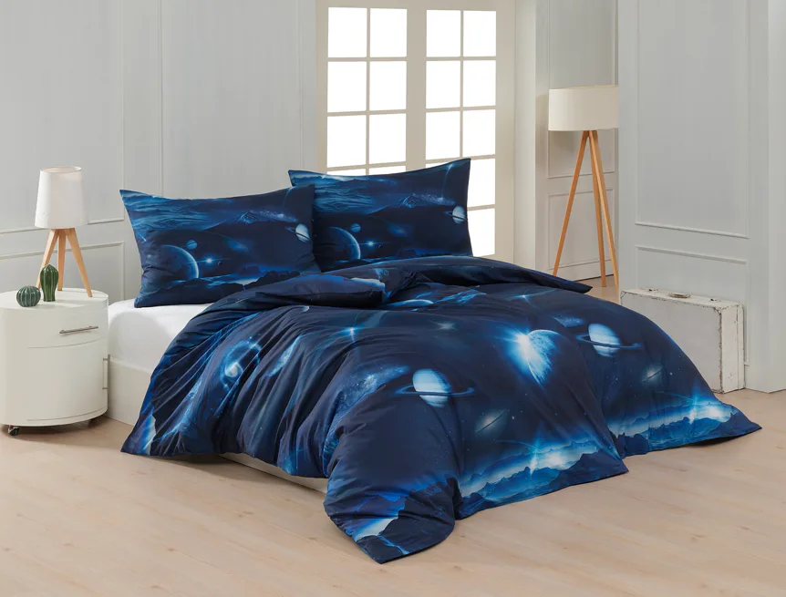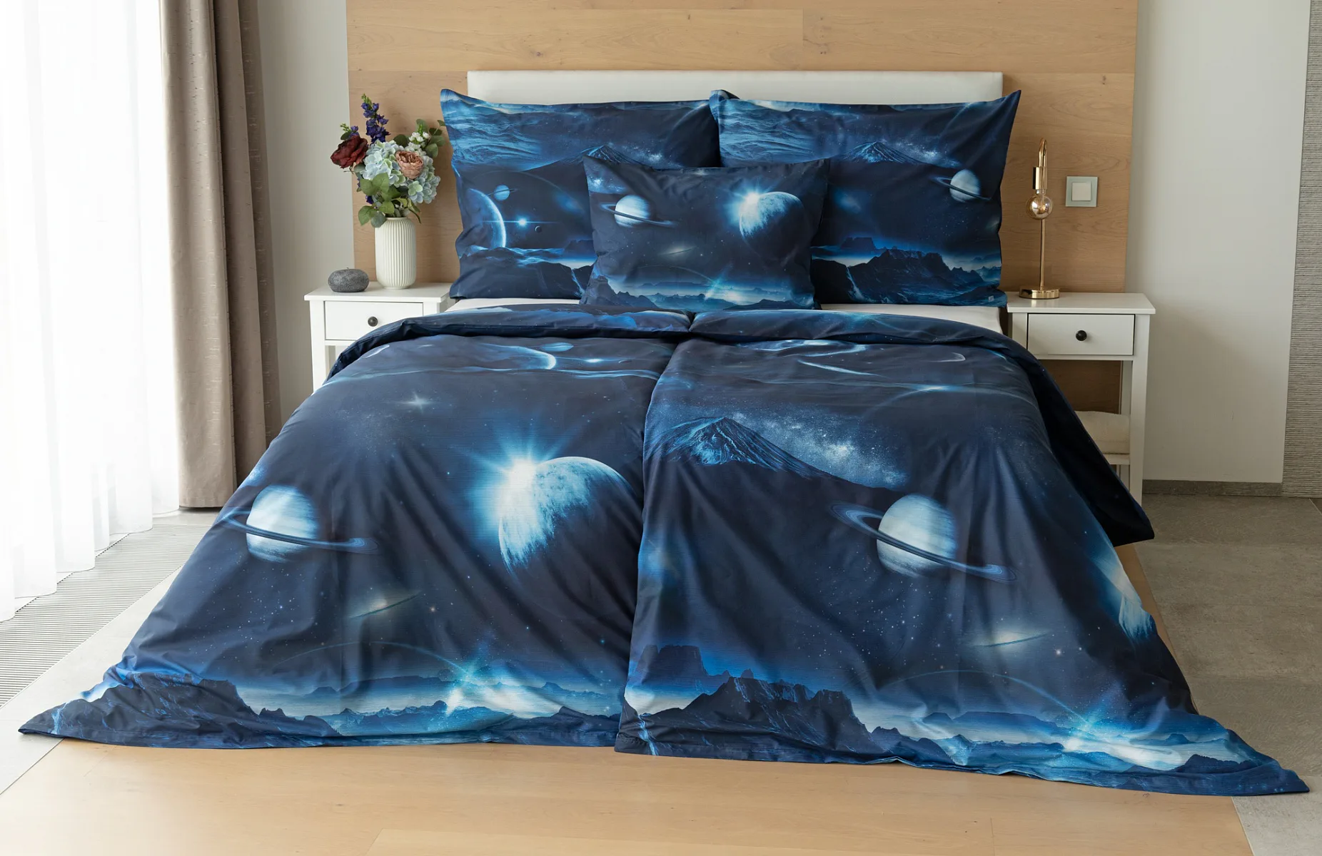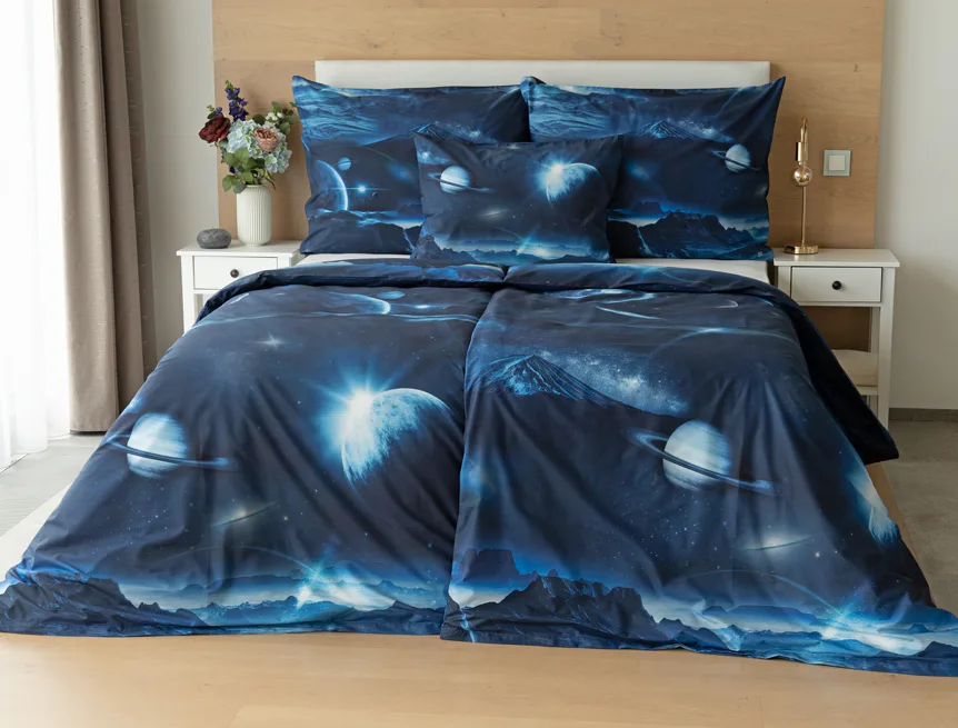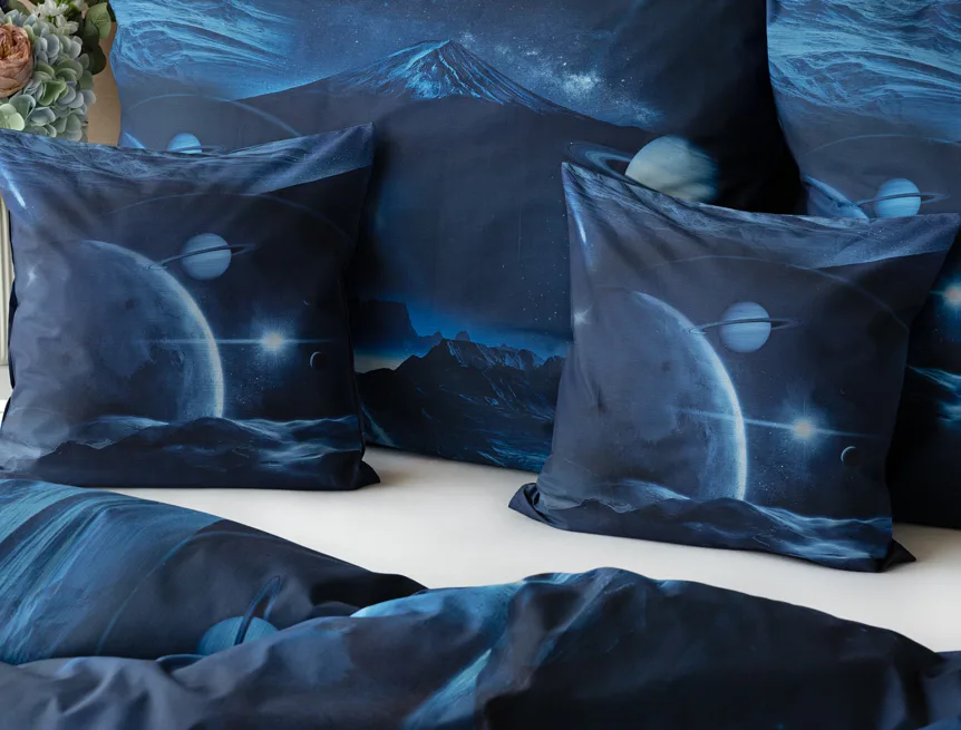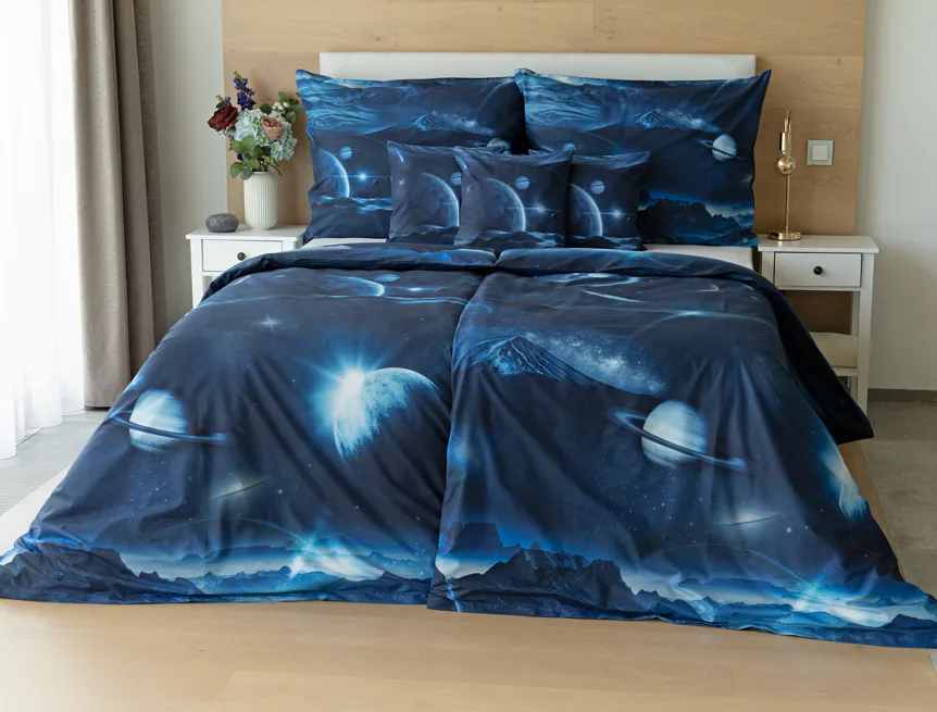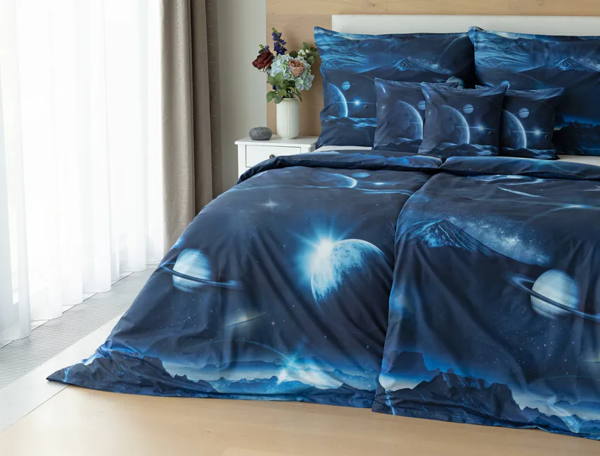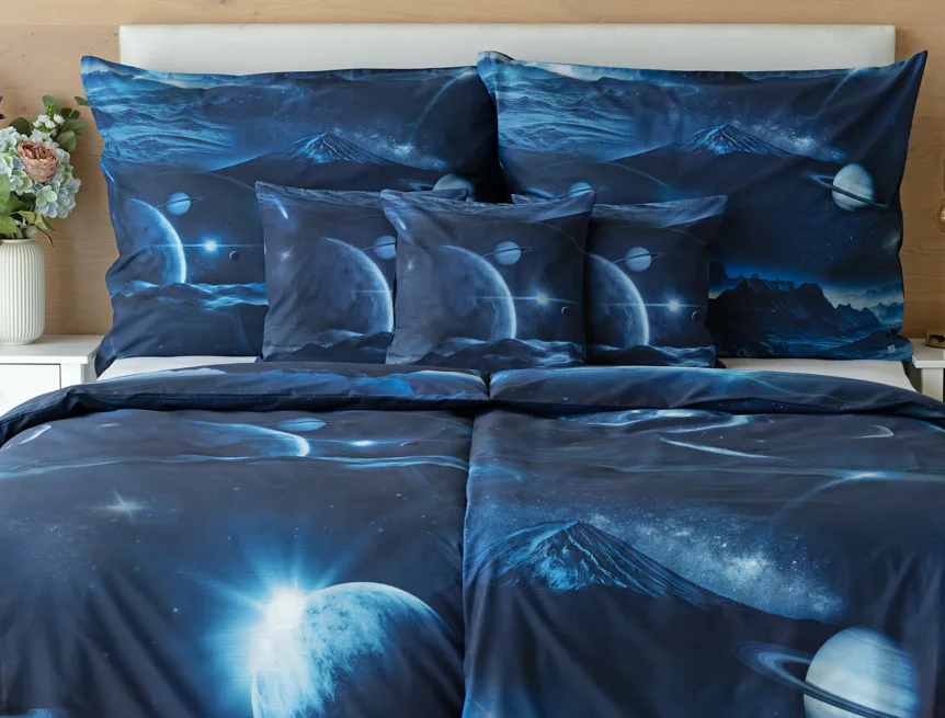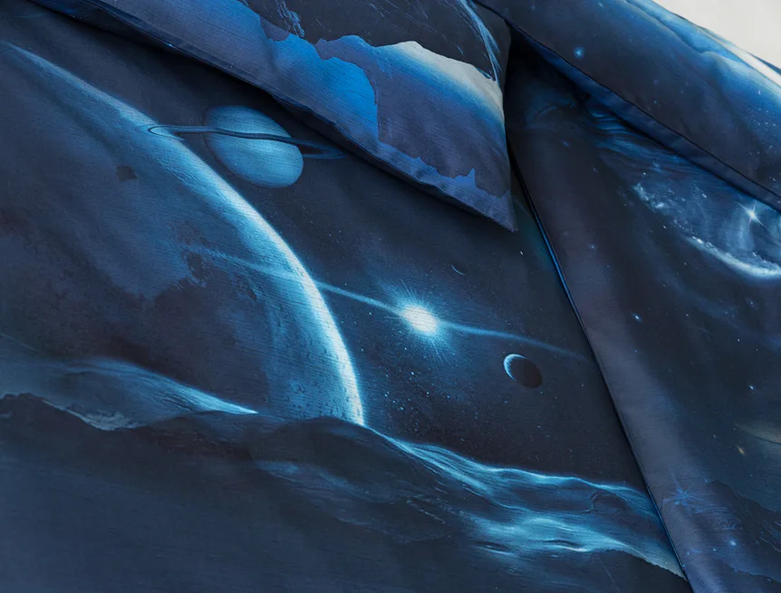 Objevte tajemství vesmíru přímo z vaší ložnice s hebkým bavlněným povlečením Galaxie. Tmavě modrý podklad zdobí motivy planet. Díky nejmodernějšímu digitálním tisku vyniká vzor v precizním detailu. Přeneste se do vesmíru každou noc a nechte své sny volně plynout mezi hvězdami.