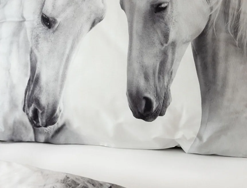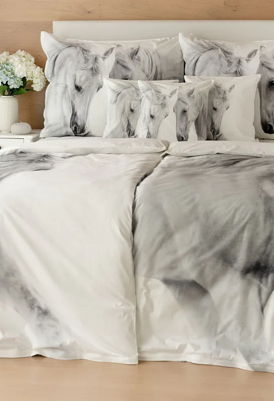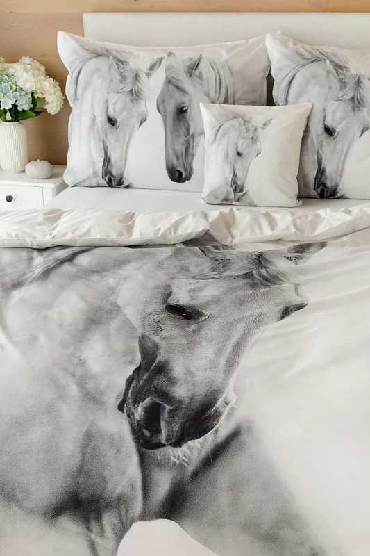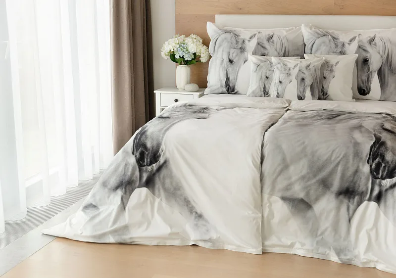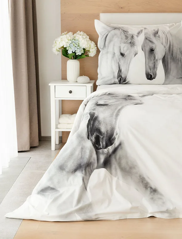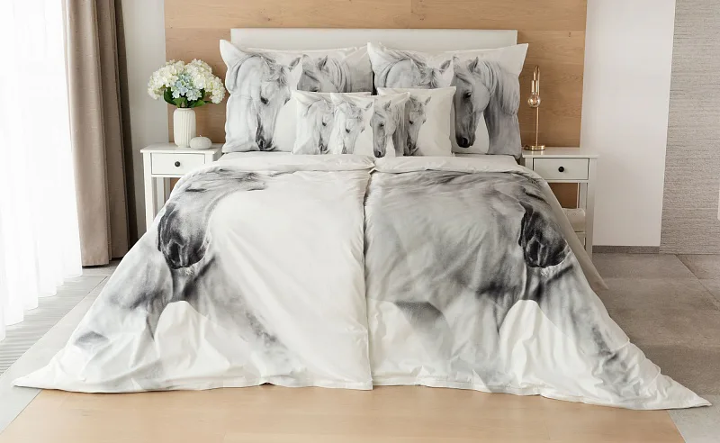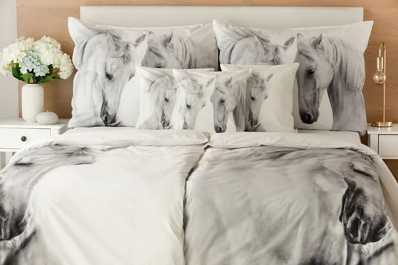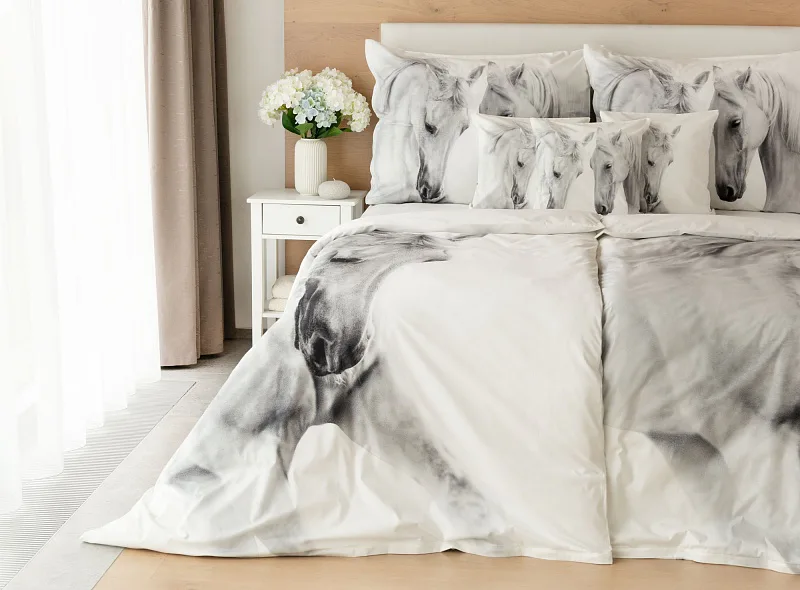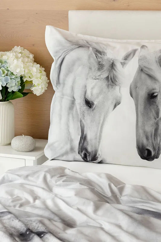 Nesmírně uklidňujcí a něžné zpracování oblíbeného motivu přináší povlečení Galus. Silueta koně na bílém podkladu vás naplní harmonií v každém okamžiku dne.