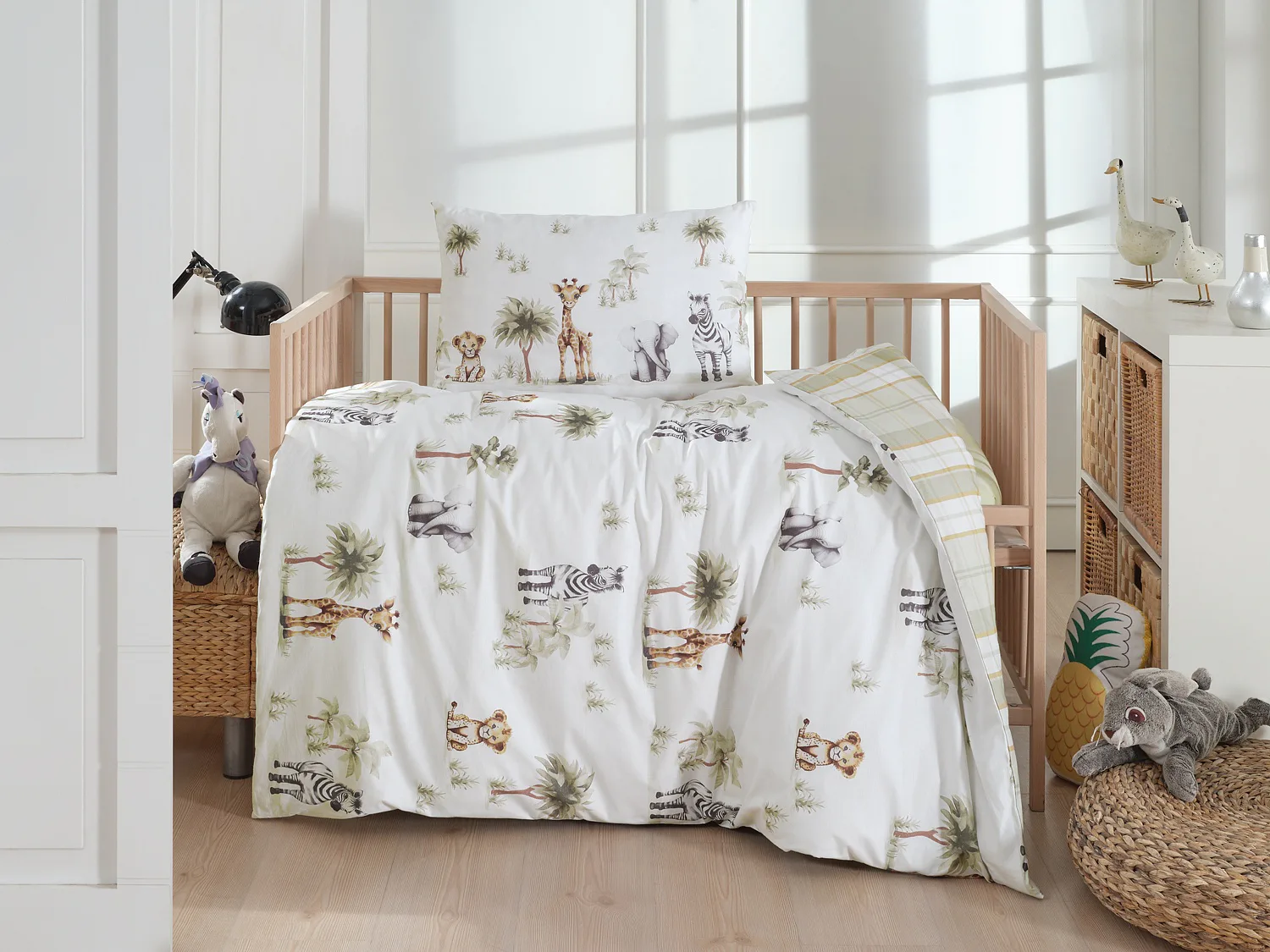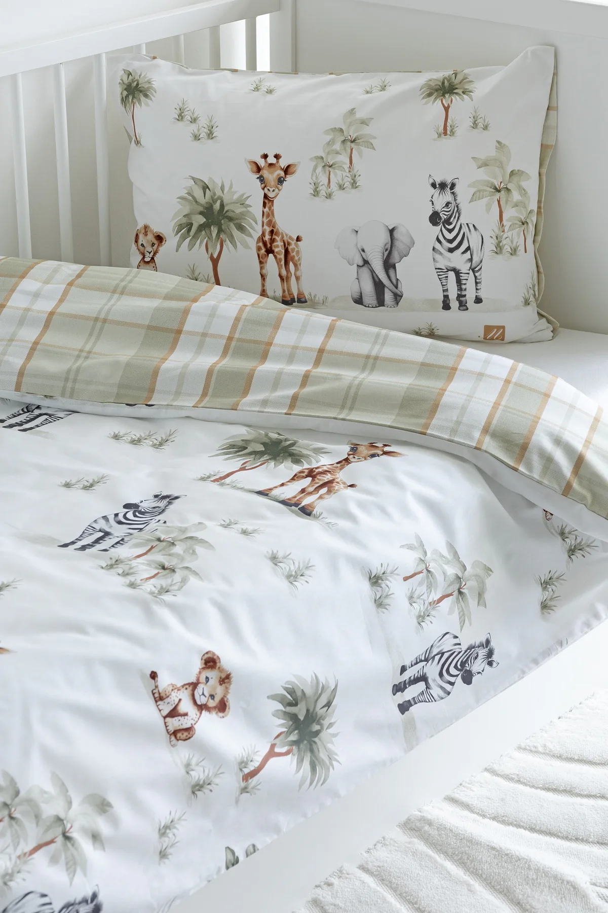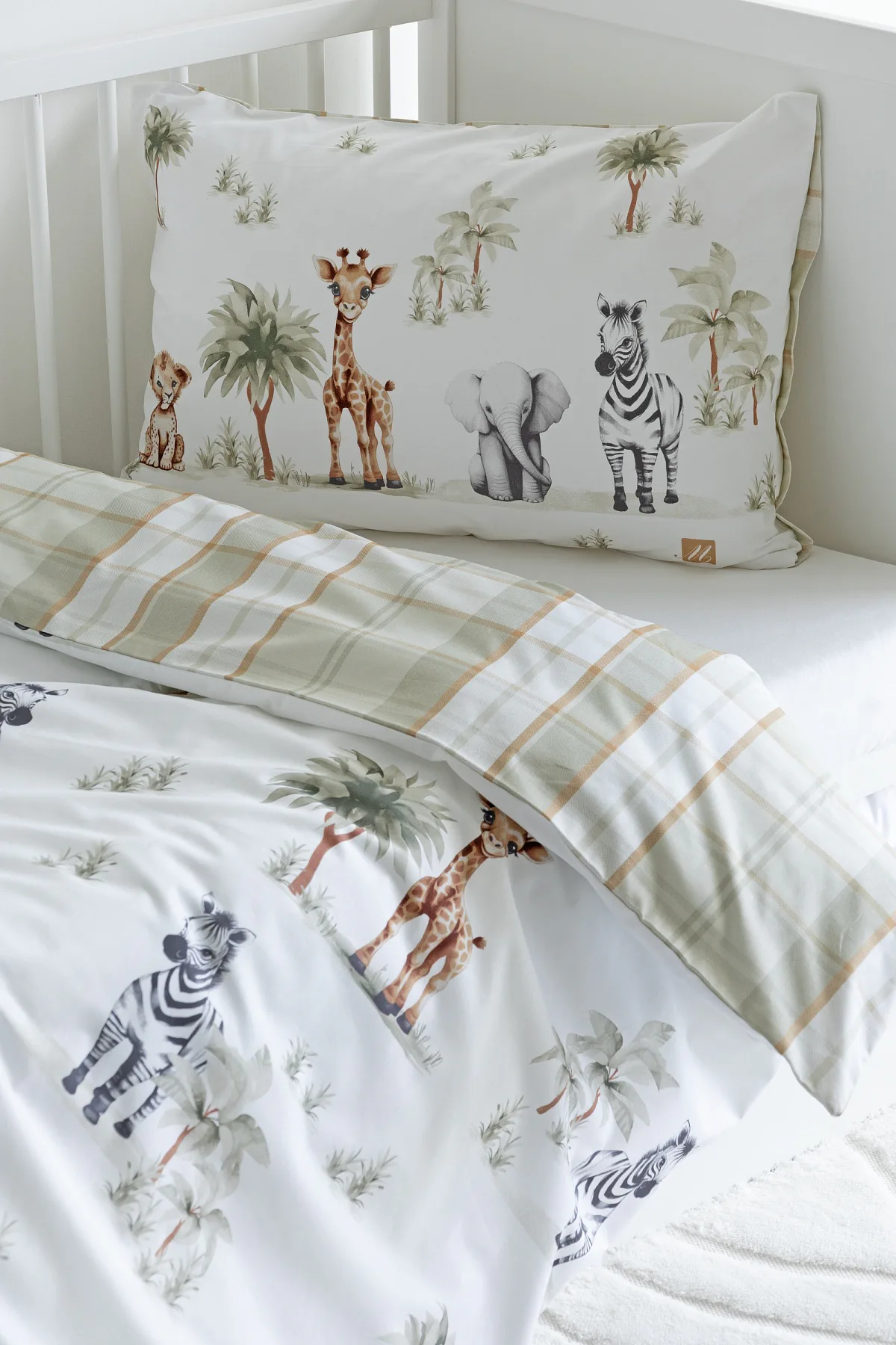 Povlak na polštář i na přikrývku zachycuje na vrchní straně motiv zvířátek, spodní stranu tvoří jemné zelenohnědé káro. Povlečení je vyrobeno ze 100% bavlny a je opatřeno praktickým zipovým uzávěrem.