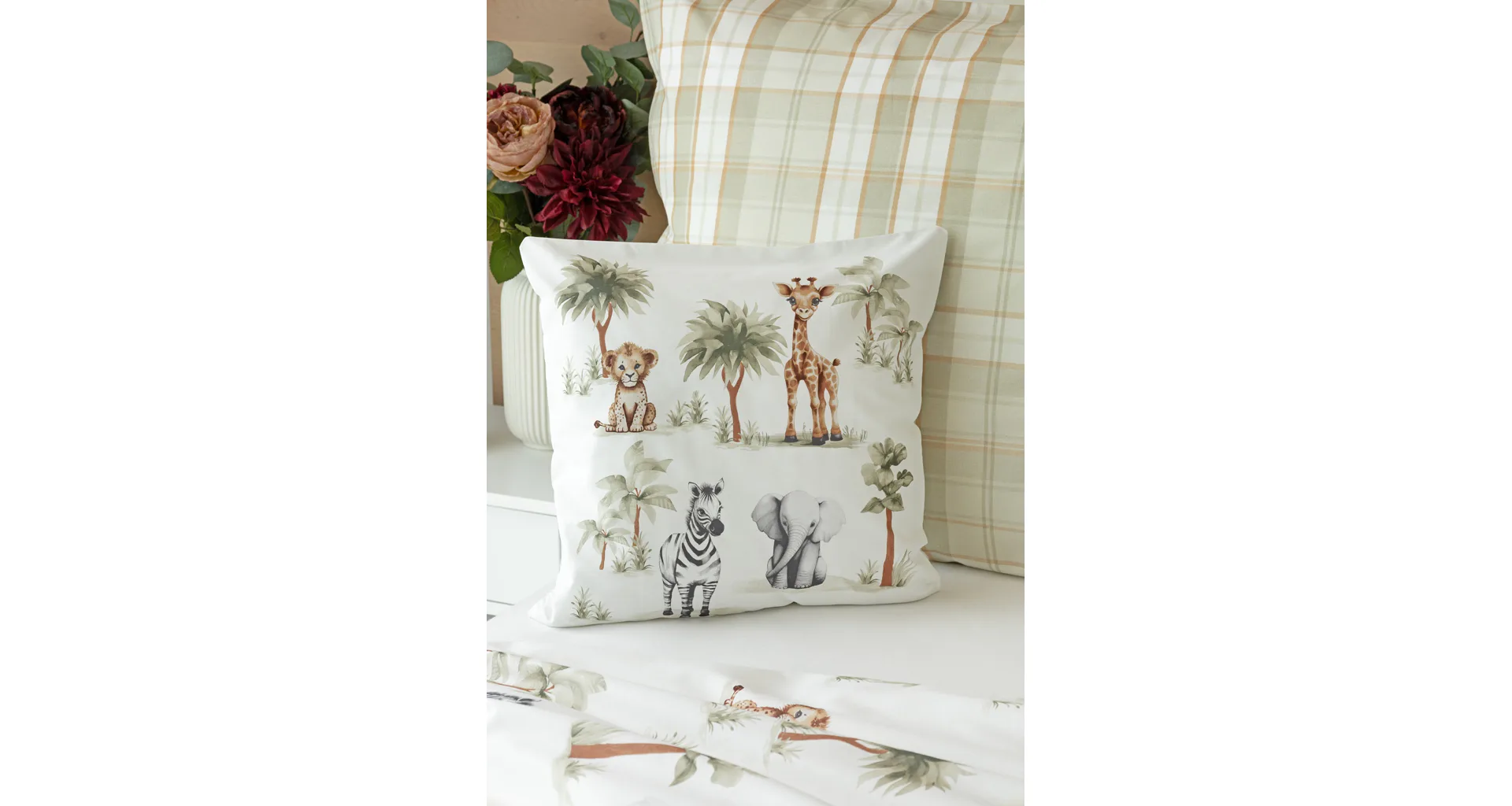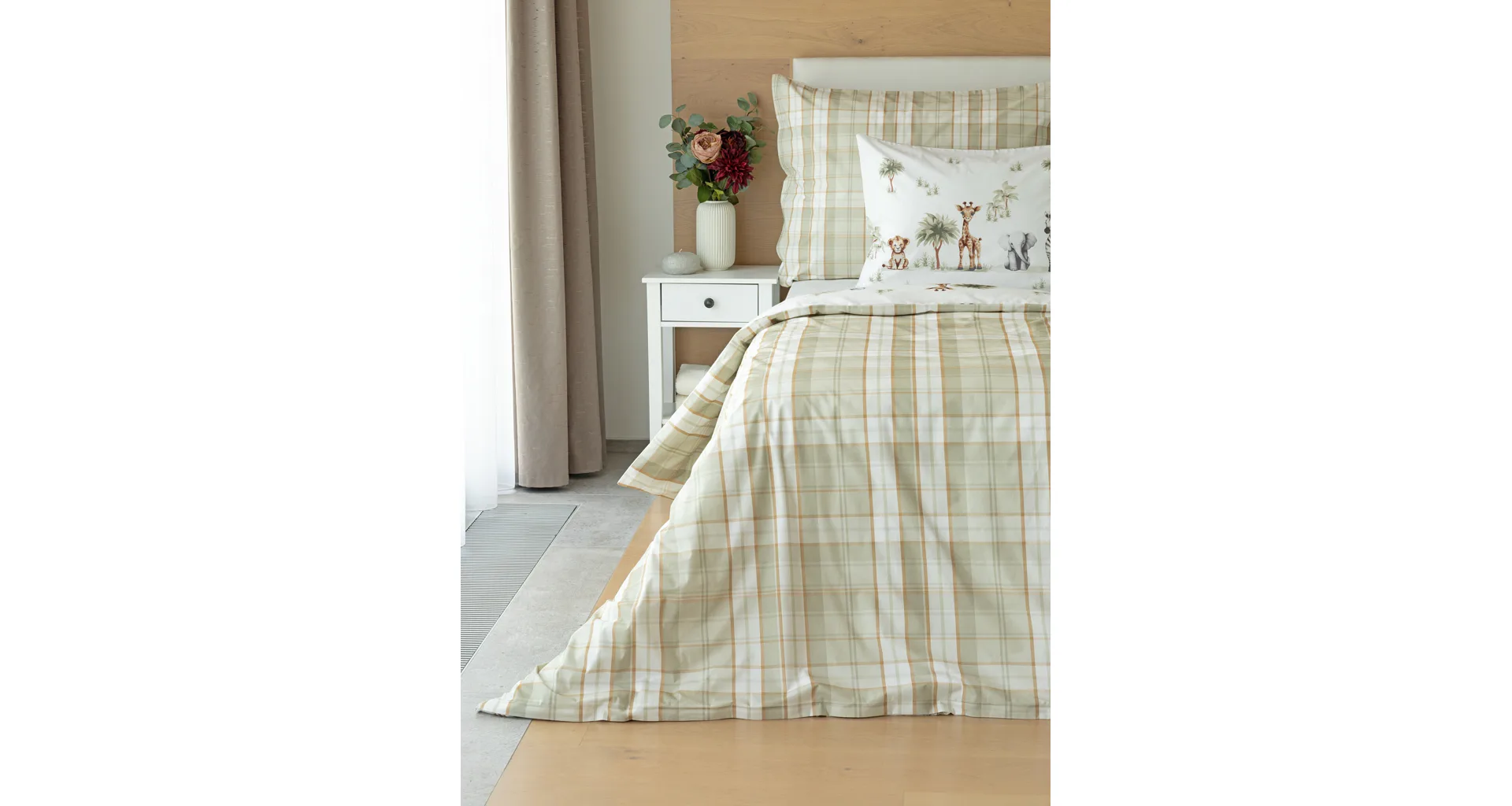 Povlak na polštář i na přikrývku zachycuje na vrchní straně motiv zvířátek, spodní stranu tvoří jemné zelenohnědé káro. Povlečení je vyrobeno ze 100% bavlny a je opatřeno praktickým zipovým uzávěrem.