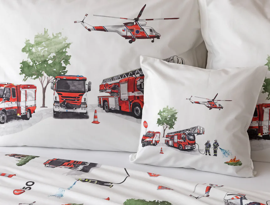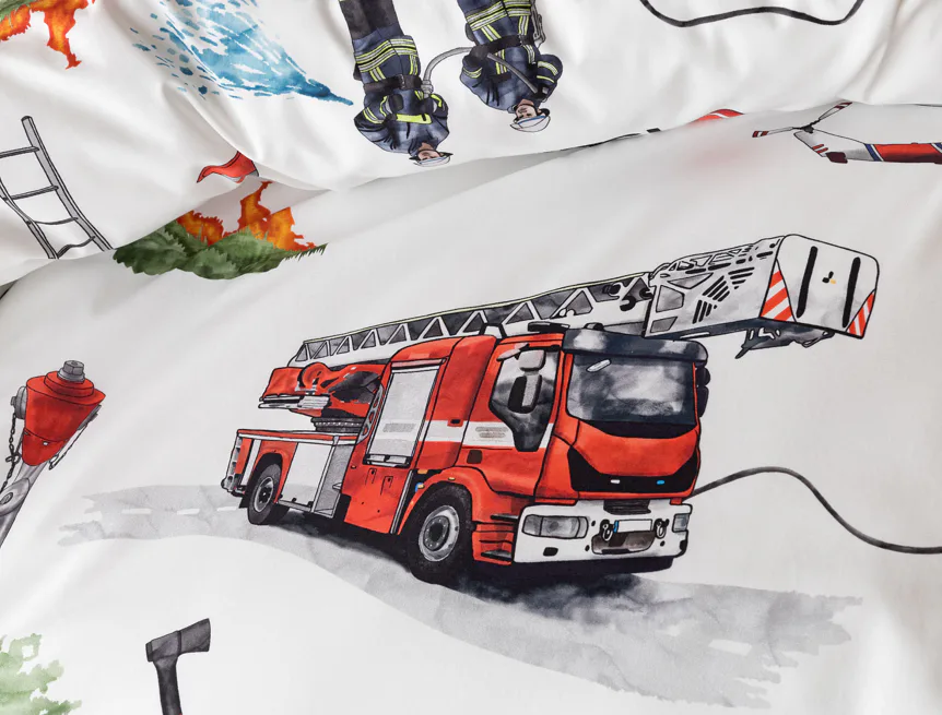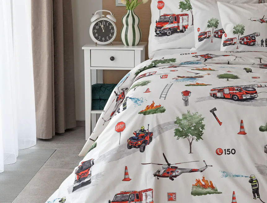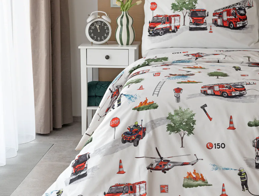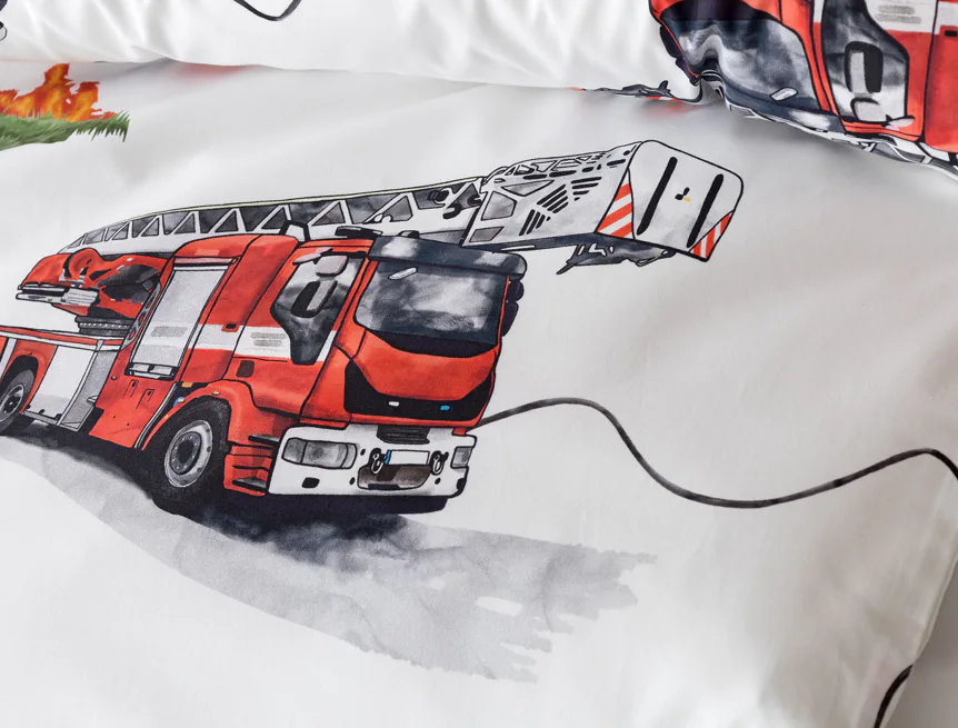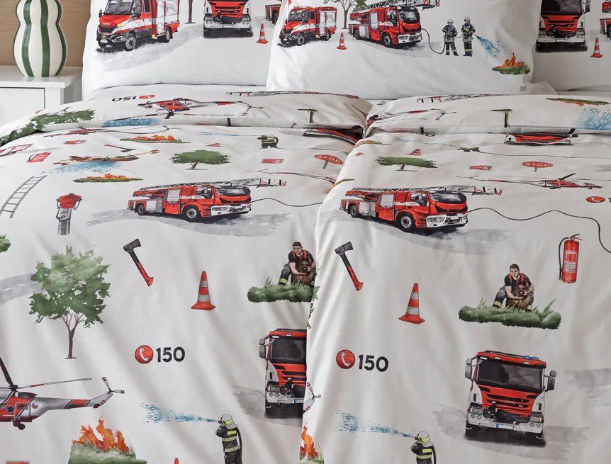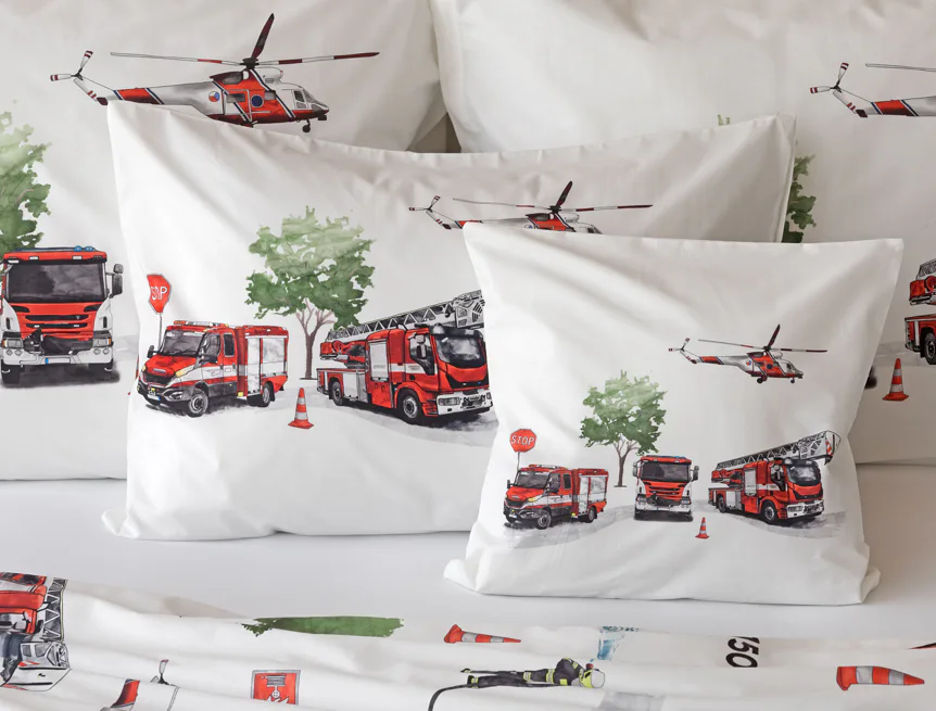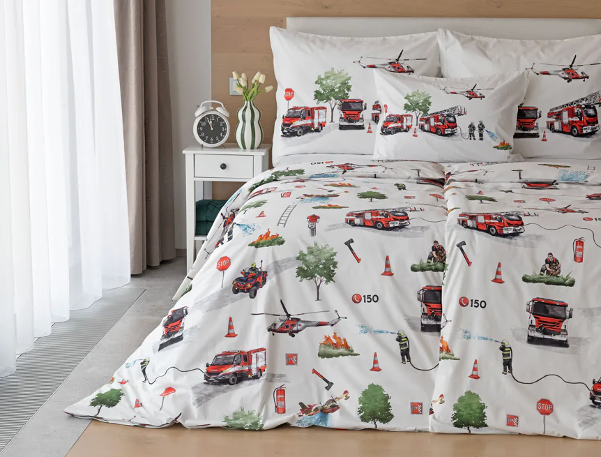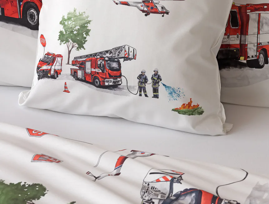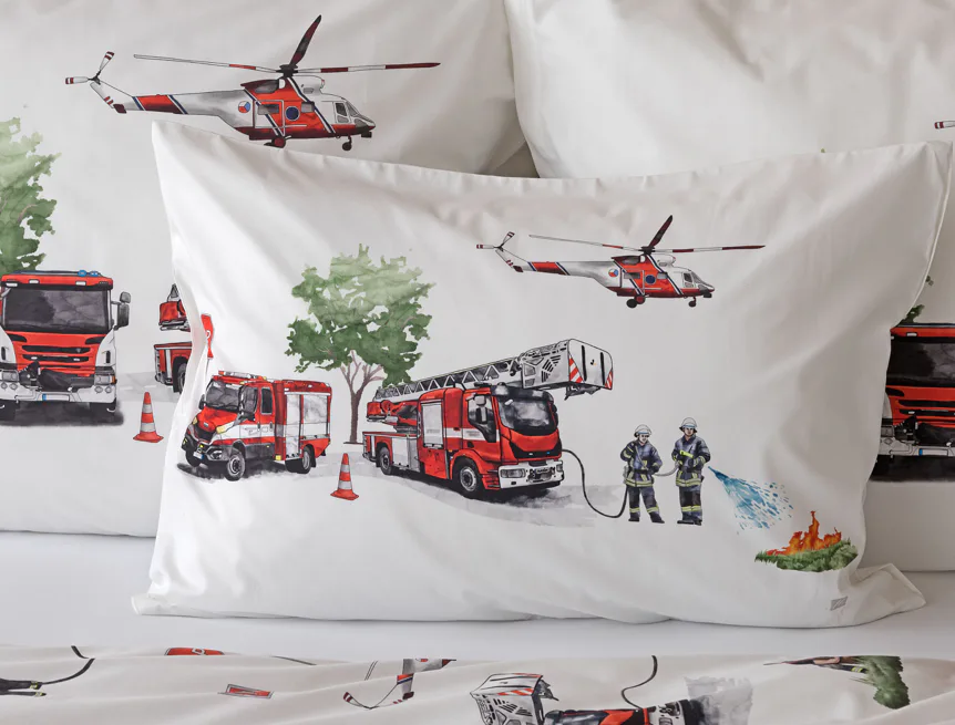 Dětské povlečení Hasiči s motivy hasičské techniky potěší všechny malé milovníky záchranářských dobrodružství. Na bílém podkladu ožívají realistické ilustrace hasičských aut, vrtulníku, čtyřkolky i požárníků v akci. Dynamický motiv doplňují dopravní značky, kužely a další detaily, které vytvářejí hravou atmosféru. Zatímco malí záchranáři sní o dobrodružstvích, o jejich spokojený spánek se postará hebká prvotřídní bavlna.