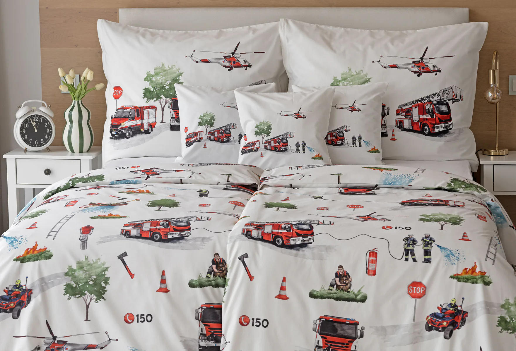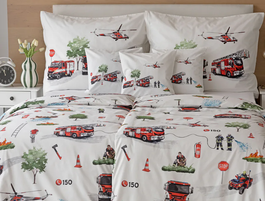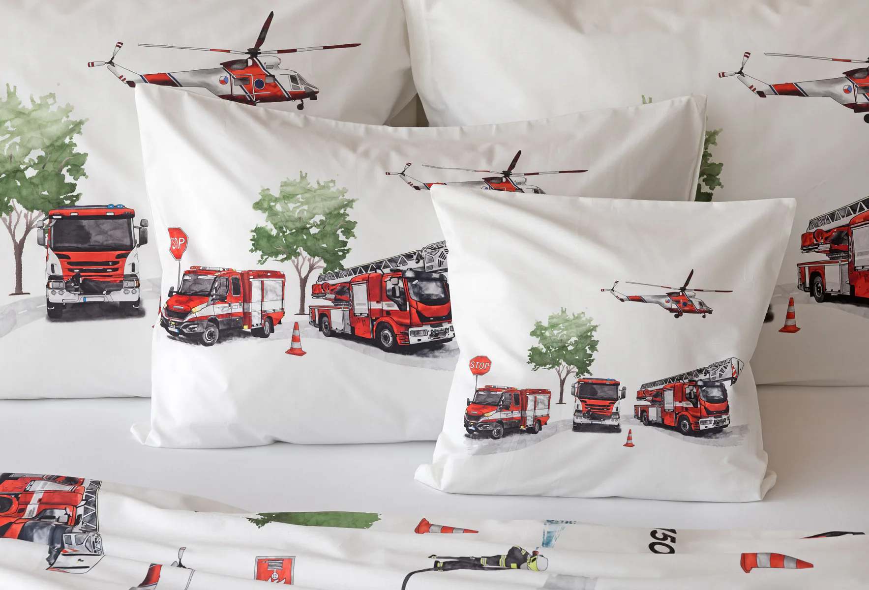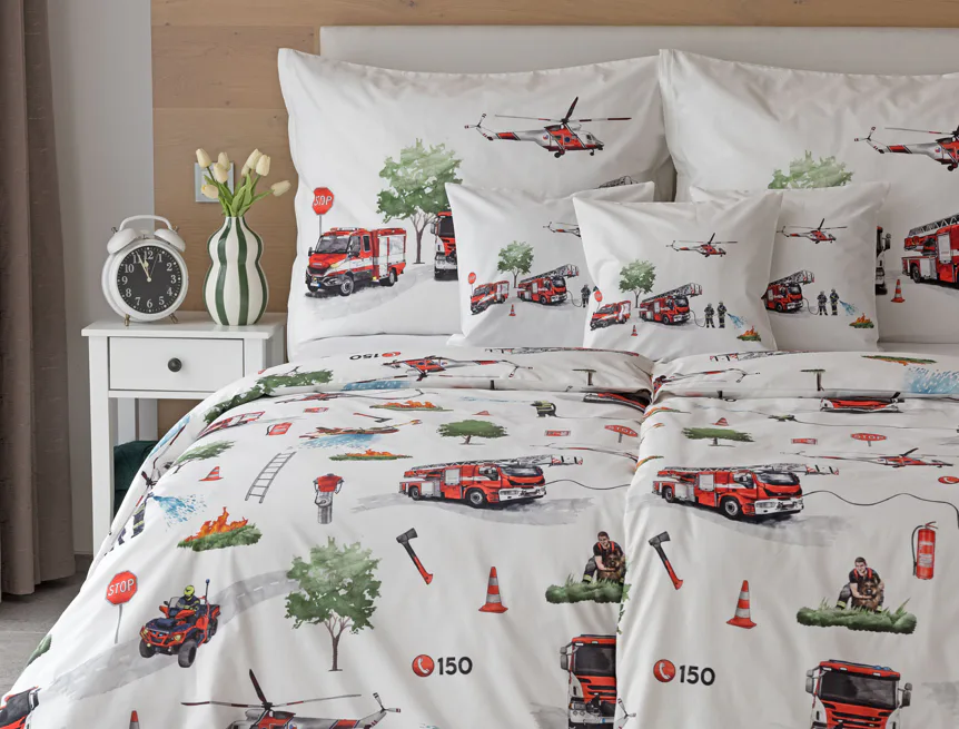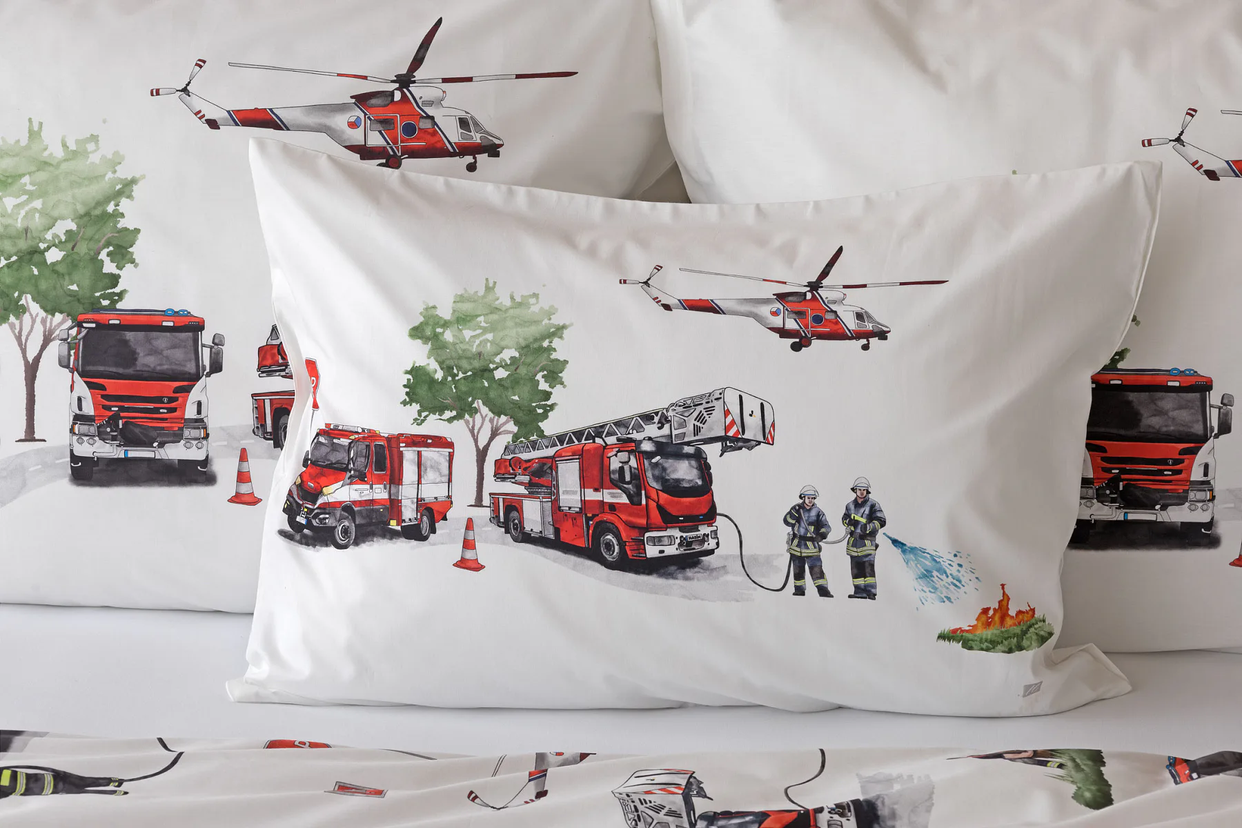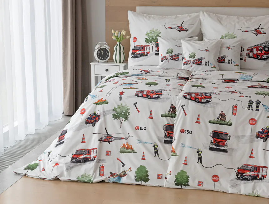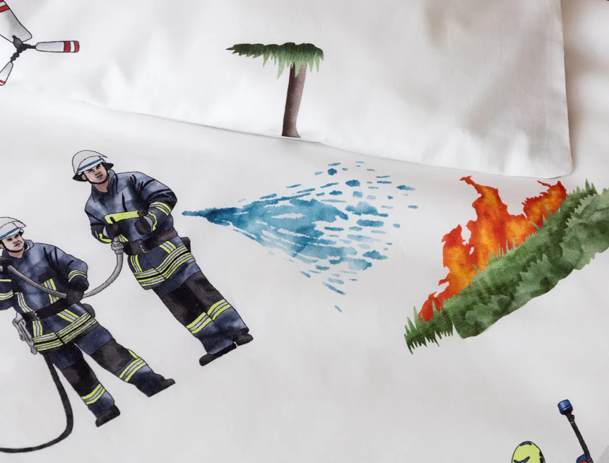 Dětské povlečení Hasiči s motivy hasičské techniky potěší všechny malé milovníky záchranářských dobrodružství. Na bílém podkladu ožívají realistické ilustrace hasičských aut, vrtulníku, čtyřkolky i požárníků v akci. Dynamický motiv doplňují dopravní značky, kužely a další detaily, které vytvářejí hravou atmosféru. Zatímco malí záchranáři sní o dobrodružstvích, o jejich spokojený spánek se postará hebká prvotřídní bavlna.