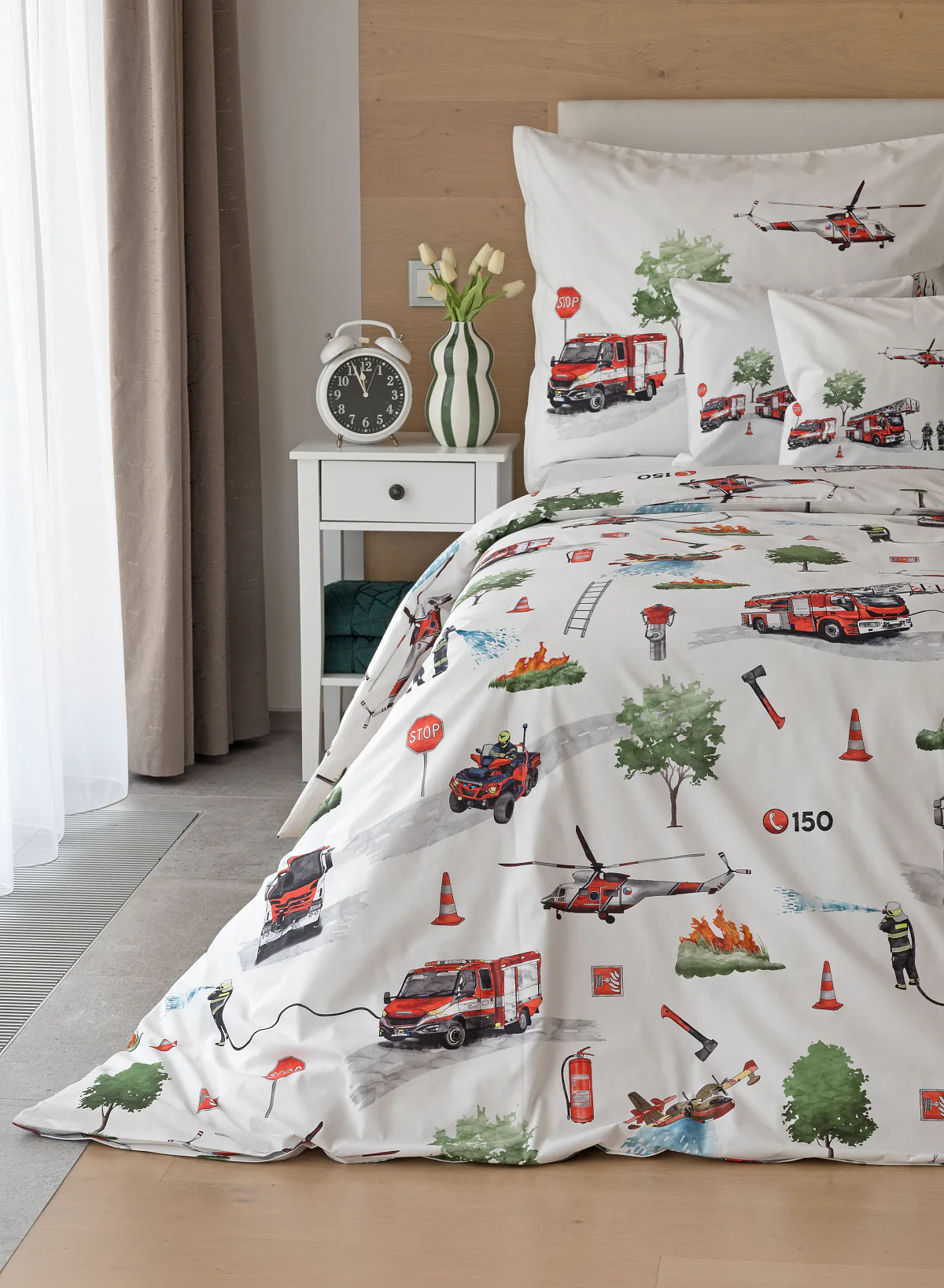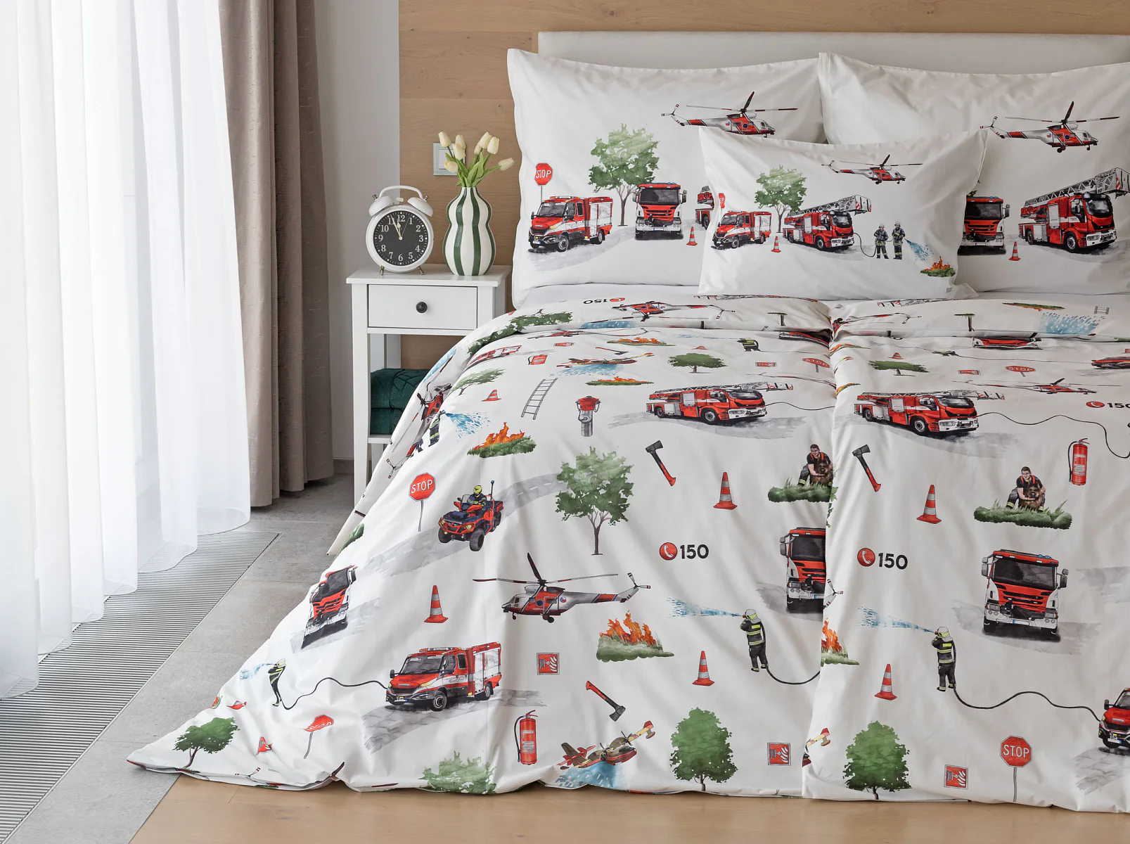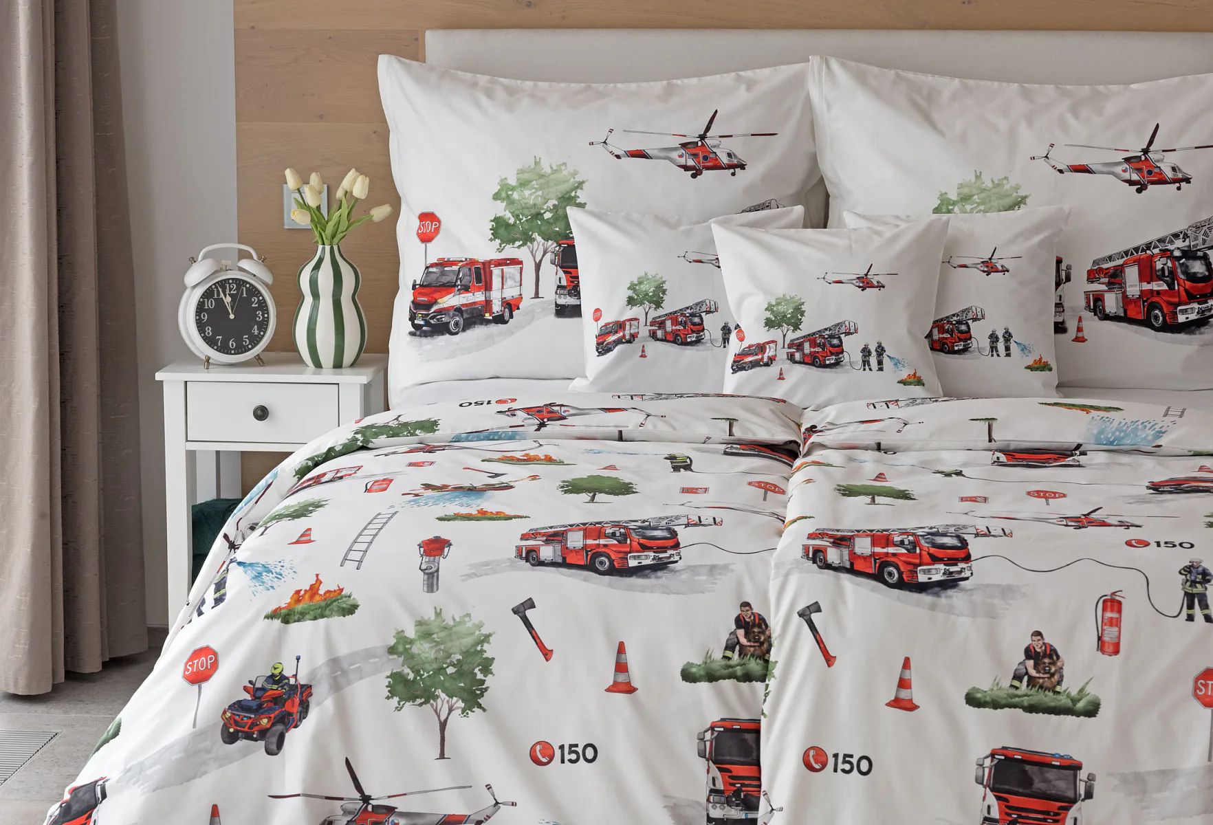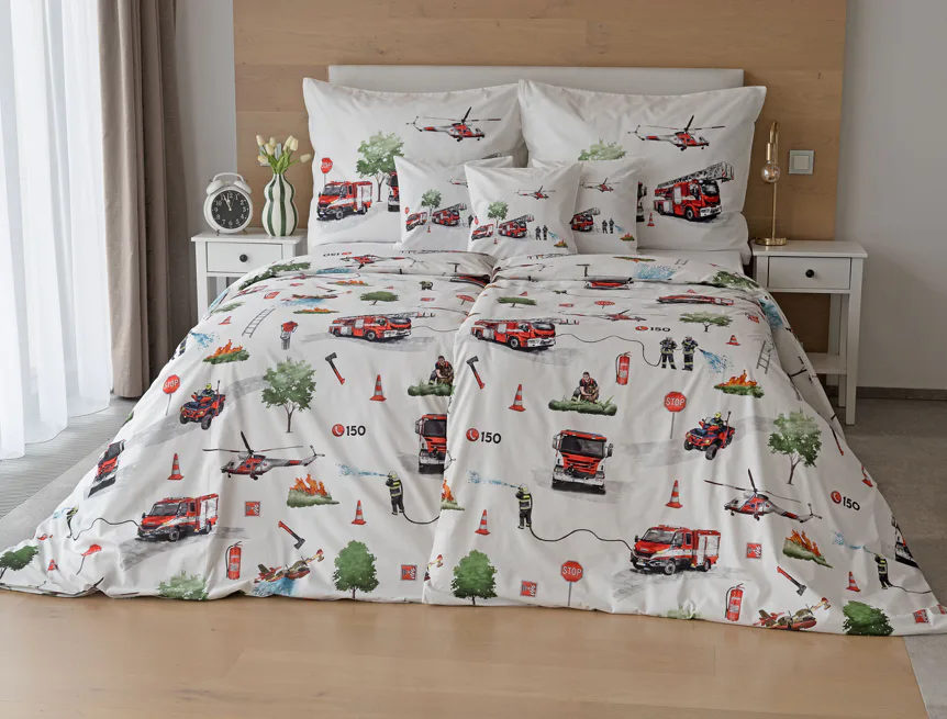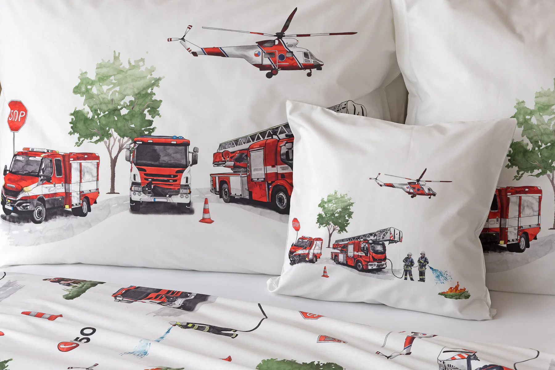 Dětské povlečení Hasiči s motivy hasičské techniky potěší všechny malé milovníky záchranářských dobrodružství. Na bílém podkladu ožívají realistické ilustrace hasičských aut, vrtulníku, čtyřkolky i požárníků v akci. Dynamický motiv doplňují dopravní značky, kužely a další detaily, které vytvářejí hravou atmosféru. Zatímco malí záchranáři sní o dobrodružstvích, o jejich spokojený spánek se postará hebká prvotřídní bavlna.