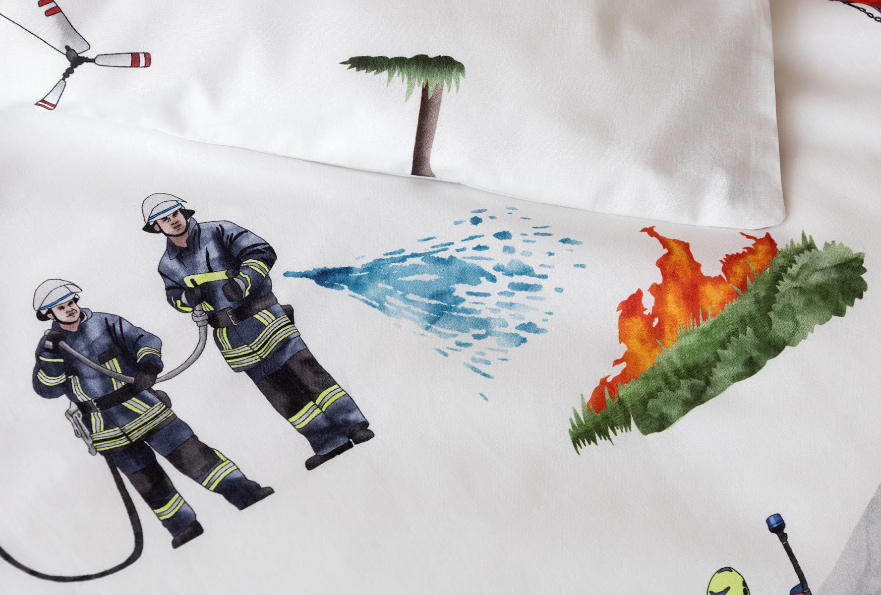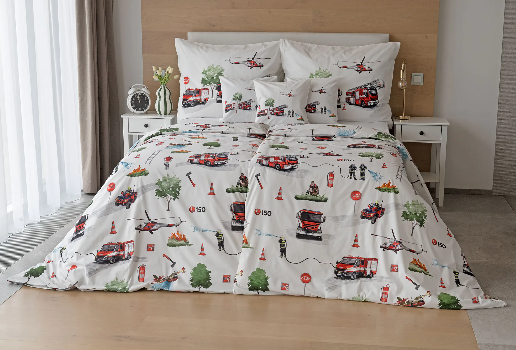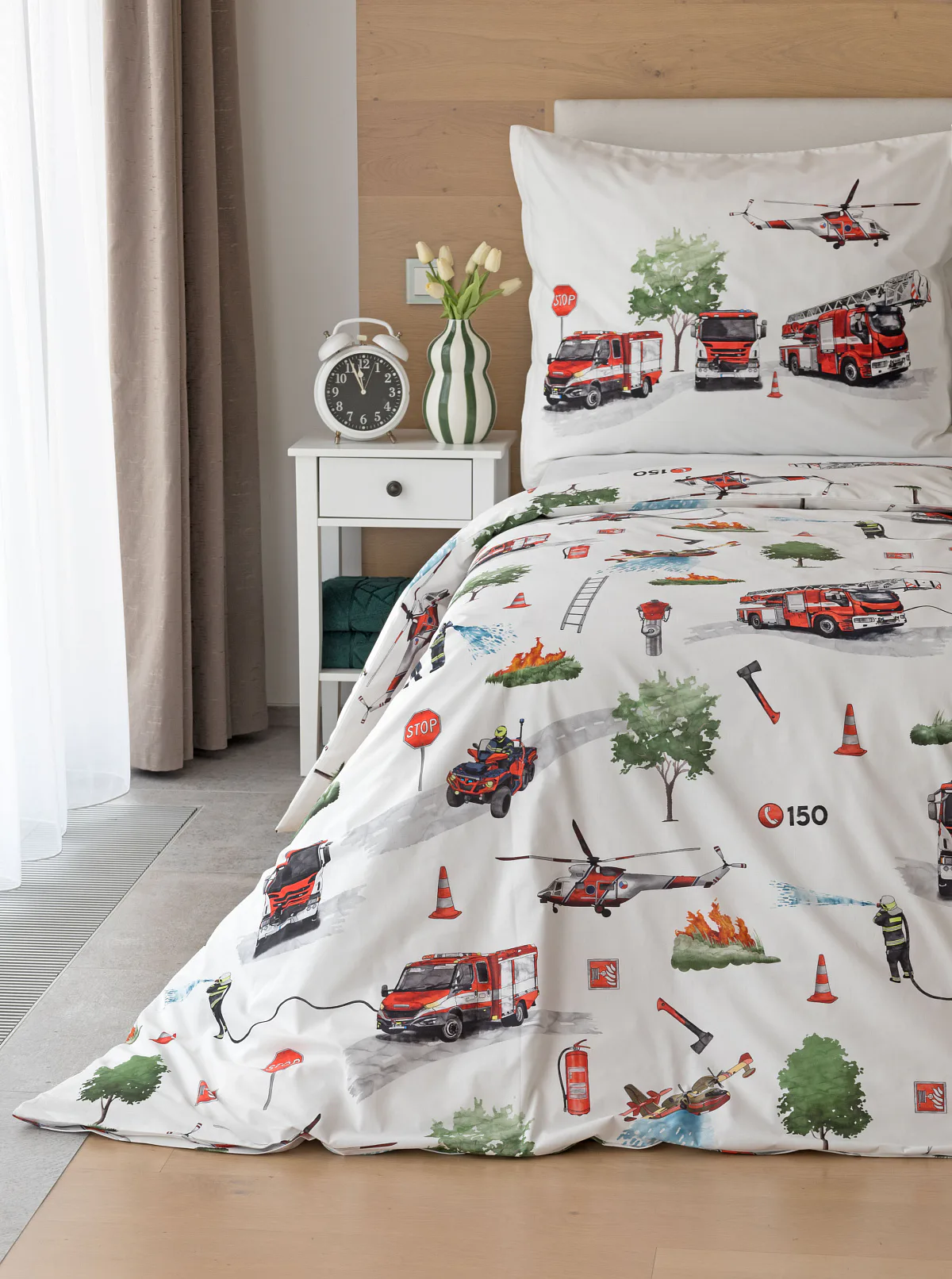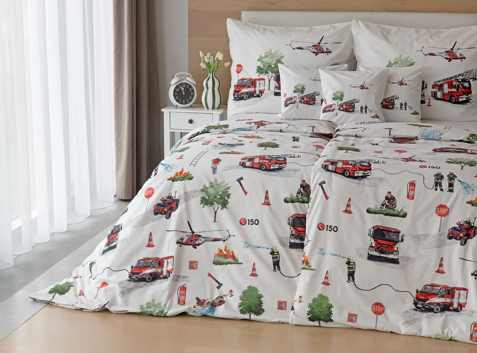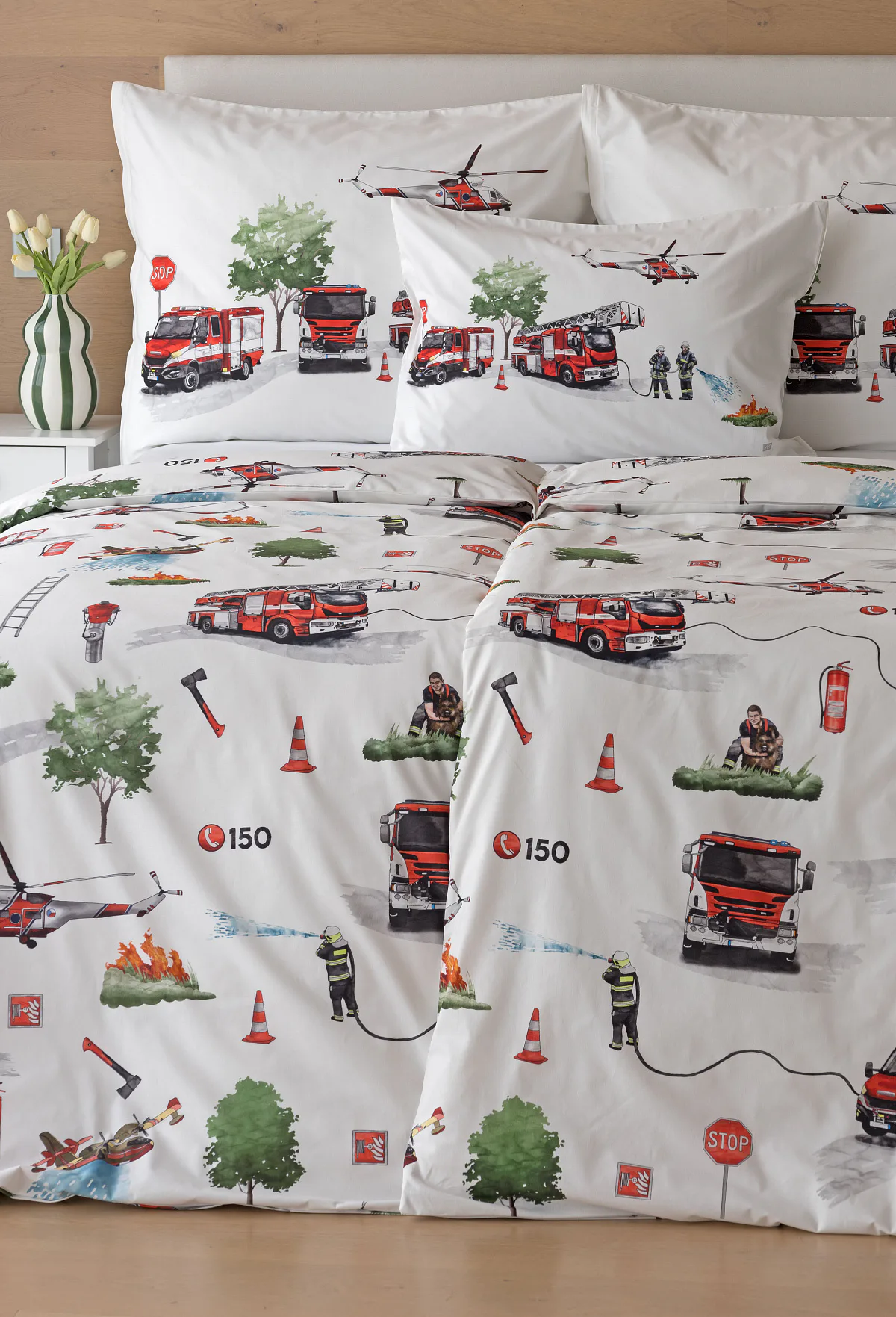 Dětské povlečení Hasiči s motivy hasičské techniky potěší všechny malé milovníky záchranářských dobrodružství. Na bílém podkladu ožívají realistické ilustrace hasičských aut, vrtulníku, čtyřkolky i požárníků v akci. Dynamický motiv doplňují dopravní značky, kužely a další detaily, které vytvářejí hravou atmosféru. Zatímco malí záchranáři sní o dobrodružstvích, o jejich spokojený spánek se postará hebká prvotřídní bavlna.