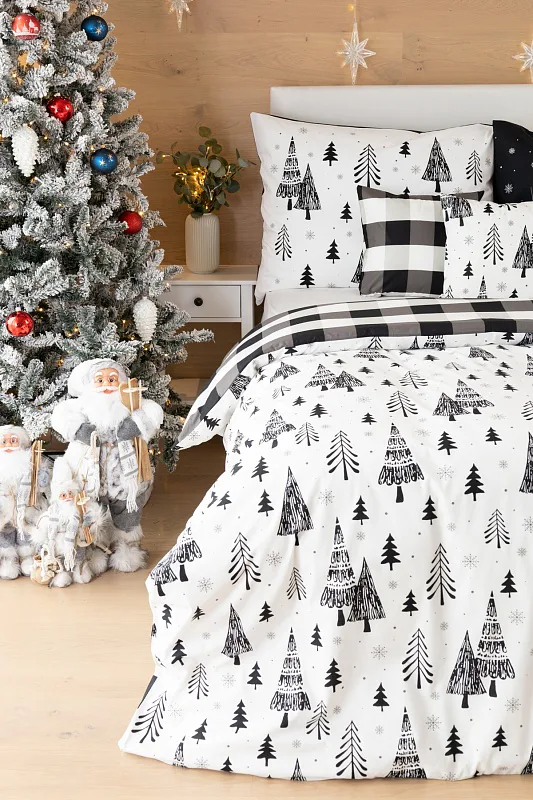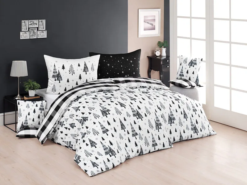 Povlak na přikrývku je z jedné strany posetý kresbou menších a větších stromků, sněhových vloček a drobných puntíků. Spodní strana cíchy je tvořena bílou, šedou a černou kostkou, jak je částečně vyobrazeno na fotografii. Povlak na polštář je z každé strany jiný - zadní strana s černým podkladem zachycuje bílé sněhové vločky a řadu stromků na spodní straně. Povlečení je opatřeno komfortním zipovým uzávěrem.