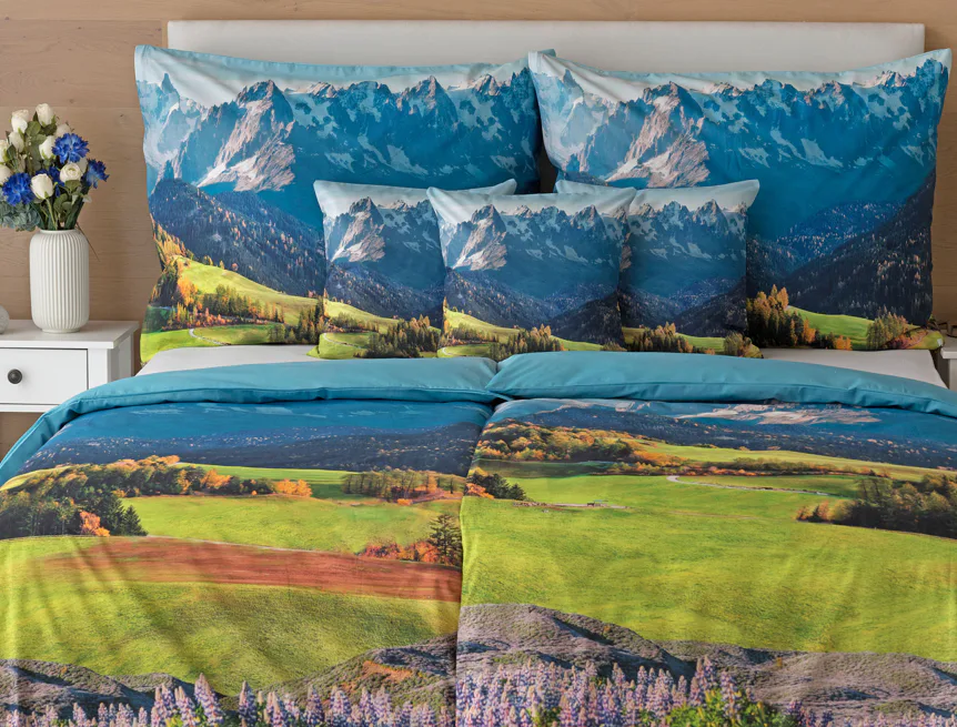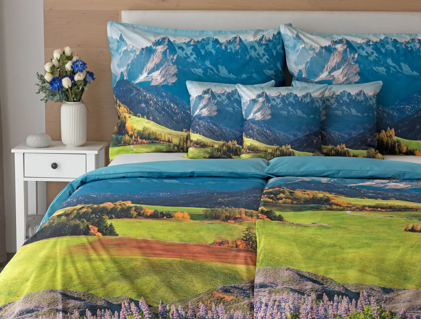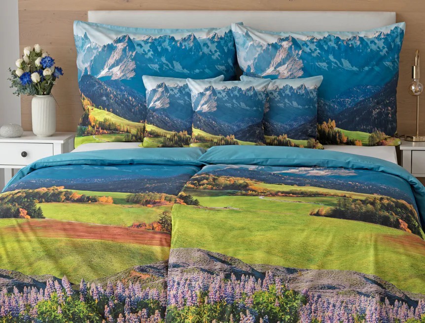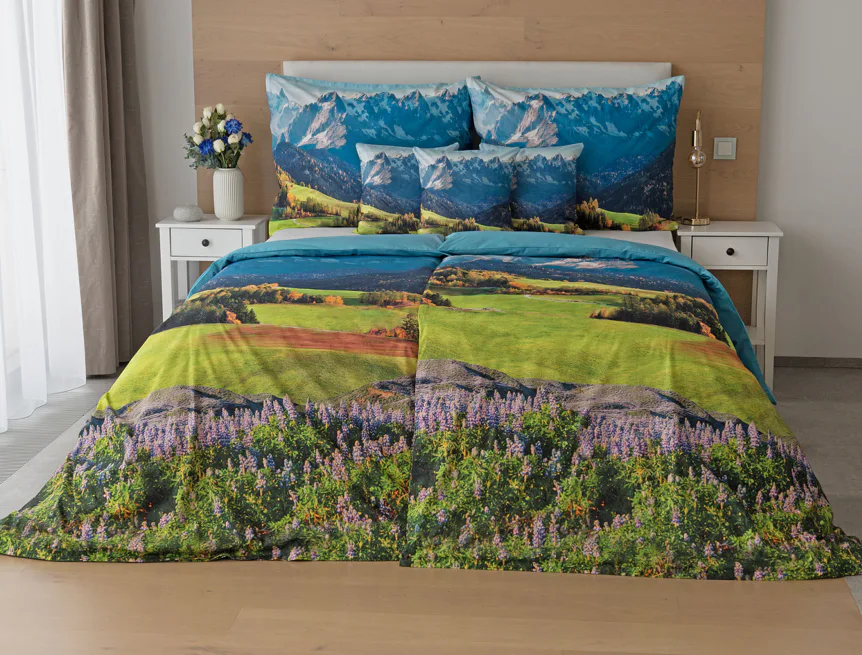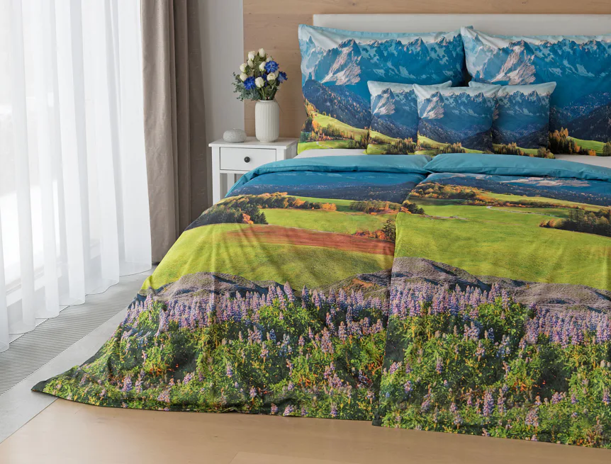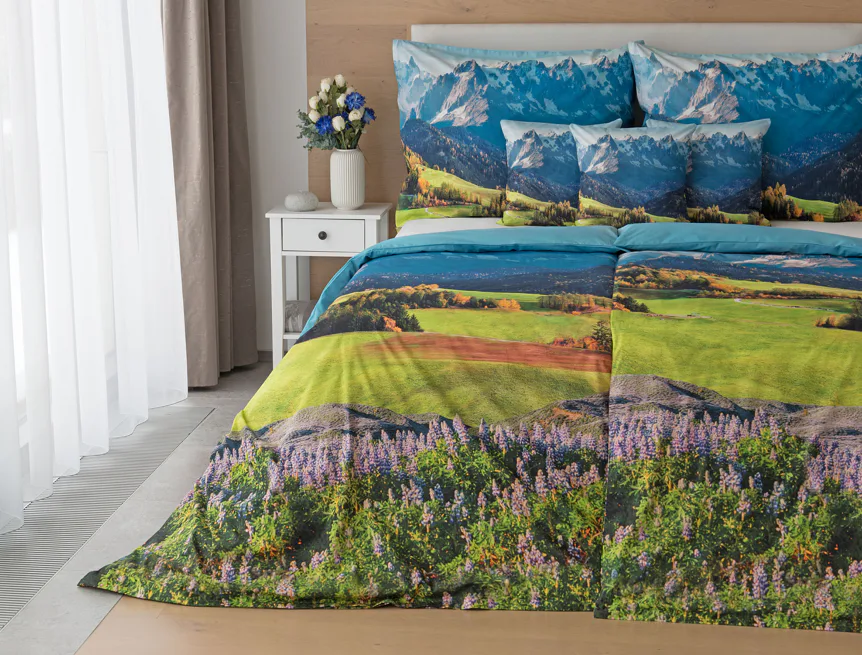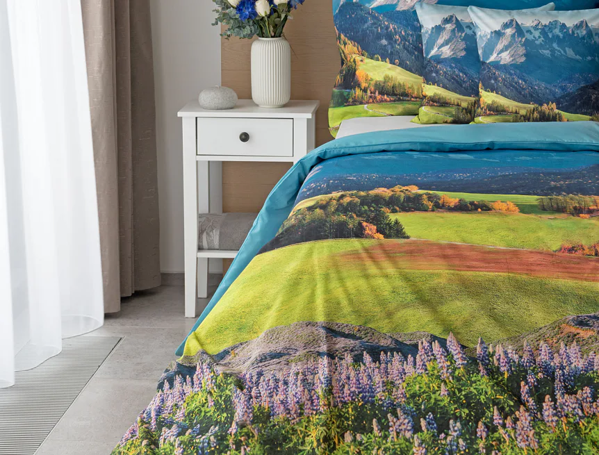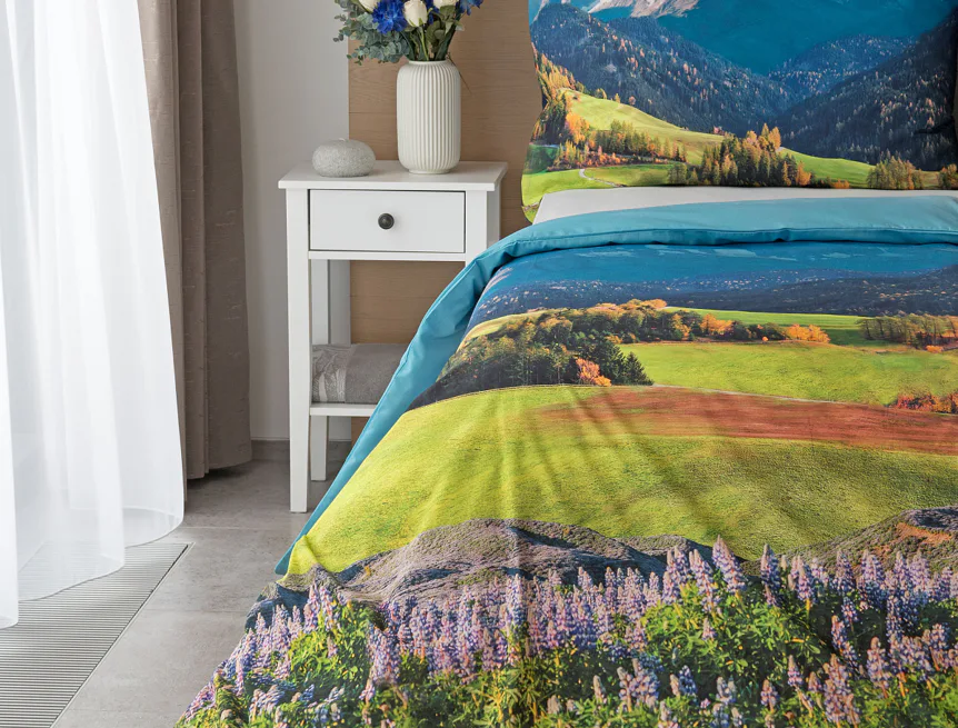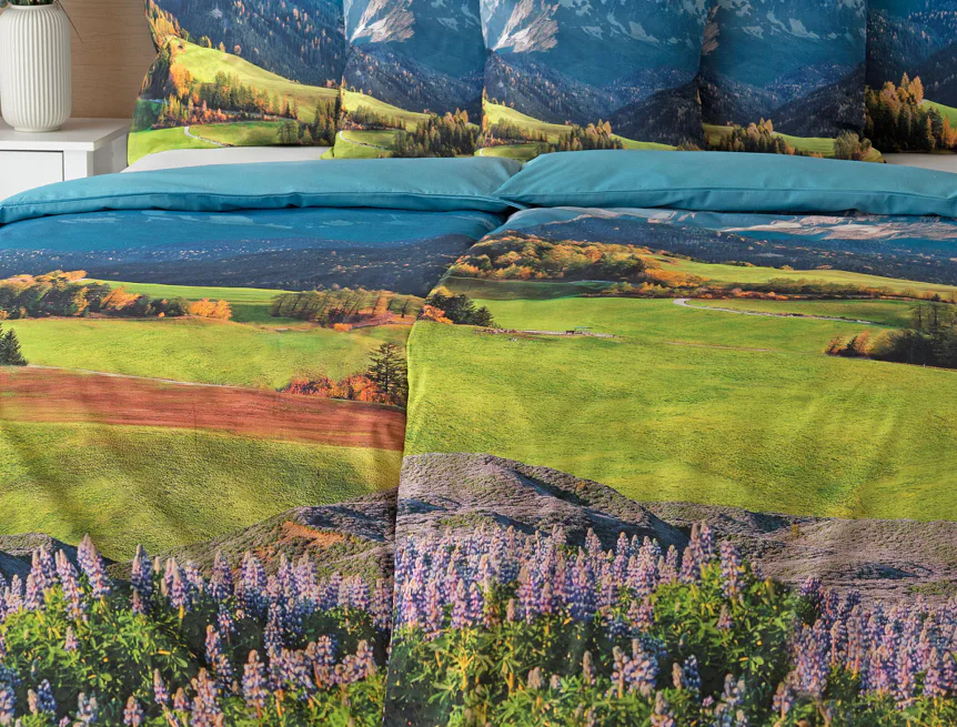 Ložní povlečení Hory s panoramatickým motivem horské krajiny vnese do vaší ložnice pocit svobody, klidu a propojení s přírodou. Rozkvetlé louky, zelené svahy a majestátní horské štíty vytvářejí harmonickou scenérii. Syté barvy a detailní tisk dodávají povlečení přirozený charakter, díky kterému se stane dominantou interiéru. Ideální volba pro milovníky přírody, hor a cestování. Dopřejte si každý večer pocit, jako byste usínali uprostřed rozkvetlé horské krajiny.