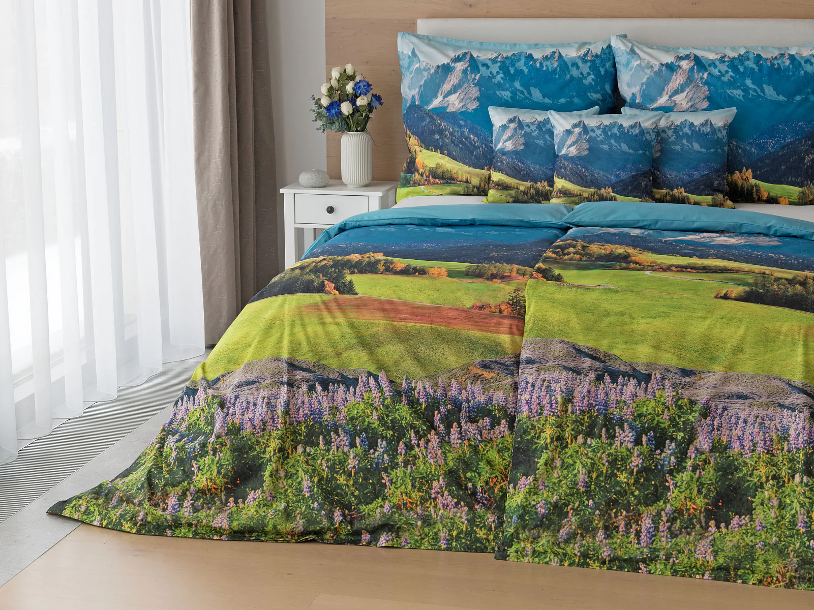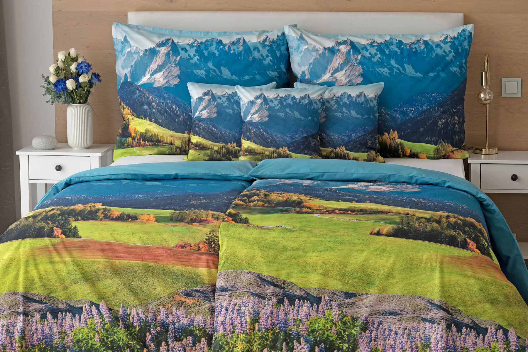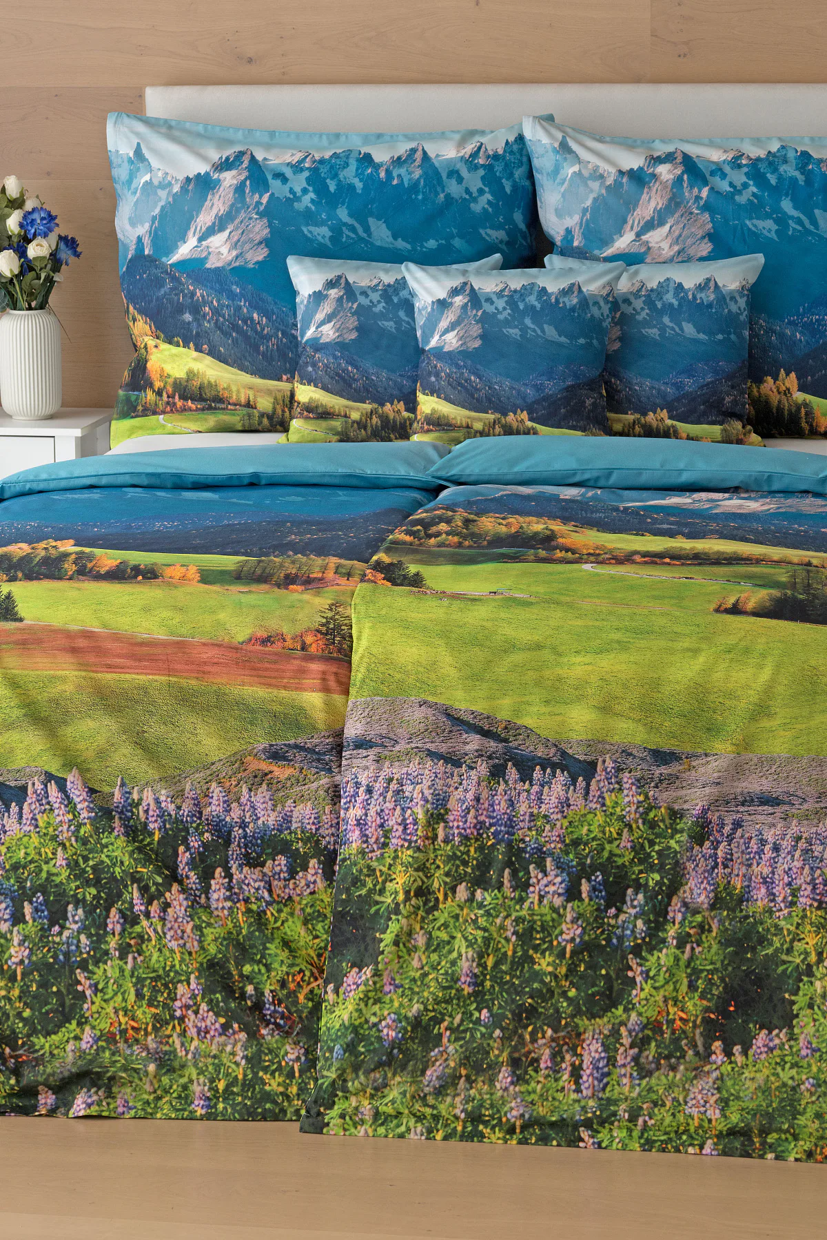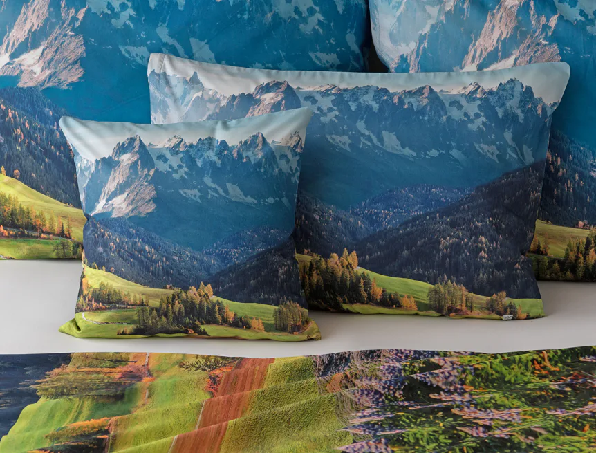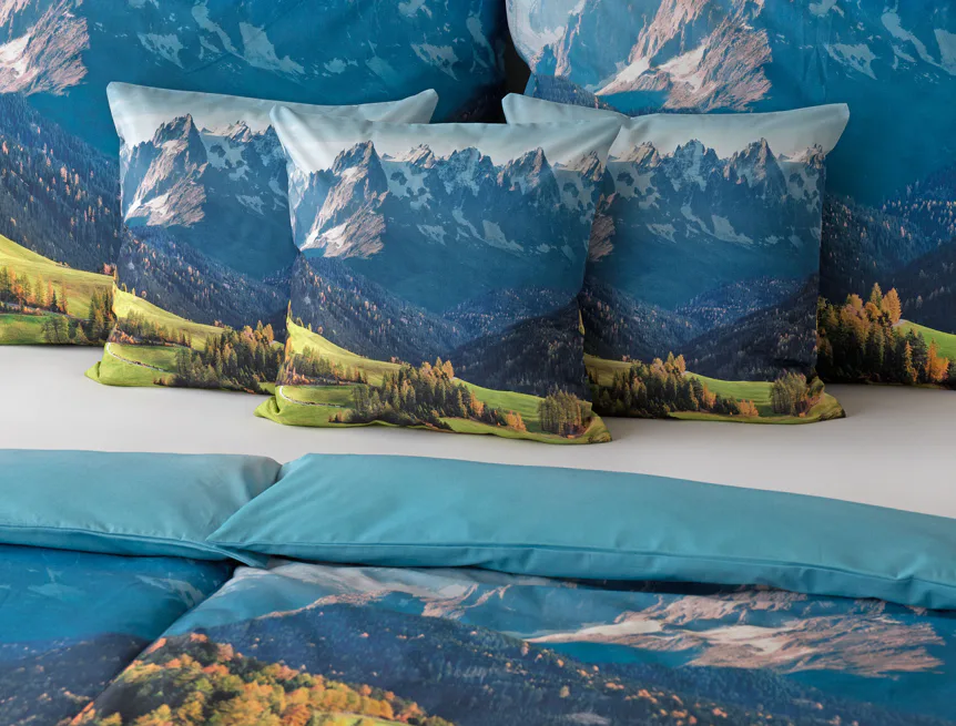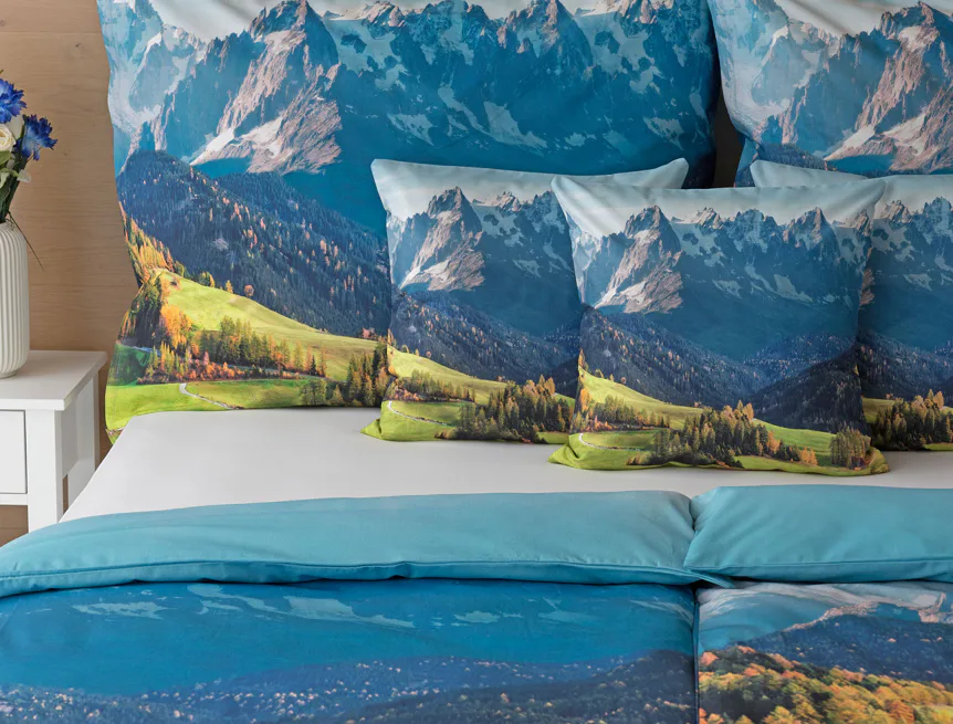 Ložní povlečení Hory s panoramatickým motivem horské krajiny vnese do vaší ložnice pocit svobody, klidu a propojení s přírodou. Rozkvetlé louky, zelené svahy a majestátní horské štíty vytvářejí harmonickou scenérii. Syté barvy a detailní tisk dodávají povlečení přirozený charakter, díky kterému se stane dominantou interiéru. Ideální volba pro milovníky přírody, hor a cestování. Dopřejte si každý večer pocit, jako byste usínali uprostřed rozkvetlé horské krajiny.