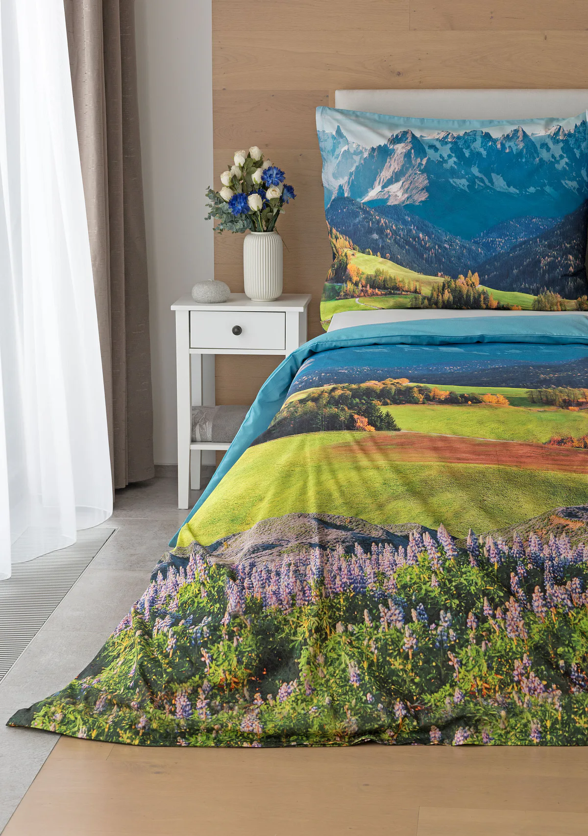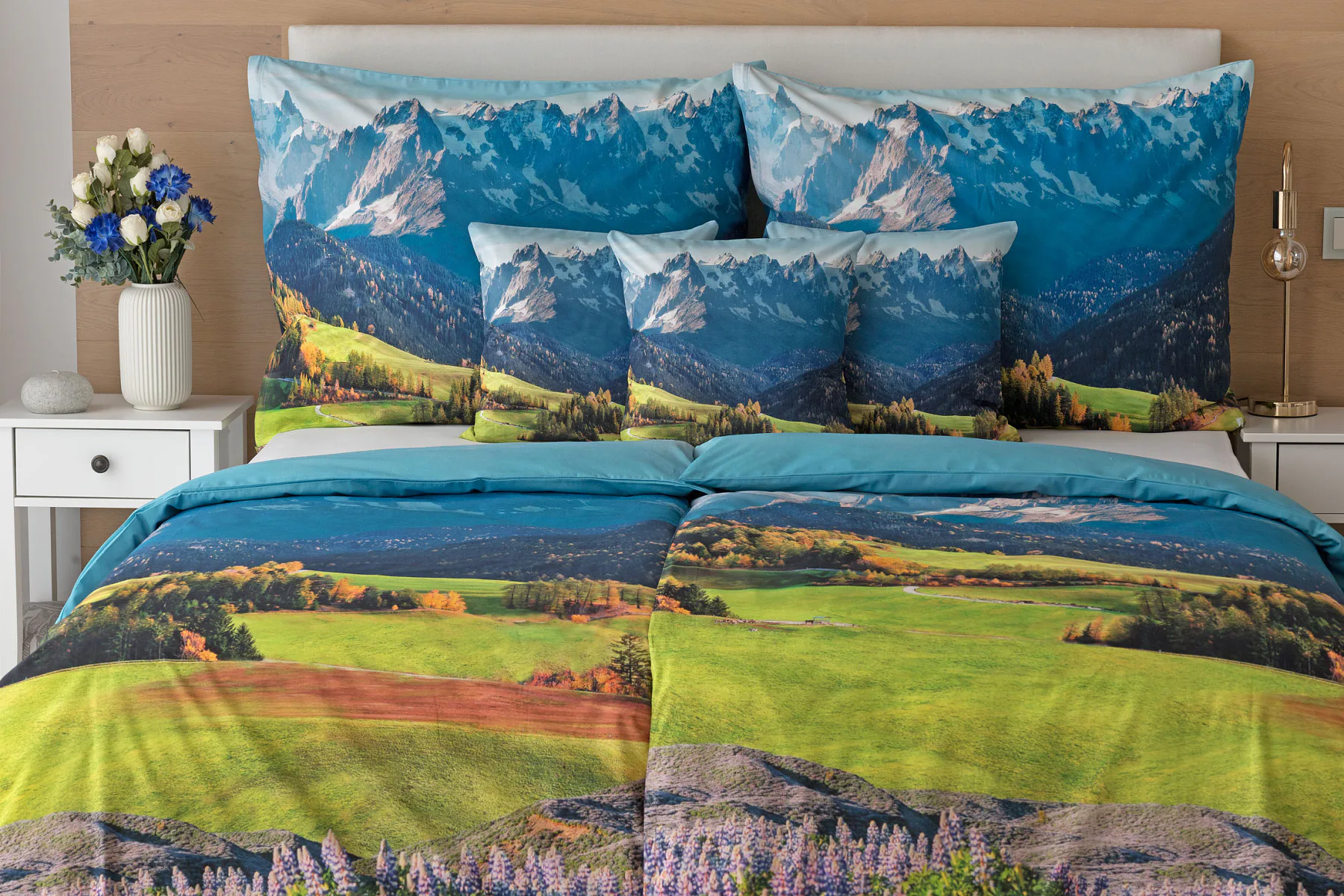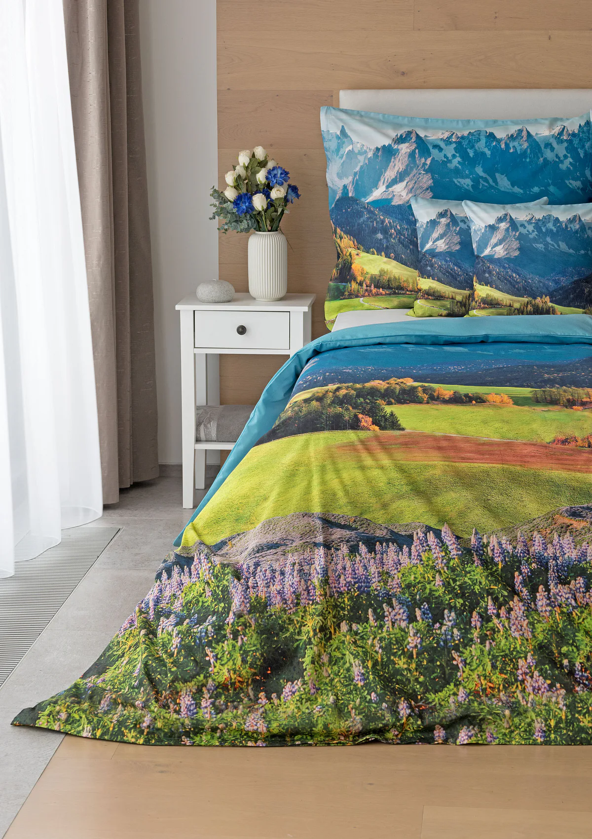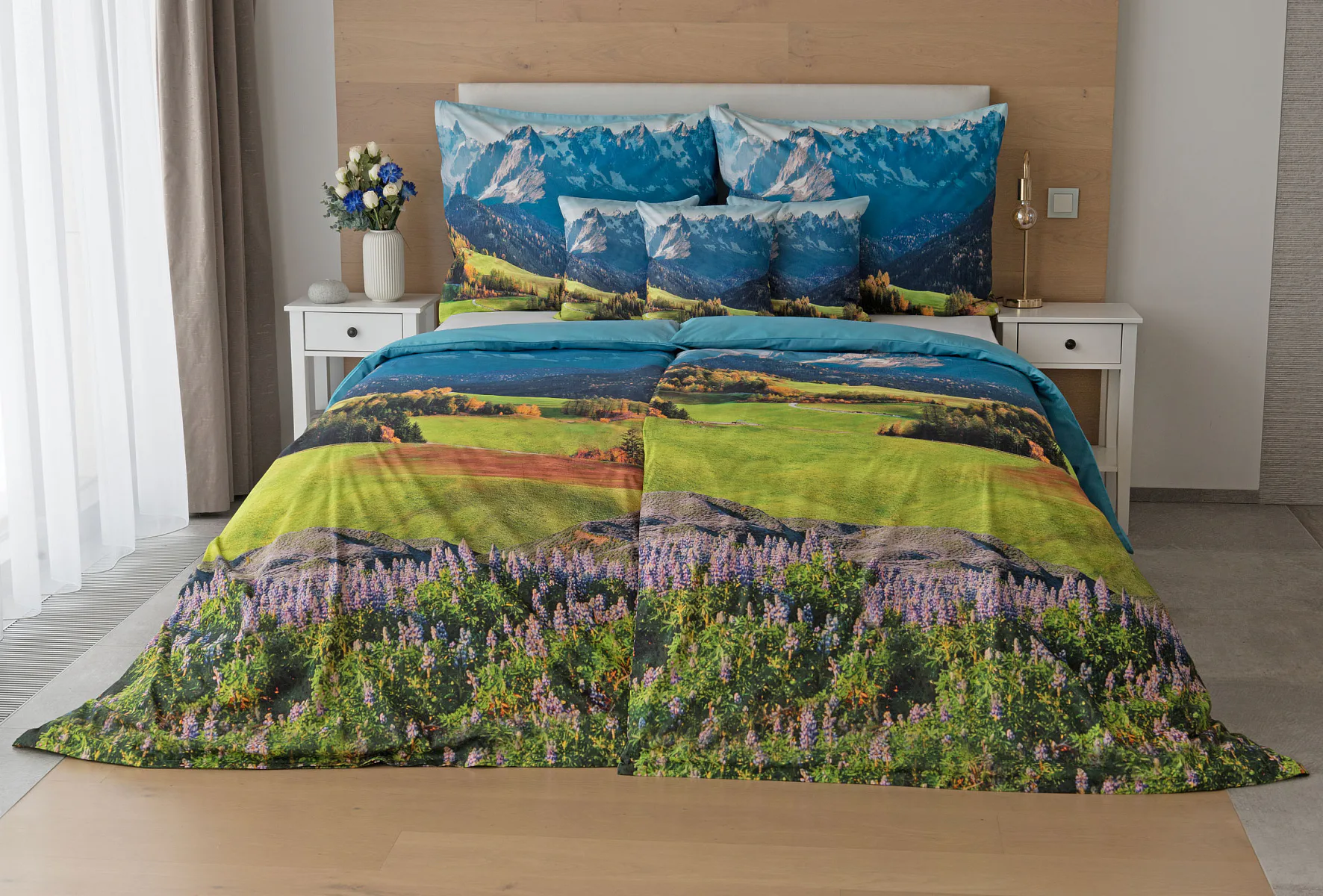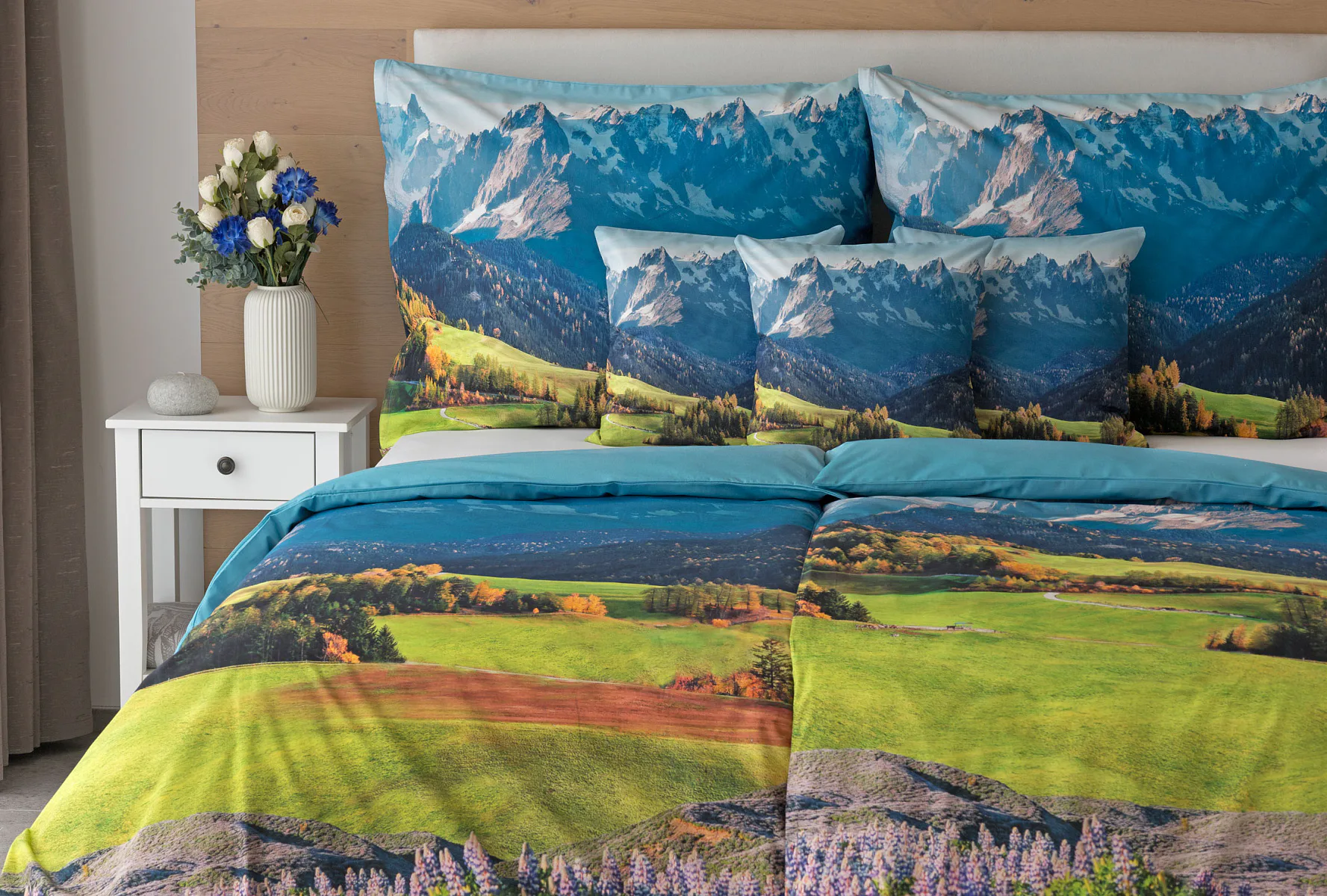 Ložní povlečení Hory s panoramatickým motivem horské krajiny vnese do vaší ložnice pocit svobody, klidu a propojení s přírodou. Rozkvetlé louky, zelené svahy a majestátní horské štíty vytvářejí harmonickou scenérii. Syté barvy a detailní tisk dodávají povlečení přirozený charakter, díky kterému se stane dominantou interiéru. Ideální volba pro milovníky přírody, hor a cestování. Dopřejte si každý večer pocit, jako byste usínali uprostřed rozkvetlé horské krajiny.