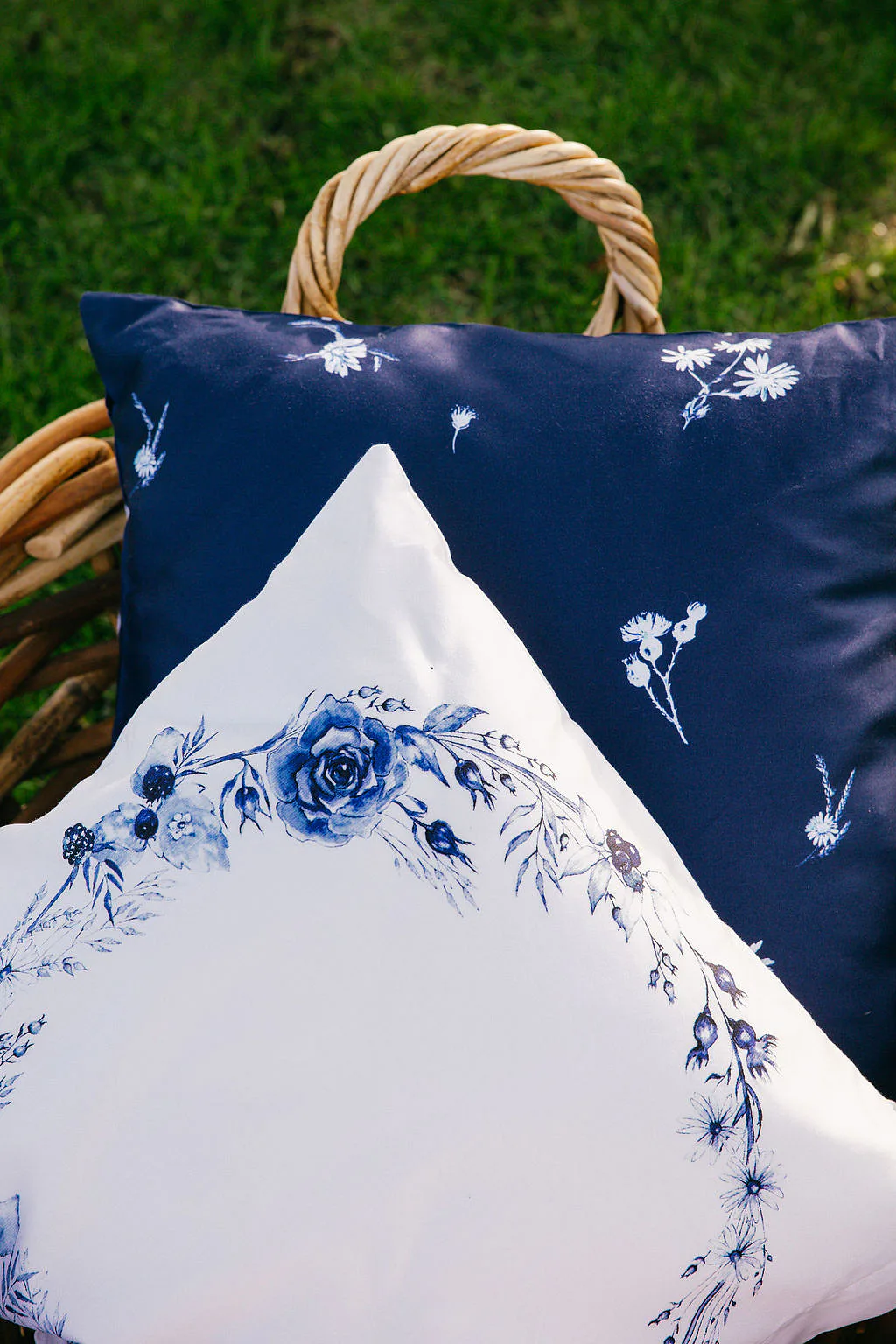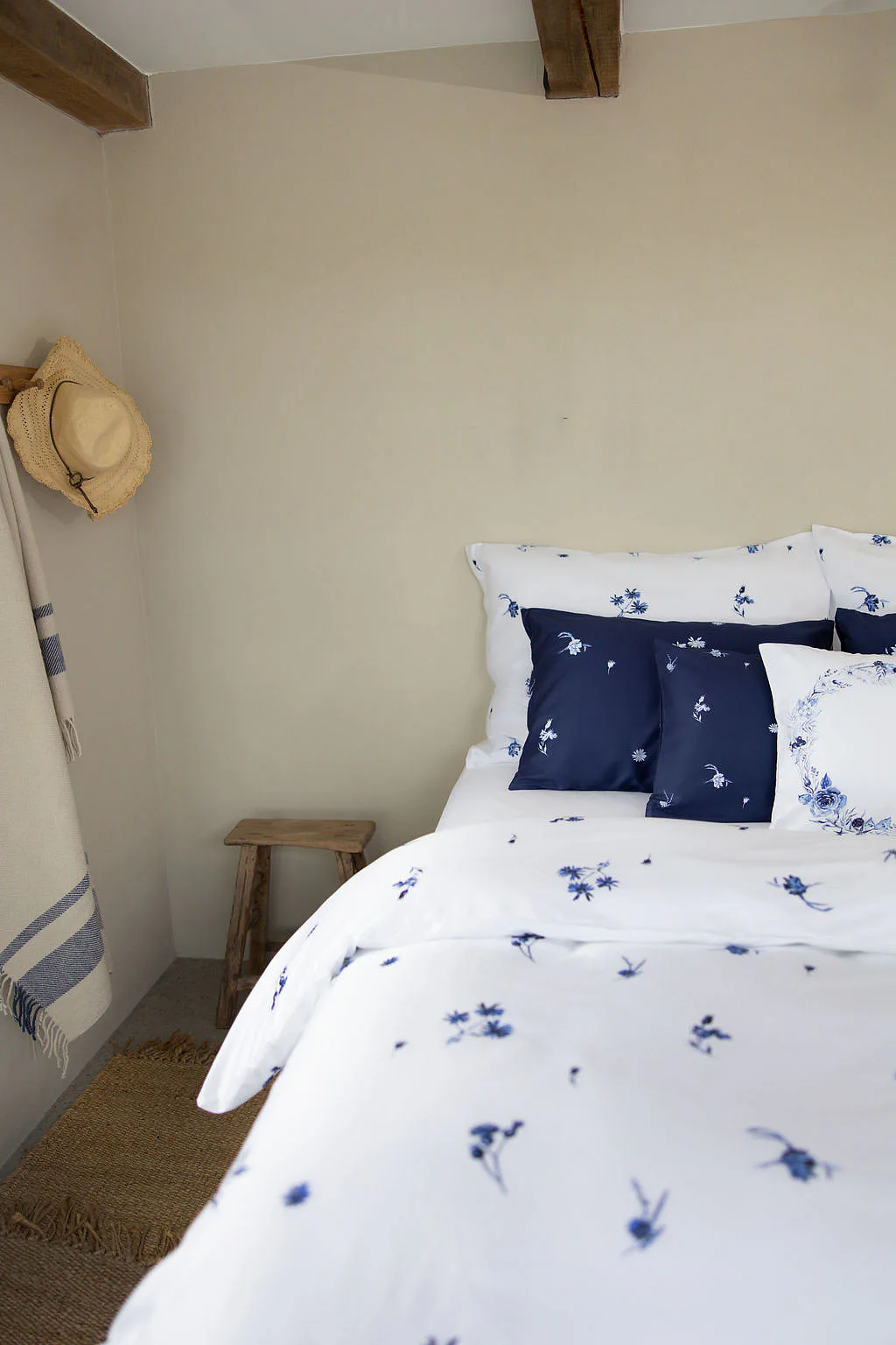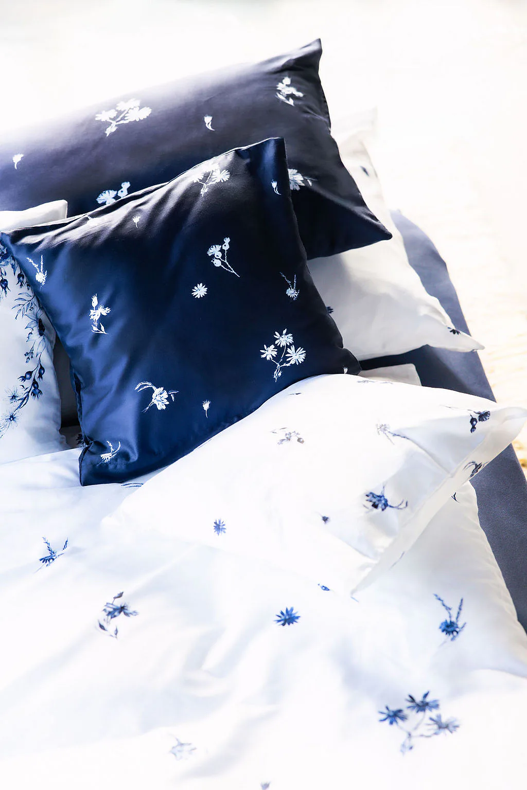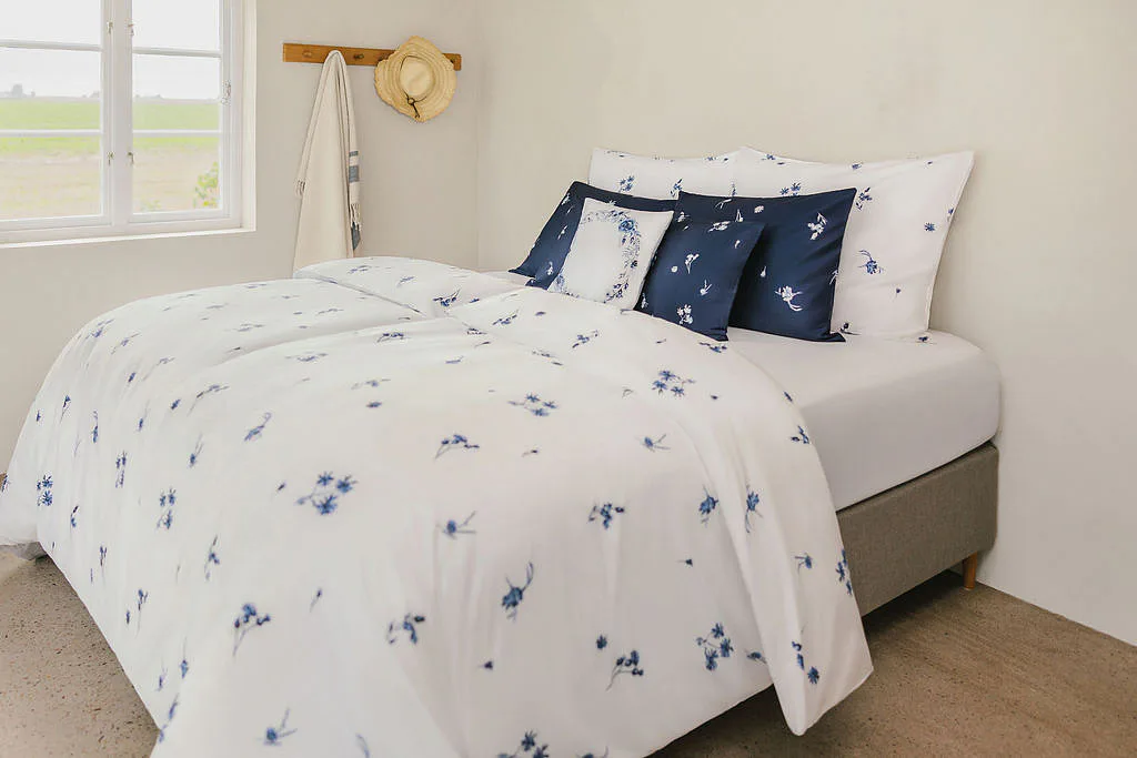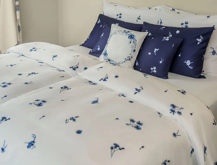 Perte naruby do 60 °C (bílé a modré povlaky zvlášť), sušte při nižší teplotě, žehlete po rubu.