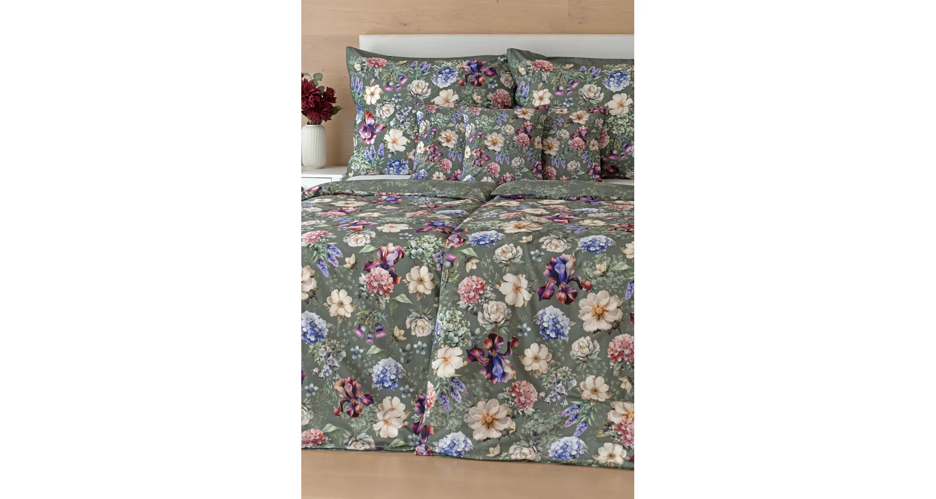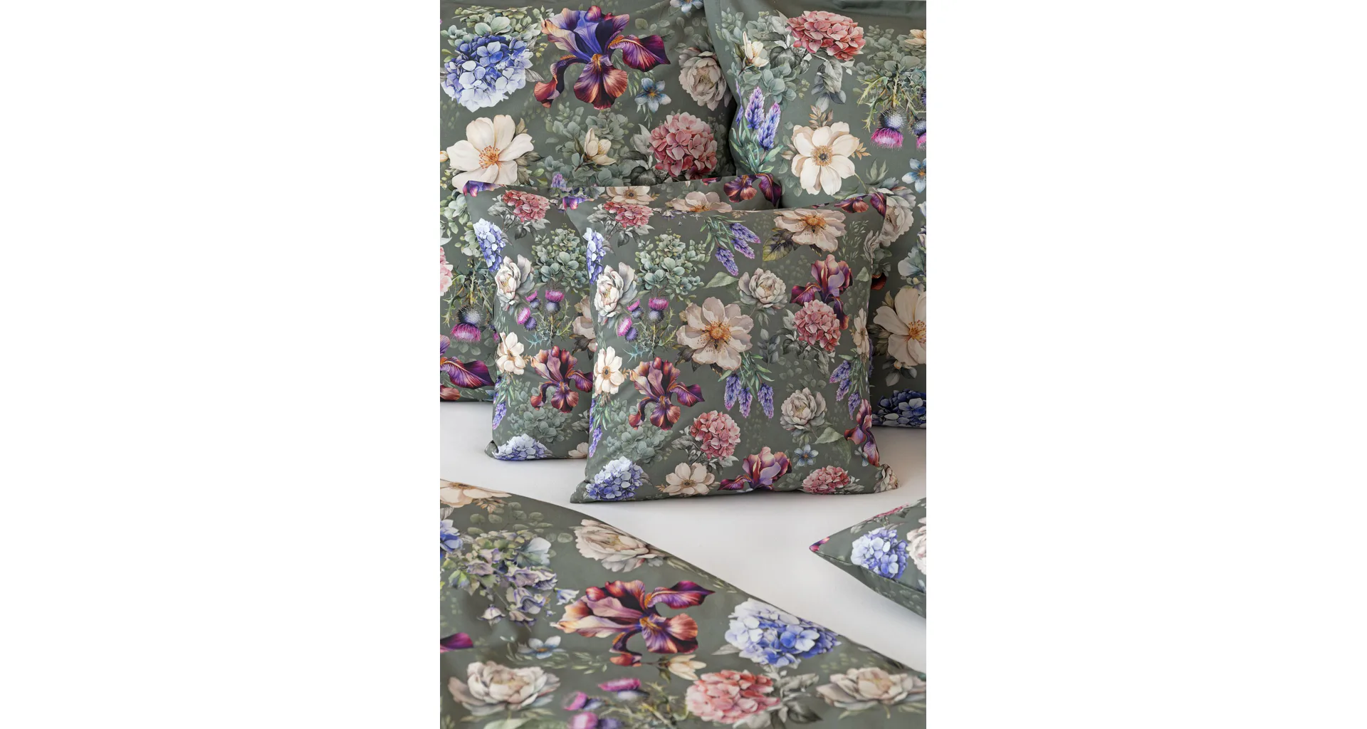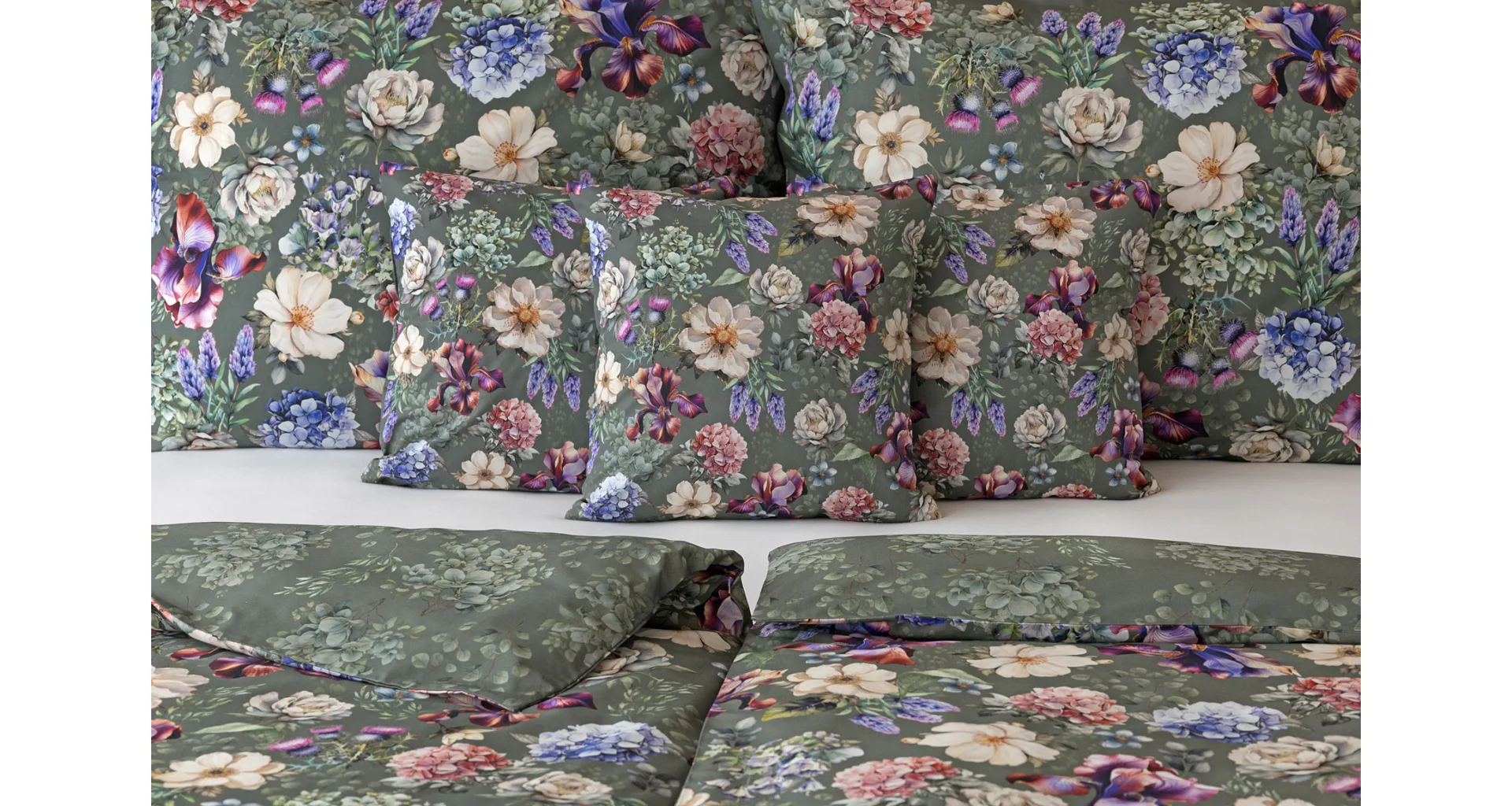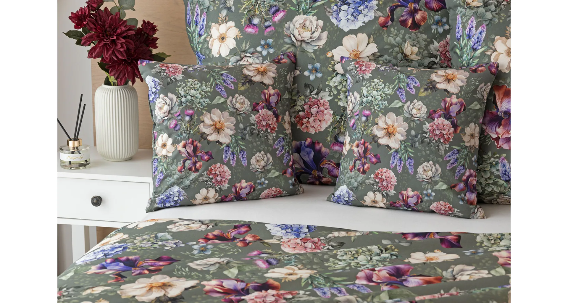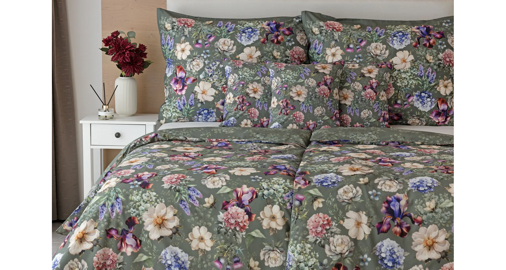 Pestrobarevnou květinovou symfonii rozehraje ve vaší ložnici bavlněné povlečení Jacqueline. Květy planých růží, hortenzií a kosatců se rozprostírají na zeleno-šedém podkladu. Vzor vyniká v precizním detailu tisku a díky oblíbenému oboustrannému provedení můžete při stlaní hravě experimentovat.