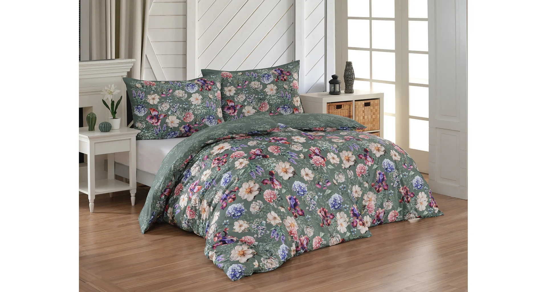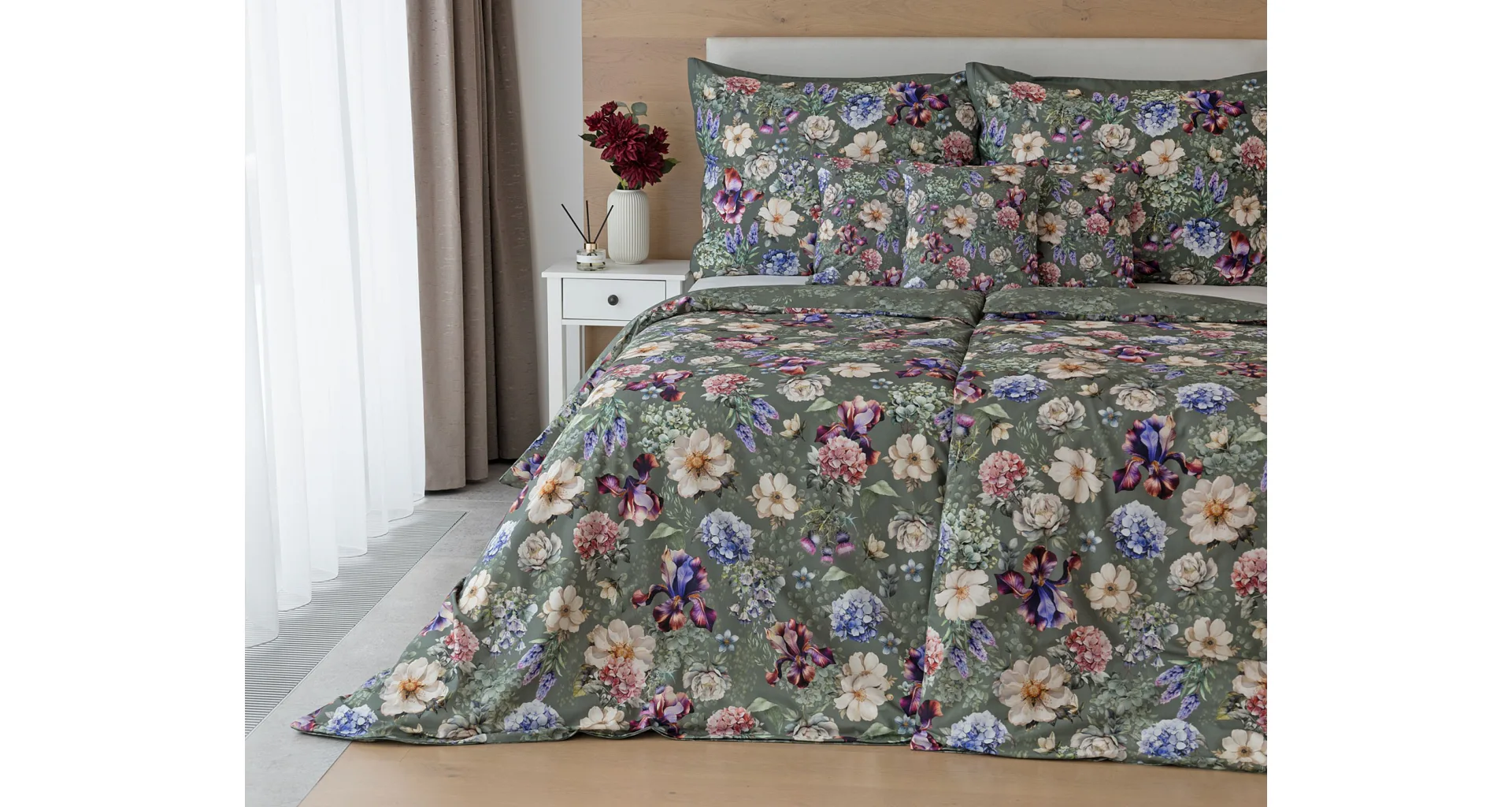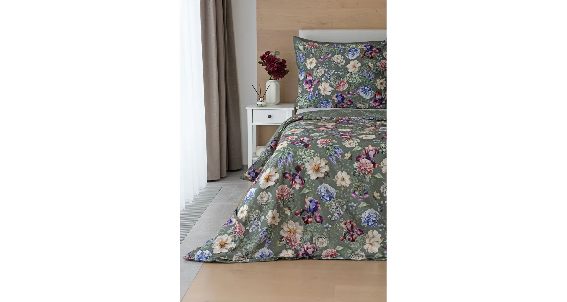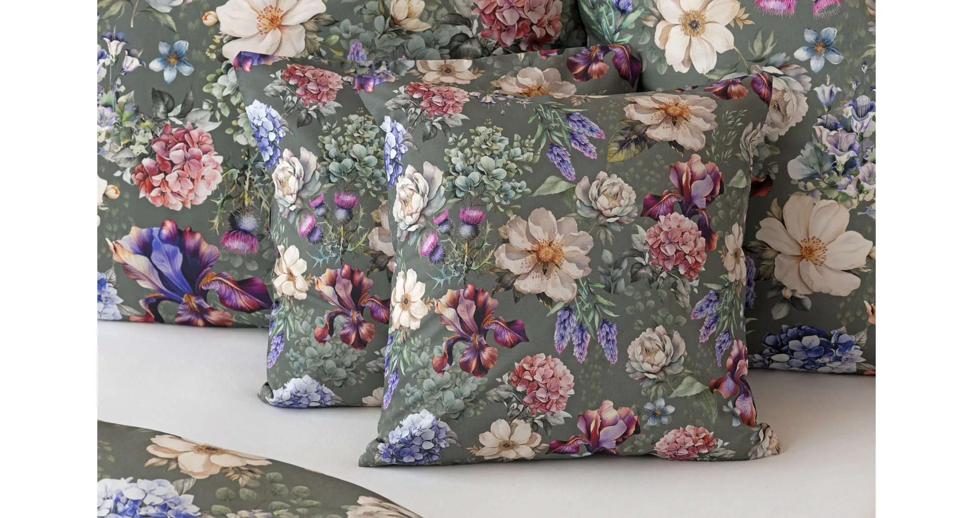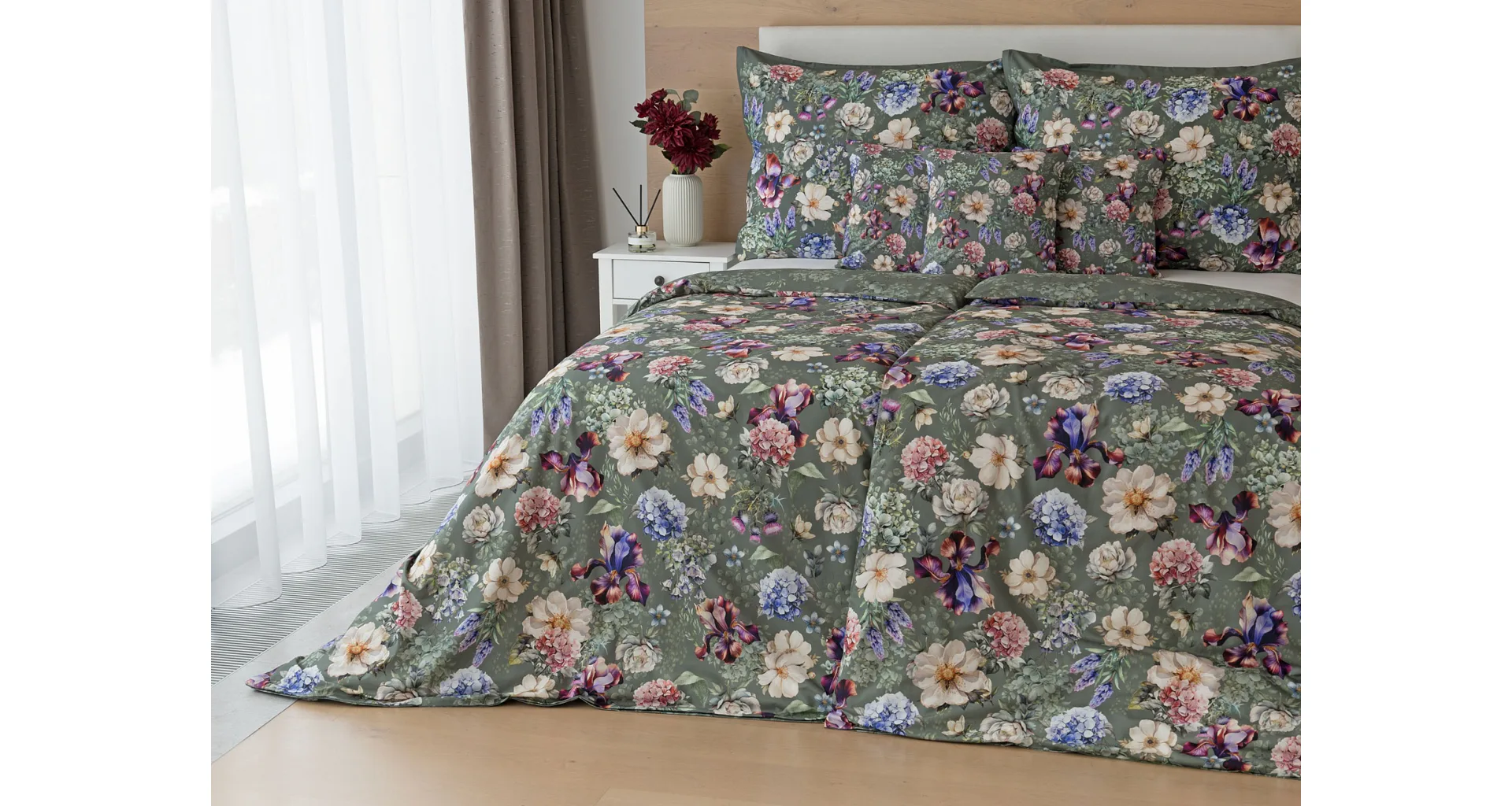 Pestrobarevnou květinovou symfonii rozehraje ve vaší ložnici bavlněné povlečení Jacqueline. Květy planých růží, hortenzií a kosatců se rozprostírají na zeleno-šedém podkladu. Vzor vyniká v precizním detailu tisku a díky oblíbenému oboustrannému provedení můžete při stlaní hravě experimentovat.