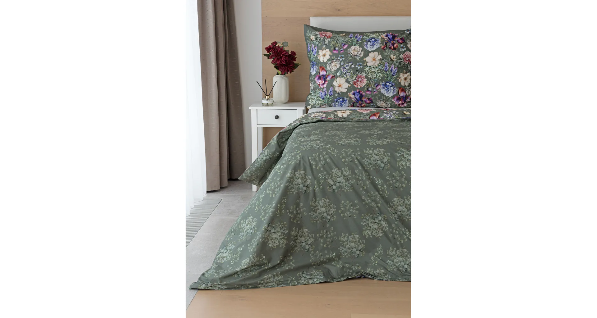 Povlak na polštář je z obou stran stejný, povlak na přikrývku zachycuje na spodní straně květinový motiv v paletě světle zelených tónů na zeleno-šedém podkladu. Povlečení je opatřeno komfortním zipovým uzávěrem