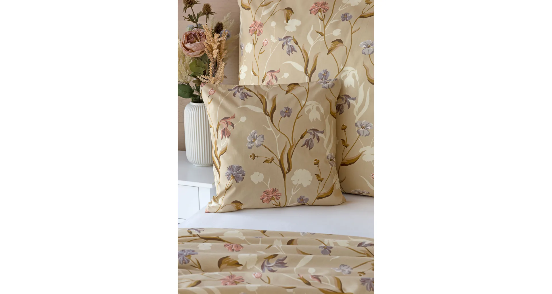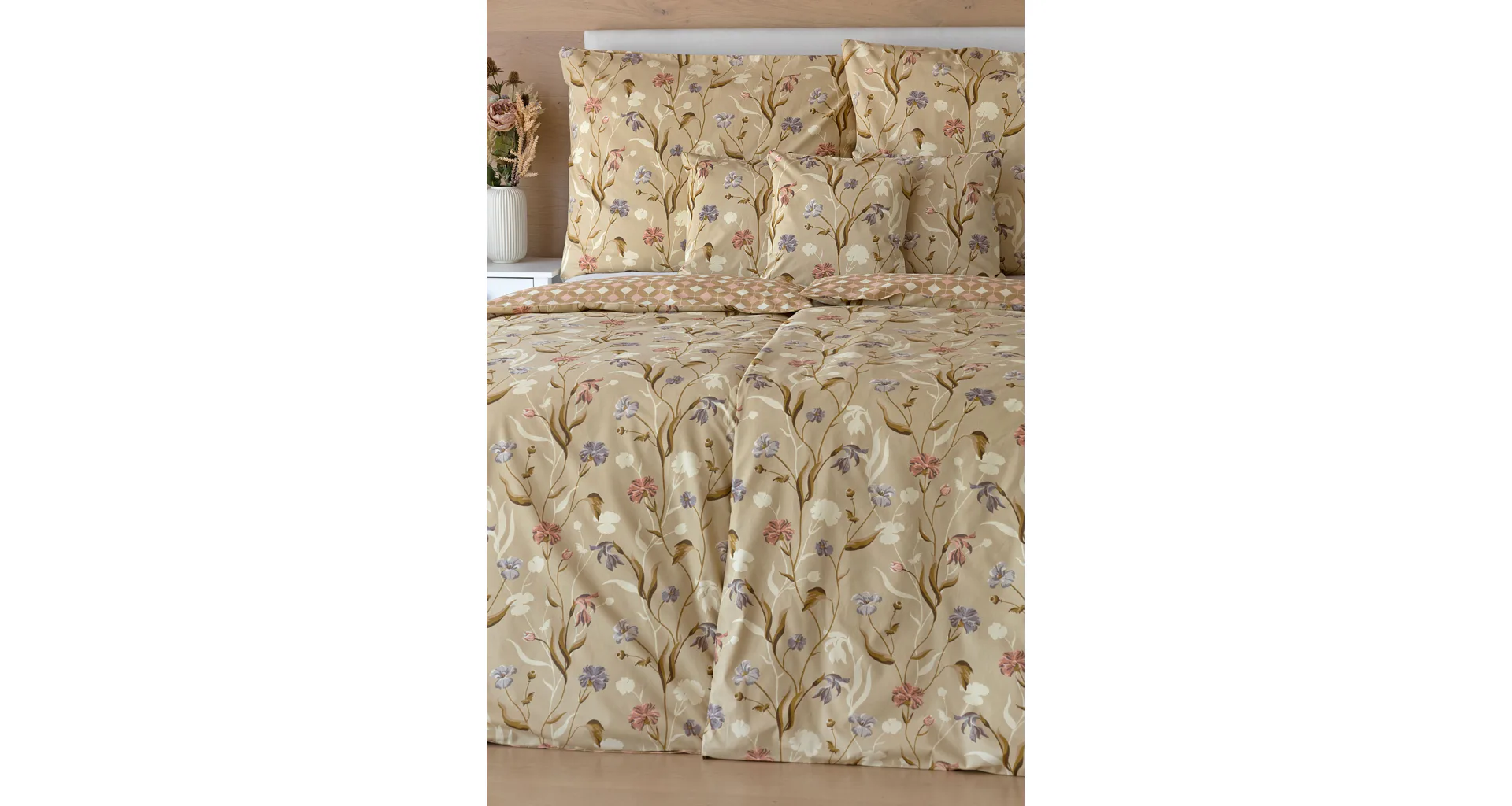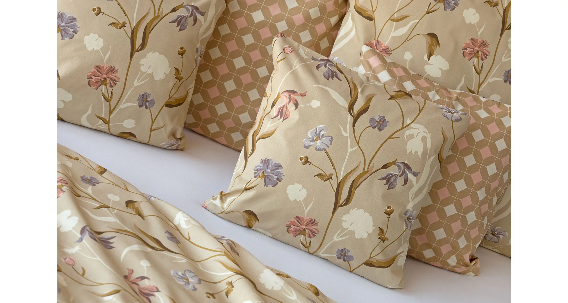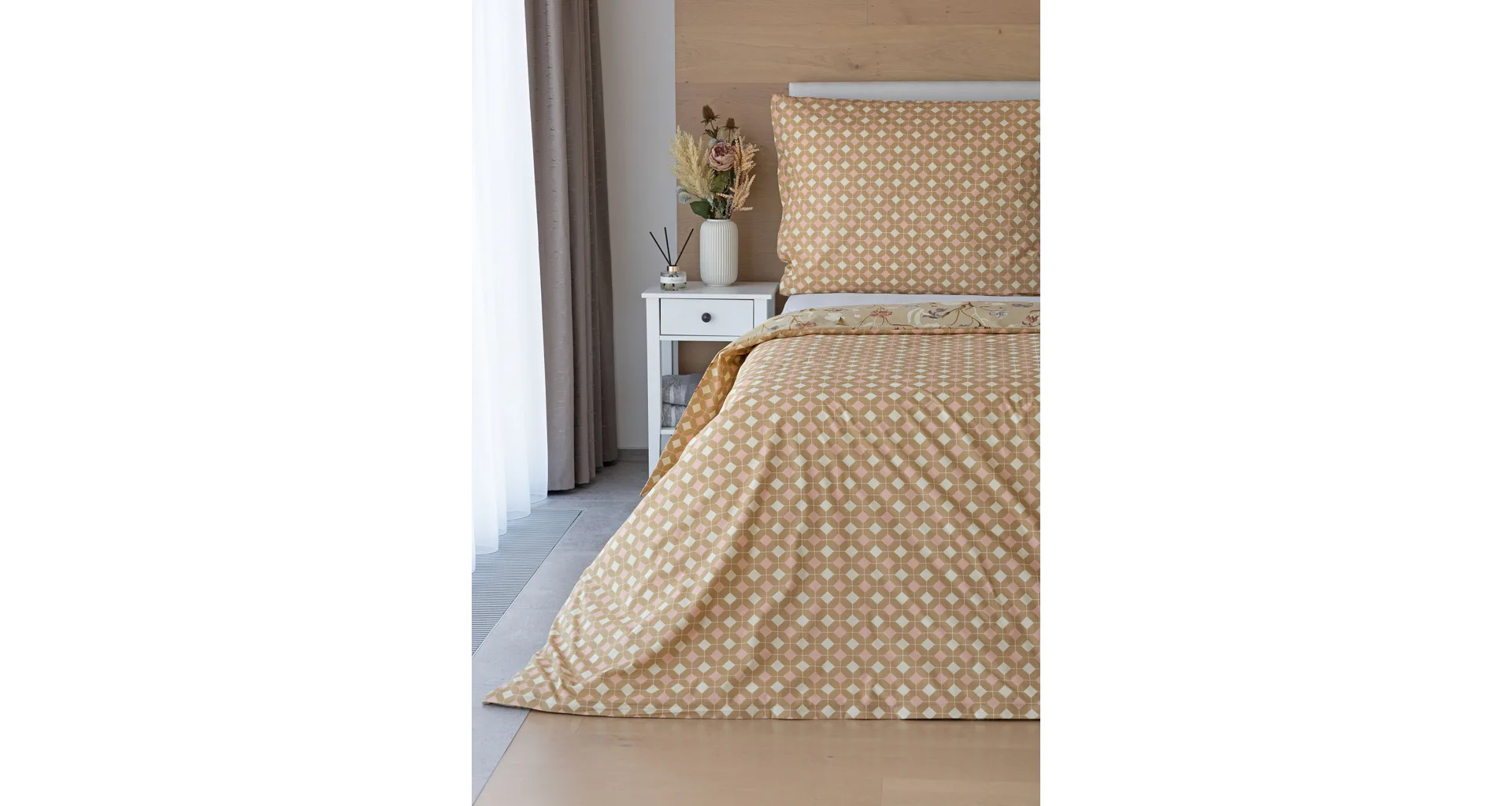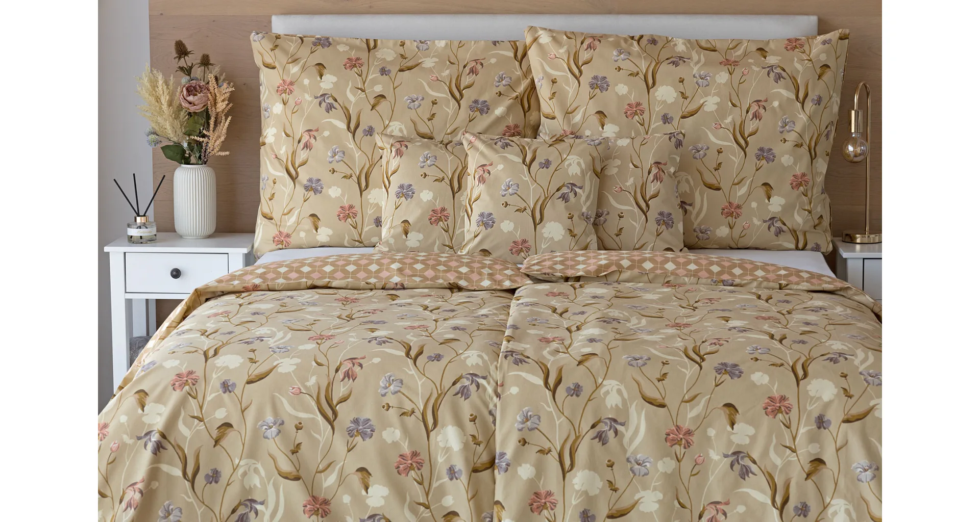 Bavlněné povlečení Joanna vás okouzlí hřejivými barvami a nápaditou kombinací vzorů. Květinový motiv z jedné strany tvoří drobné starorůžové a fialovo-modré kvítky na světle hnědém podkladu. Druhou stranu povlečení zdobí plošný geometrický vzor, takže při stlaní můžete hravě improvizovat.