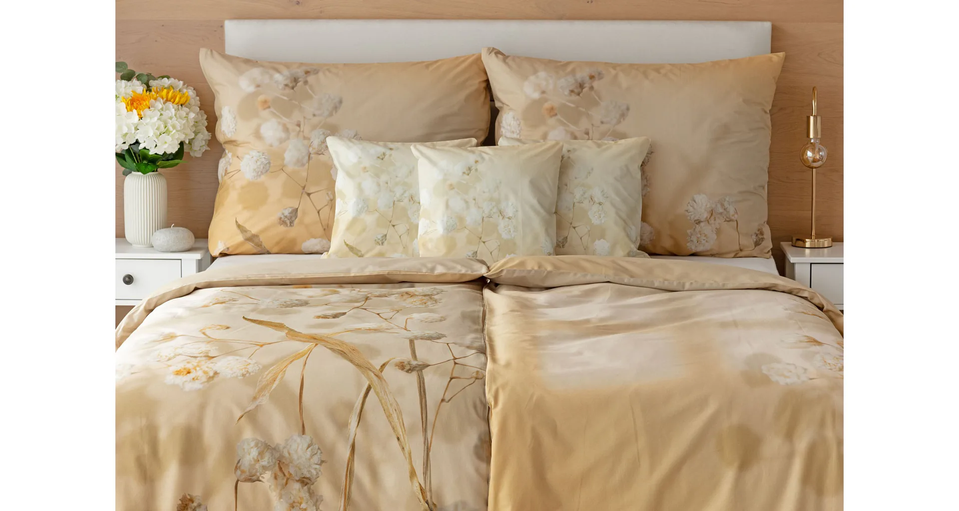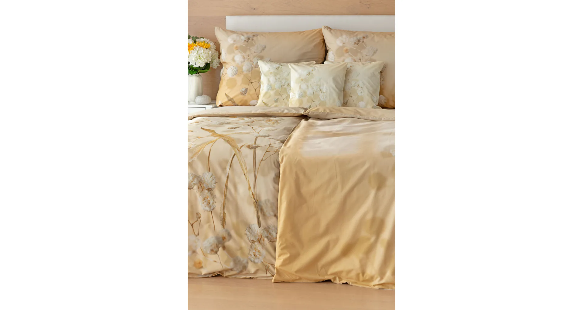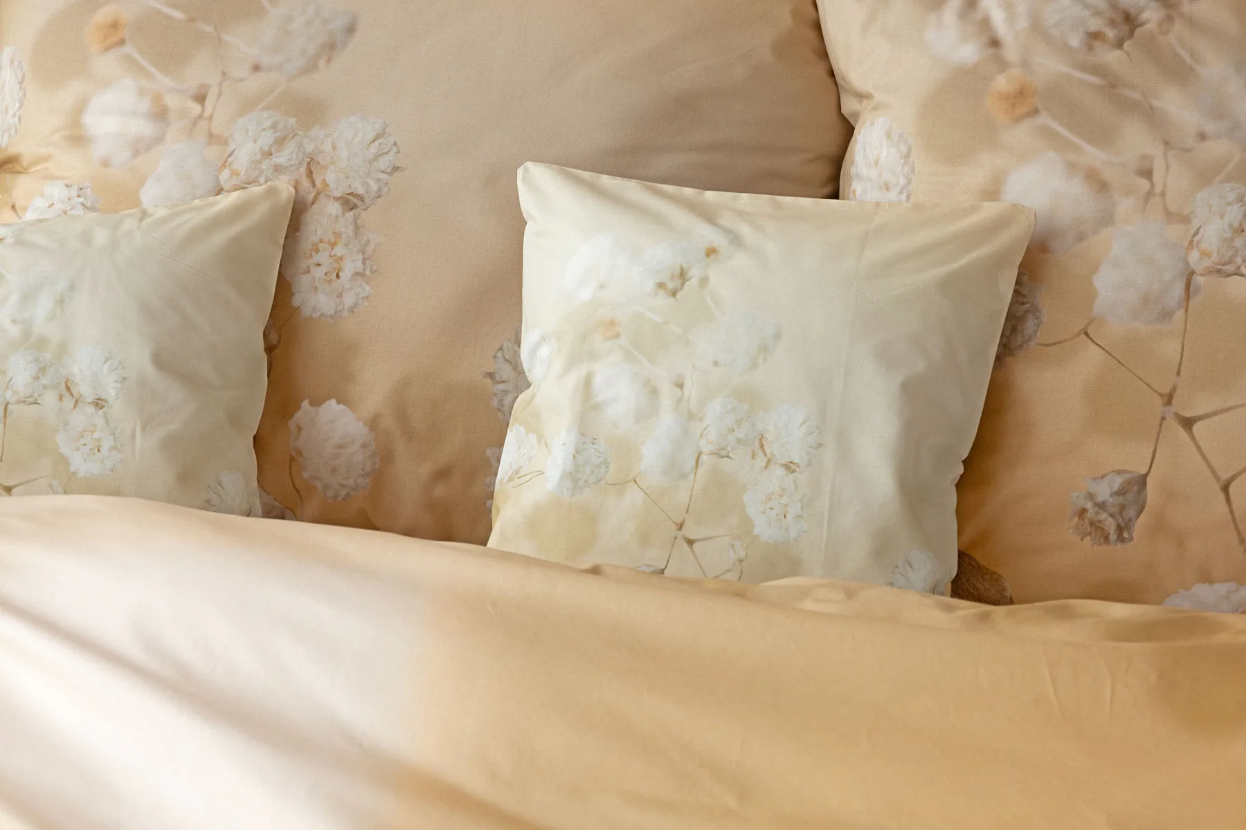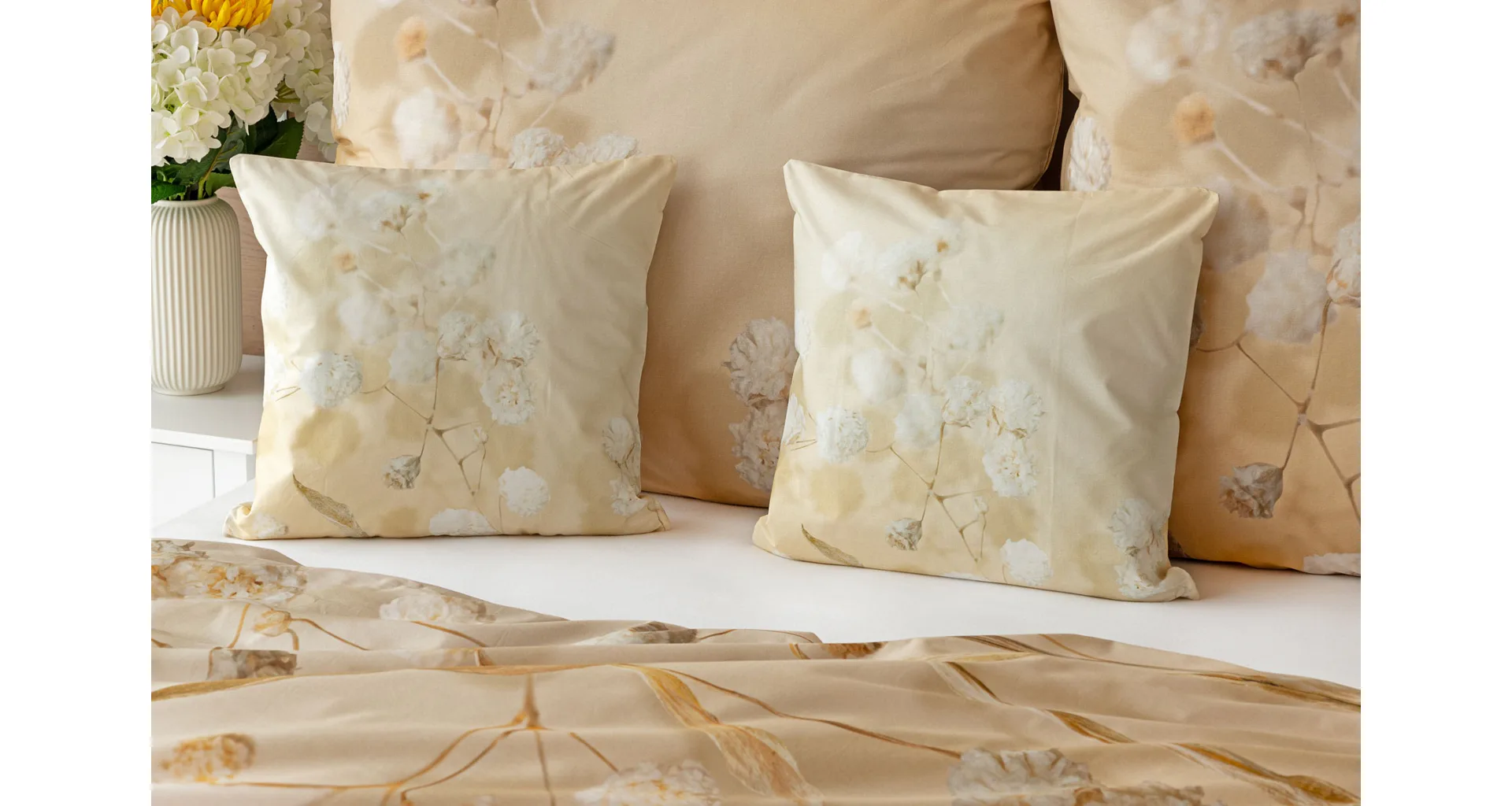 Luxusní bavlněné povlečení Julia úplně svádí k zachumlání. Něžný florální motiv v hřejivých krémových a béžových tónech se bude vyjímat v každém interiéru.