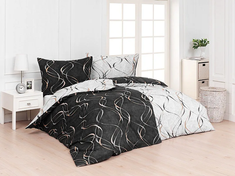 Vylaďte si ložnici podle nálady s elegantním bavlněným povlečením Kingston. Oblíbené oboustranné provedení vám umožní jednoduše změnit vzhled interiéru, aniž byste museli nutně převlékat. Jednoduchý motiv zvlněných šedozlatých linek se prolíná na černém a světle šedém podkladu. Originální vzhled vzoru podtrhuje tzv. Grunge textura, která vyniká díky preciznímu digitálnímu tisku
