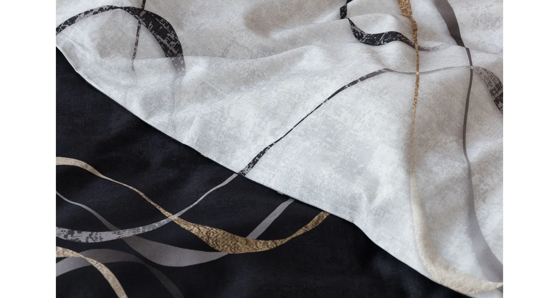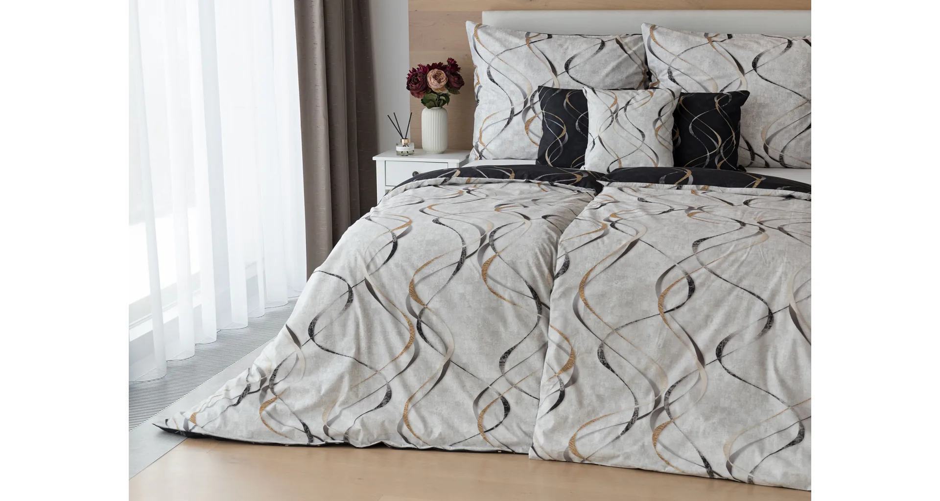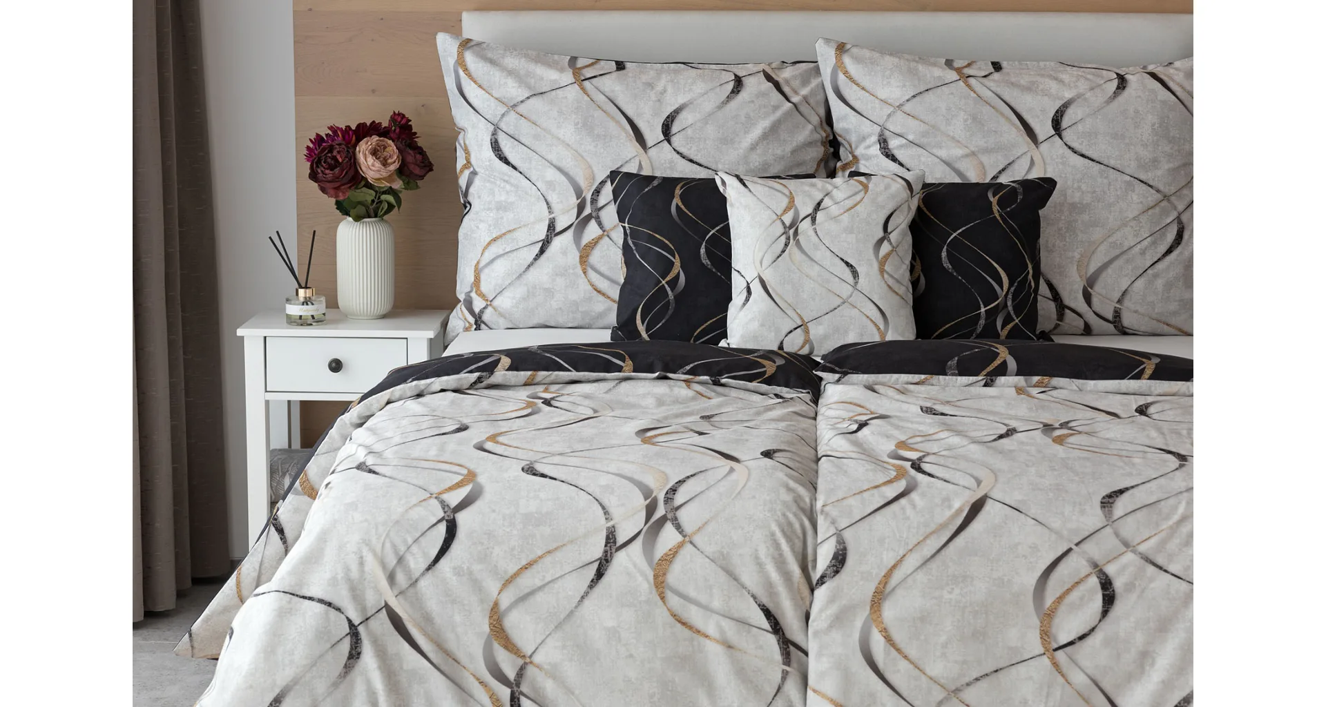 Vylaďte si ložnici podle nálady s elegantním bavlněným povlečením Kingston. Oblíbené oboustranné provedení vám umožní jednoduše změnit vzhled interiéru, aniž byste museli nutně převlékat. Jednoduchý motiv zvlněných šedozlatých linek se prolíná na černém a světle šedém podkladu. Originální vzhled vzoru podtrhuje tzv. Grunge textura, která vyniká díky preciznímu digitálnímu tisku