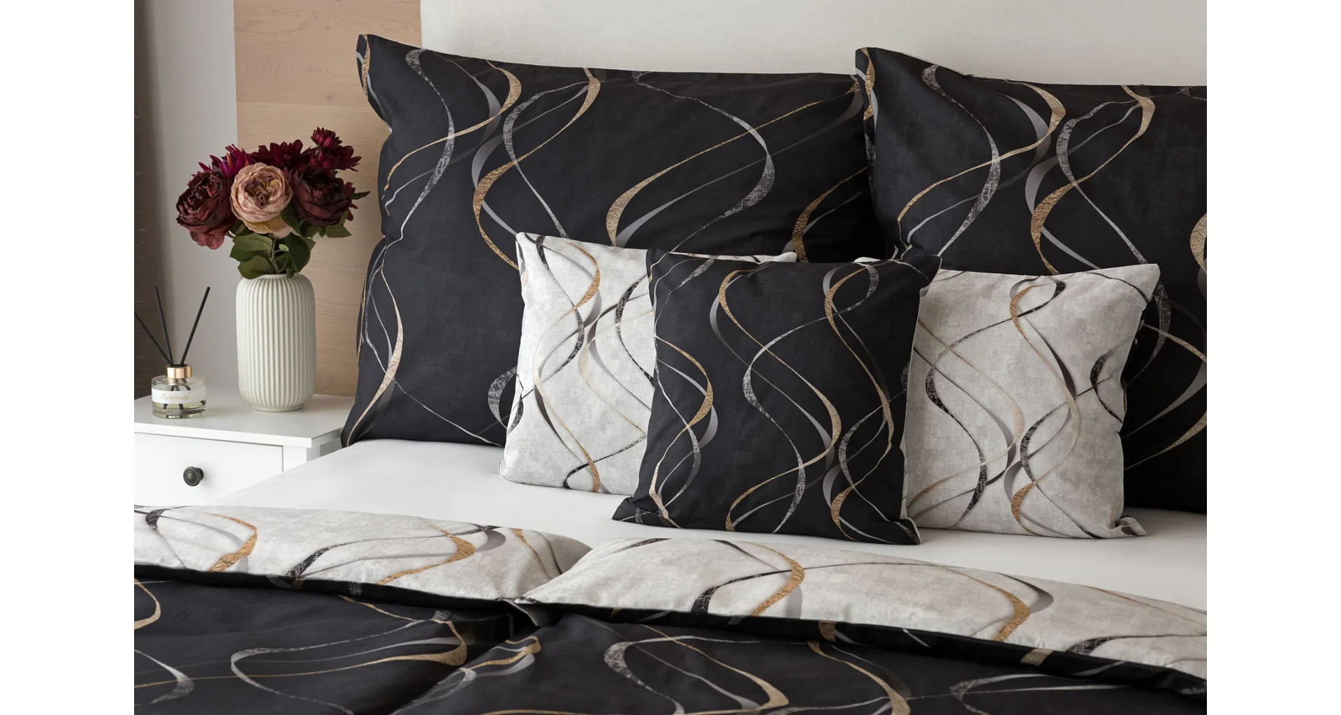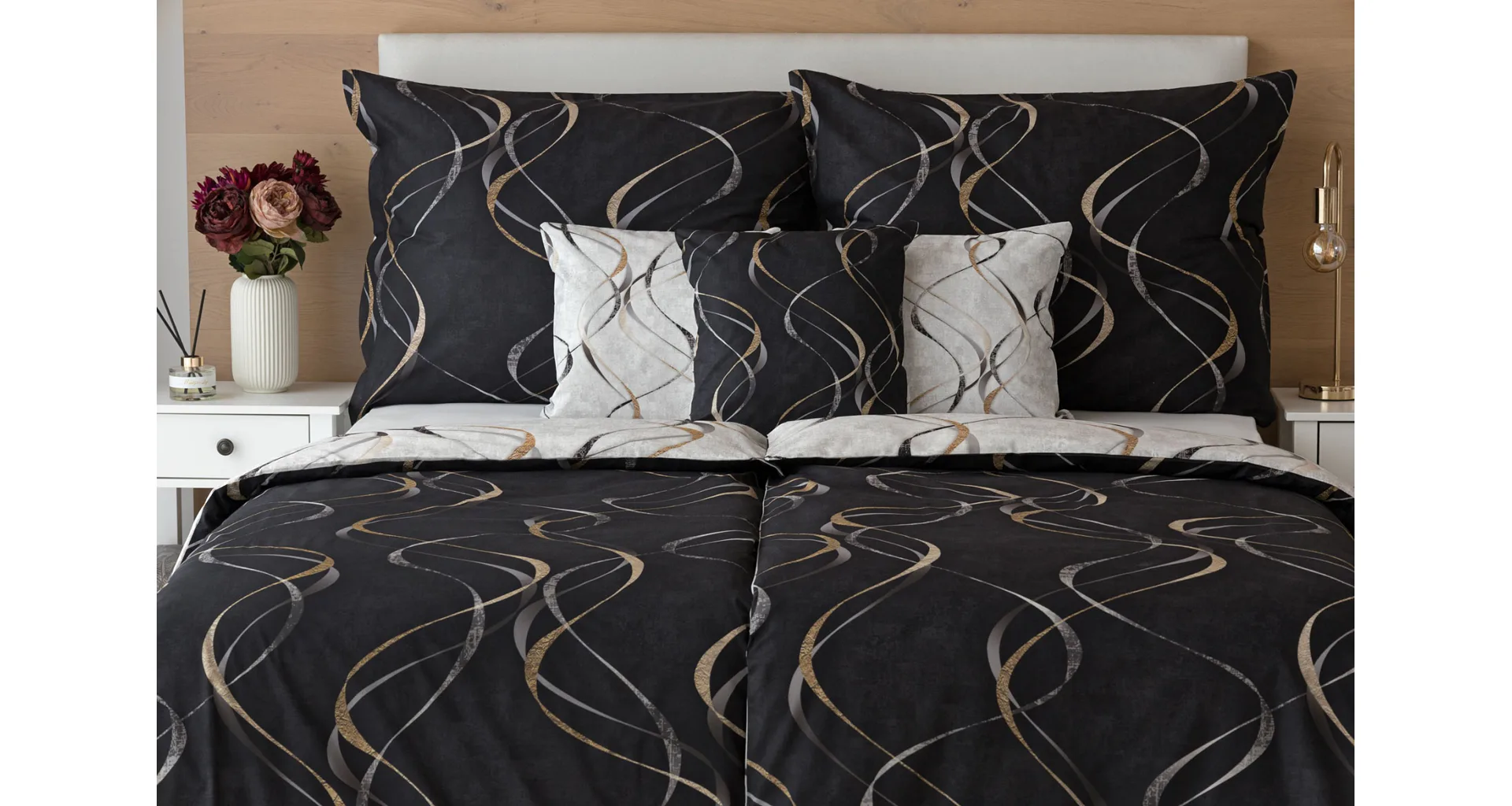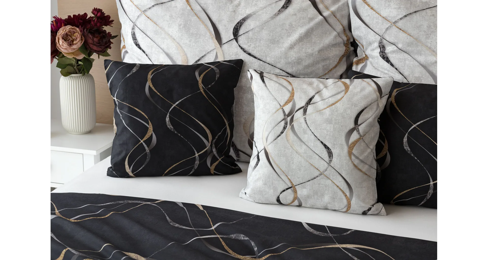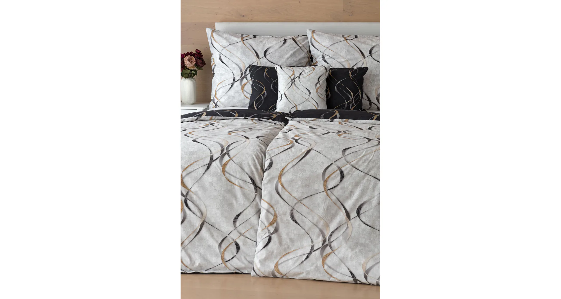Vylaďte si ložnici podle nálady s elegantním bavlněným povlečením Kingston. Oblíbené oboustranné provedení vám umožní jednoduše změnit vzhled interiéru, aniž byste museli nutně převlékat. Jednoduchý motiv zvlněných šedozlatých linek se prolíná na černém a světle šedém podkladu. Originální vzhled vzoru podtrhuje tzv. Grunge textura, která vyniká díky preciznímu digitálnímu tisku