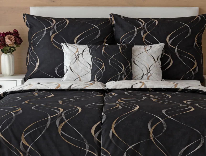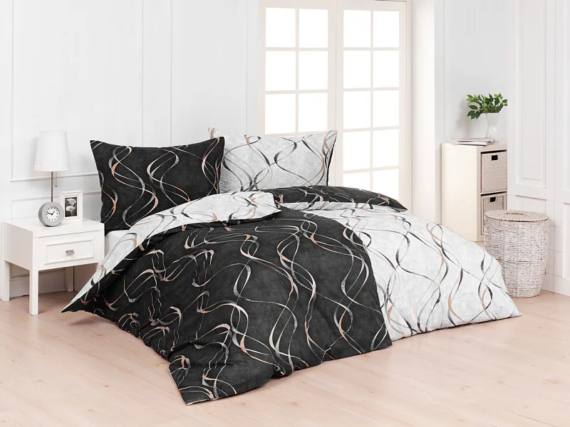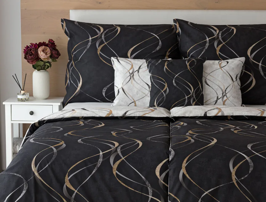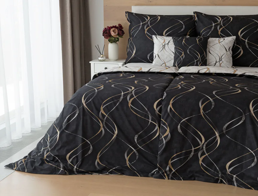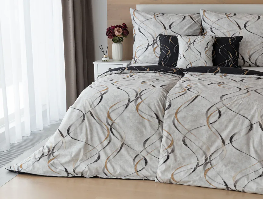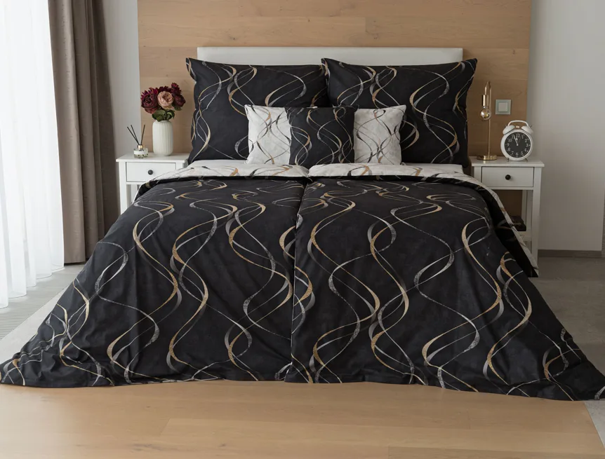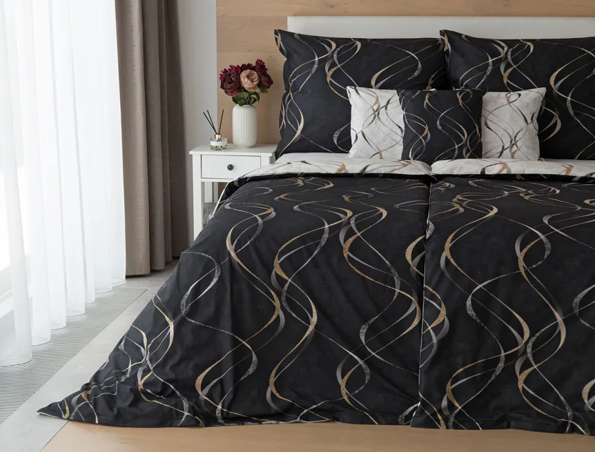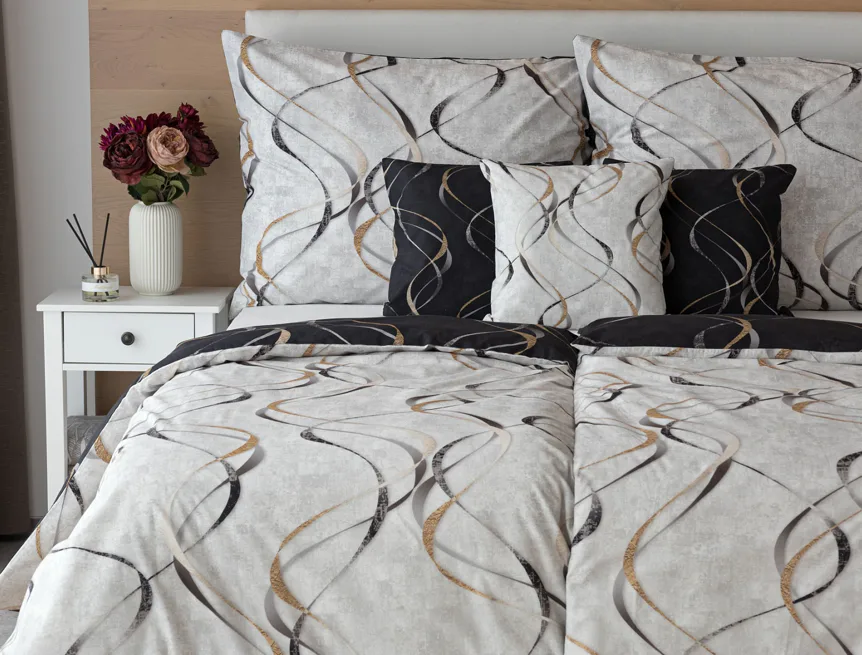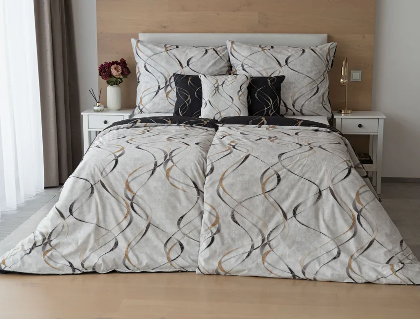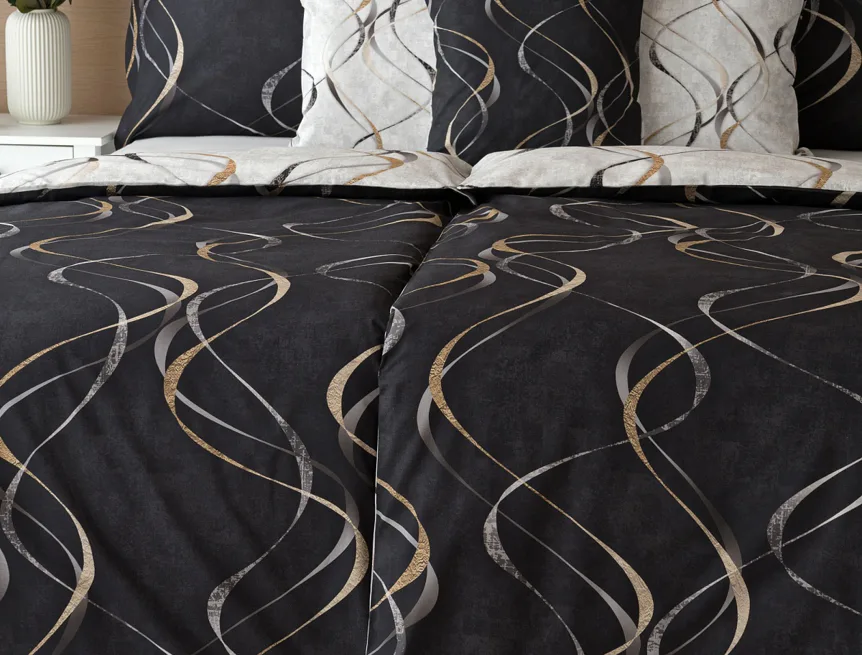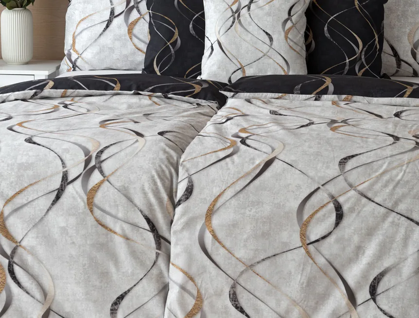 Vylaďte si ložnici podle nálady s elegantním bavlněným povlečením Kingston. Oblíbené oboustranné provedení vám umožní jednoduše změnit vzhled interiéru, aniž byste museli nutně převlékat. Jednoduchý motiv zvlněných šedozlatých linek se prolíná na černém a světle šedém podkladu. Originální vzhled vzoru podtrhuje tzv. Grunge textura, která vyniká díky preciznímu digitálnímu tisku